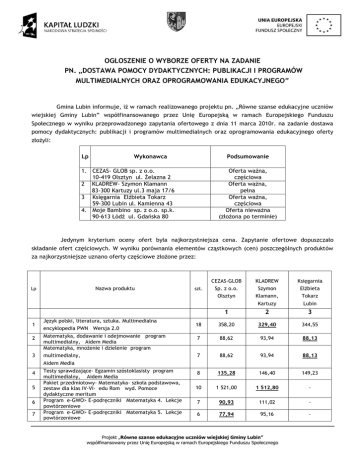 OGŁOSZENIE O WYBORZE OFERTY NA ZADANIE PN. „DOSTAWA POMOCY DYDAKTYCZNYCH: PUBLIKACJI I PROGRAMÓW MULTIMEDIALNYCH ORAZ OPROGRAMOWANIA EDUKACYJNEGO” Gmina Lubin informuje, iż w ramach realizowanego projektu pn. „Równe szanse edukacyjne uczniów wiejskiej Gminy Lubin” współfinansowanego przez Unię Europejską w ramach Europejskiego Funduszu Społecznego w wyniku przeprowadzonego zapytania ofertowego z dnia 11 marca 2010r. na zadanie dostawa pomocy dydaktycznych: publikacji i programów multimedialnych oraz oprogramowania edukacyjnego oferty złożyli: Lp Wykonawca Podsumowanie 1. CEZAS- GLOB sp. z o.o. 10-419 Olsztyn ul. Żelazna 2 2 KLADREW- Szymon Klamann 83-300 Kartuzy ul.3 maja 17/6 3 Księgarnia Elżbieta Tokarz 59-300 Lubin ul. Kamienna 43 4. Moje Bambino sp. z o.o. sp.k. 90-613 Łódź ul. Gdańska 80 Oferta ważna, częściowa Oferta ważna, pełna Oferta ważna, częściowa Oferta nieważna (złożona po terminie) Jedynym kryterium oceny ofert była najkorzystniejsza cena. Zapytanie ofertowe dopuszczało składanie ofert częściowych. W wyniku porównania elementów cząstkowych (cen) poszczególnych produktów za najkorzystniejsze uznano oferty częściowe złożone przez: CEZAS-GLOB Nazwa produktu Lp 1 Język polski, literatura, sztuka. Multimedialna encyklopedia PWN Wersja 2.0 KLADREW Księgarnia Sp. z o.o. Szymon Elżbieta Olsztyn Klamann, Tokarz Kartuzy Lubin 1 2 3 18 358,20 329,40 344,55 szt. 2 Matematyka, dodawanie i odejmowanie program multimedialny, Aidem Media Matematyka, mnożenie i dzielenie program 7 88,62 93,94 88,13 3 multimedialny, 7 88,62 93,94 88,13 8 135,28 146,40 149,23 10 1 521,00 1 512,80 - 7 90,93 111,02 - 6 77,94 95,16 - Aidem Media 4 5 6 7 Testy sprawdzające- Egzamin szóstoklasisty program multimedialny, Aidem Media Pakiet przedmiotowy- Matematyka- szkoła podstawowa, zestaw dla klas IV-VI- edu Rom wyd. Pomoce dydaktyczne meritum Program e-GWO> E-podręczniki Matematyka 4. Lekcje powtórzeniowe Program e-GWO> E-podręczniki Matematyka 5. Lekcje powtórzeniowe Projekt „Równe szanse edukacyjne uczniów wiejskiej Gminy Lubin” współfinansowany przez Unię Europejską w ramach Europejskiego Funduszu Społecznego 8 9 10 11 12 13 Program e-GWO> E-podręczniki Matematyka 6. Lekcje powtórzeniowe Berti: Język niemiecki dla dzieci Liczę z Reksiem, Aidem Media Koziołek Matołek wynalazca, 30 11 Bolek i Lolek: alfabet i nauka czytania, Aidem Media Koziołek Matołek idzie do szkoły, 8 Aidem Media Aidem Media 2 5 5 103,92 597,00 186,01 50,84 84,55 84,55 126,88 - 622,20 - 201,30 185,20 53,68 50,58 91,50 93,27 91,50 93,27 14 Klik uczy czytać 5 249,50 170,80 - 15 Klik uczy liczyć 5 249,50 170,80 - 16 Pakiet do nauki matematyki 4 - 58,56 - 17 ABC z Reksiem 9 152,19 164,70 167,88 18 10 179,00 195,20 - 19 Ćwiczenia dla klasy 2 i 3, multimedialny program edukacyjny (7-10), wyd. Edugrajka Program edukacyjny Wesołe miasteczko, eduROM 5 310,50 311,10 - 20 Program edukacyjny ZOO, 5 310,50 311,10 - 21 Program edukacyjny Wyspa skarbów, 5 310,50 311,10 - wyd. Kropka eduROM eduROM Najkorzystniejszą cenowo ofertę w pozycjach: nr: 4,6,7,8,9,12,13,17,18,19,20,21 wybrano ofertę CEZAS- GLOB sp. z o.o., 10-419 Olsztyn, ul. Żelazna 2 na łączną wartość brutto 2 436,86 PLN (słownie: dwa tysiące czterysta trzydzieści sześć 86/100) nr: 1,5,14,15,16 wybrano ofertę KLADREW- Szymon Klamann, 83-300 Kartuzy, ul.3 maja 17/6 na łączną wartość brutto 2 242,36 PLN (słownie: dwa tysiące dwieście czterdzieści dwa zł 36/100) nr: 2,3,10,11 wybrano ofertę Księgarnia Elżbieta Tokarz, 59-300 Lubin, ul. Kamienna 43a na łączną wartość brutto 412,04 PLN (słownie: czterysta dwanaście 04/100) Przedmiotowa dostawa nie podlega ustawie z dnia 29 stycznia 2004r. Prawo zamówień publicznych (Dz. U. z 2007r., Nr 223, poz. 1655)- art.4 pkt.8 Lubin, dnia 26 marca 2010r. Projekt „Równe szanse edukacyjne uczniów wiejskiej Gminy Lubin” współfinansowany przez Unię Europejską w ramach Europejskiego Funduszu Społecznego