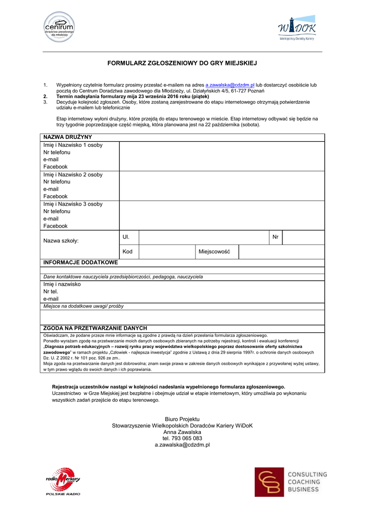 FORMULARZ ZGŁOSZENIOWY DO GRY MIEJSKIEJ 1. 2. 3. Wypełniony czytelnie formularz prosimy przesłać e-mailem na adres [email protected] lub dostarczyć osobiście lub pocztą do Centrum Doradztwa zawodowego dla Młodzieży, ul. Działyńskich 4/5, 61-727 Poznań Termin nadsyłania formularzy mija 23 września 2016 roku (piątek) Decyduje kolejność zgłoszeń. Osoby, które zostaną zarejestrowane do etapu internetowego otrzymają potwierdzenie udziału e-mailem lub telefonicznie Etap internetowy wyłoni drużyny, które przejdą do etapu terenowego w mieście. Etap internetowy odbywać się będzie na trzy tygodnie poprzedzające część miejską, która planowana jest na 22 października (sobota). NAZWA DRUŻYNY Imię i Nazwisko 1 osoby Nr telefonu e-mail Facebook Imię i Nazwisko 2 osoby Nr telefonu e-mail Facebook Imię i Nazwisko 3 osoby Nr telefonu e-mail Facebook Ul. Nazwa szkoły: Kod Nr Miejscowość INFORMACJE DODATKOWE Dane kontaktowe nauczyciela przedsiębiorczości, pedagoga, nauczyciela Imię i nazwisko Nr tel. e-mail Miejsce na dodatkowe uwagi/ prośby ZGODA NA PRZETWARZANIE DANYCH Oświadczam, że podane przeze mnie informacje są zgodne z prawdą na dzień przesłania formularza zgłoszeniowego. Ponadto wyrażam zgodę na przetwarzanie moich danych osobowych zbieranych na potrzeby rejestracji, kontroli i ewaluacji konferencji „Diagnoza potrzeb edukacyjnych – rozwój rynku pracy województwa wielkopolskiego poprzez dostosowanie oferty szkolnictwa zawodowego” w ramach projektu „Człowiek - najlepsza inwestycja” zgodnie z Ustawą z dnia 29 sierpnia 1997r. o ochronie danych osobowych Dz. U. Z 2002 r. Nr 101 poz. 926 ze zm.. Moja zgoda na przetwarzanie danych jest dobrowolna; znam swoje prawa w zakresie danych osobowych wynikające z przywołanej wyżej ustawy, w tym prawo wglądu do swoich danych i ich poprawiania. Rejestracja uczestników nastąpi w kolejności nadesłania wypełnionego formularza zgłoszeniowego. Uczestnictwo w Grze Miejskiej jest bezpłatne i obejmuje udział w etapie internetowym, który umożliwia po wykonaniu wszystkich zadań przejście do etapu terenowego. Biuro Projektu Stowarzyszenie Wielkopolskich Doradców Kariery WiDoK Anna Zawalska tel. 793 065 083 [email protected]