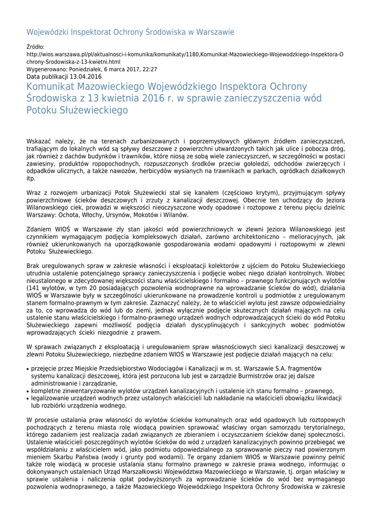 Wojewódzki Inspektorat Ochrony Środowiska w Warszawie Źródło: http://wios.warszawa.pl/pl/aktualnosci-i-komunika/komunikaty/1180,Komunikat-Mazowieckiego-Wojewodzkiego-Inspektora-O chrony-Srodowiska-z-13-kwietni.html Wygenerowano: Poniedziałek, 6 marca 2017, 22:27 Data publikacji 13.04.2016 Komunikat Mazowieckiego Wojewódzkiego Inspektora Ochrony Środowiska z 13 kwietnia 2016 r. w sprawie zanieczyszczenia wód Potoku Służewieckiego Wskazać należy, że na terenach zurbanizowanych i poprzemysłowych głównym źródłem zanieczyszczeń, trafiającym do lokalnych wód są spływy deszczowe z powierzchni utwardzonych takich jak ulice i pobocza dróg, jak również z dachów budynków i trawników, które niosą ze sobą wiele zanieczyszczeń, w szczególności w postaci zawiesiny, produktów ropopochodnych, rozpuszczonych środków przeciw gołoledzi, odchodów zwierzęcych i odpadków ulicznych, a także nawozów, herbicydów wysianych na trawnikach w parkach, ogródkach działkowych itp. Wraz z rozwojem urbanizacji Potok Służewiecki stał się kanałem (częściowo krytym), przyjmującym spływy powierzchniowe ścieków deszczowych i zrzuty z kanalizacji deszczowej. Obecnie ten uchodzący do Jeziora Wilanowskiego ciek, prowadzi w większości nieoczyszczone wody opadowe i roztopowe z terenu pięciu dzielnic Warszawy: Ochota, Włochy, Ursynów, Mokotów i Wilanów. Zdaniem WIOŚ w Warszawie zły stan jakości wód powierzchniowych w zlewni Jeziora Wilanowskiego jest czynnikiem wymagającym podjęcia kompleksowych działań, zarówno architektoniczno – melioracyjnych, jak również ukierunkowanych na uporządkowanie gospodarowania wodami opadowymi i roztopowymi w zlewni Potoku Służewieckiego. Brak uregulowanych spraw w zakresie własności i eksploatacji kolektorów z ujściem do Potoku Służewieckiego utrudnia ustalenie potencjalnego sprawcy zanieczyszczenia i podjęcie wobec niego działań kontrolnych. Wobec nieustalonego w zdecydowanej większości stanu właścicielskiego i formalno – prawnego funkcjonujących wylotów (141 wylotów, w tym 20 posiadających pozwolenia wodnoprawne na wprowadzanie ścieków do wód), działania WIOŚ w Warszawie były w szczególności ukierunkowane na prowadzenie kontroli u podmiotów z uregulowanym stanem formalno-prawnym w tym zakresie. Zaznaczyć należy, że to właściciel wylotu jest zawsze odpowiedzialny za to, co wprowadza do wód lub do ziemi, jednak wyłącznie podjęcie skutecznych działań mających na celu ustalenie stanu właścicielskiego i formalno-prawnego urządzeń wodnych odprowadzających ścieki do wód Potoku Służewieckiego zapewni możliwość podjęcia działań dyscyplinujących i sankcyjnych wobec podmiotów wprowadzających ścieki niezgodnie z prawem. W sprawach związanych z eksploatacją i uregulowaniem spraw własnościowych sieci kanalizacji deszczowej w zlewni Potoku Służewieckiego, niezbędne zdaniem WIOŚ w Warszawie jest podjęcie działań mających na celu: ● ● ● przejęcie przez Miejskie Przedsiębiorstwo Wodociągów i Kanalizacji w m. st. Warszawie S.A. fragmentów systemu kanalizacji deszczowej, która jest porzucona lub jest w zarządzie Burmistrzów oraz jej dalsze administrowanie i zarządzanie, kompletne zinwentaryzowanie wylotów urządzeń kanalizacyjnych i ustalenie ich stanu formalno – prawnego, legalizowanie urządzeń wodnych przez ustalonych właścicieli lub nakładanie na właścicieli obowiązku likwidacji lub rozbiórki urządzenia wodnego. W procesie ustalania praw własności do wylotów ścieków komunalnych oraz wód opadowych lub roztopowych pochodzących z terenu miasta rolę wiodącą powinien sprawować właściwy organ samorządu terytorialnego, którego zadaniem jest realizacja zadań związanych ze zbieraniem i oczyszczaniem ścieków danej społeczności. Ustalenie właścicieli poszczególnych wylotów ścieków do wód z urządzeń kanalizacyjnych powinno przebiegać we współdziałaniu z właścicielem wód, jako podmiotu odpowiedzialnego za sprawowanie pieczy nad powierzonym mieniem Skarbu Państwa (wody i grunty pod wodami). Te organy zdaniem WIOŚ w Warszawie powinny pełnić także rolę wiodącą w procesie ustalania stanu formalno prawnego w zakresie prawa wodnego, informując o dokonywanych ustaleniach Urząd Marszałkowski Województwa Mazowieckiego w Warszawie, tj. organ właściwy w sprawie ustalenia i naliczenia opłat podwyższonych za wprowadzanie ścieków do wód bez wymaganego pozwolenia wodnoprawnego, a także Mazowieckiego Wojewódzkiego Inspektora Ochrony Środowiska w zakresie podjęcia ewentualnych działań kontrolnych wobec ustalonego właściciela określonego wylotu, w ramach kompetencji organów Inspekcji Ochrony Środowiska polegających na przeciwdziałaniu zanieczyszczeniu. Przypomnieć należy, że wprowadzający ścieki do wód lub do ziemi są obowiązani zapewnić ochronę wód przed zanieczyszczeniem, a kto tej ochrony nie zapewnia i wręcz dopuszcza się działań powodujących zanieczyszczenie, podlega karze grzywny w wysokości do 5 tysięcy zł. Natomiast zanieczyszczenie wody mogące spowodować istotne obniżenie jej jakości lub mogące zagrozić życiu lub zdrowiu człowieka jest przestępstwem. Ponadto, w celu określenia stanu wód Potoku Służewieckiego i zidentyfikowania miejsc, w których następuje pogorszenie ich jakości, w WIOŚ w Warszawie podjęto decyzję o przeprowadzeniu rocznego monitoringu badawczego, w ramach którego od sierpnia 2015 r. do lipca 2016 r. dokonywane są comiesięczne pobory próbek wody w 7 wytypowanych punktach pomiarowo-kontrolnych: 1. 2. 3. 4. 5. 6. 7. ul. Hynka (wejście od ul. 17 Stycznia), Teren lotniska im. F. Chopina – komora regulacji przepływu nr 1 przed zastawką, ul. Wirażowa (wylot spod lotniska im. F. Chopina), al. Wyścigowa 14 (mostek), ul. Fosa 3 (mostek), ul. Kostki Potockiego (mostek), Pałac w Wilanowie (przed wylotem do Jeziorka Wilanowskiego, poniże