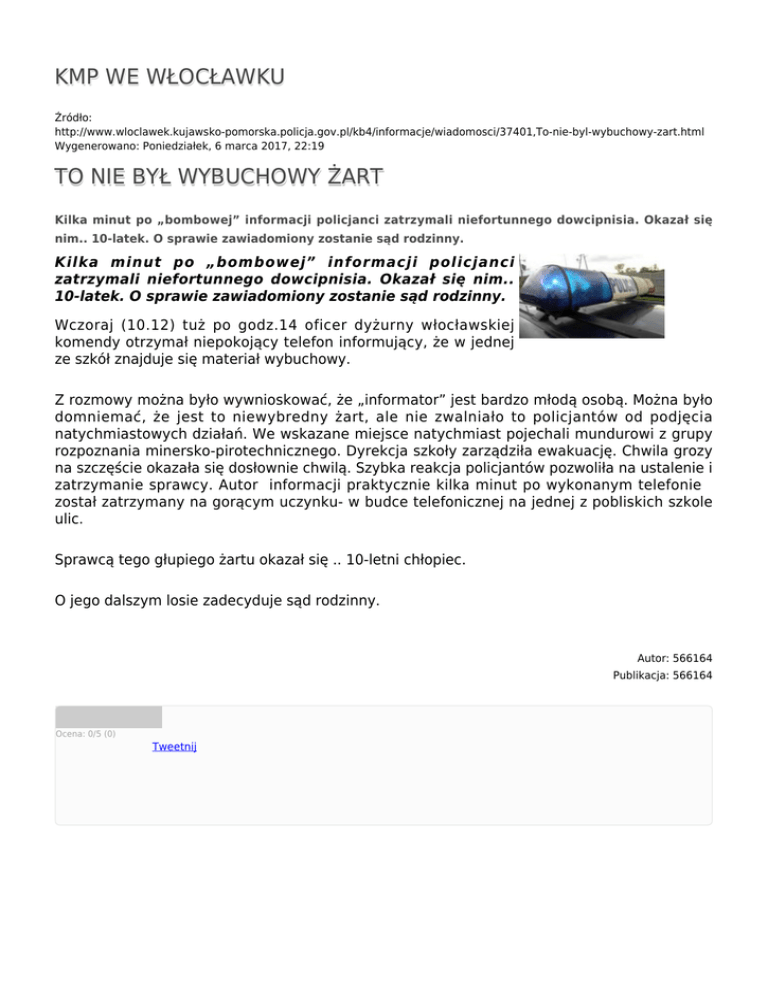 KMP WE WŁOCŁAWKU Źródło: http://www.wloclawek.kujawsko-pomorska.policja.gov.pl/kb4/informacje/wiadomosci/37401,To-nie-byl-wybuchowy-zart.html Wygenerowano: Poniedziałek, 6 marca 2017, 22:19 TO NIE BYŁ WYBUCHOWY ŻART Kilka minut po „bombowej” informacji policjanci zatrzymali niefortunnego dowcipnisia. Okazał się nim.. 10-latek. O sprawie zawiadomiony zostanie sąd rodzinny. Kilka minut po „bombowej” informacji policjanci zatrzymali niefortunnego dowcipnisia. Okazał się nim.. 10-latek. O sprawie zawiadomiony zostanie sąd rodzinny. Wczoraj (10.12) tuż po godz.14 oficer dyżurny włocławskiej komendy otrzymał niepokojący telefon informujący, że w jednej ze szkół znajduje się materiał wybuchowy. Z rozmowy można było wywnioskować, że „informator” jest bardzo młodą osobą. Można było domniemać, że jest to niewybredny żart, ale nie zwalniało to policjantów od podjęcia natychmiastowych działań. We wskazane miejsce natychmiast pojechali mundurowi z grupy rozpoznania minersko-pirotechnicznego. Dyrekcja szkoły zarządziła ewakuację. Chwila grozy na szczęście okazała się dosłownie chwilą. Szybka reakcja policjantów pozwoliła na ustalenie i zatrzymanie sprawcy. Autor informacji praktycznie kilka minut po wykonanym telefonie został zatrzymany na gorącym uczynku- w budce telefonicznej na jednej z pobliskich szkole ulic. Sprawcą tego głupiego żartu okazał się .. 10-letni chłopiec. O jego dalszym losie zadecyduje sąd rodzinny. Autor: 566164 Publikacja: 566164 Ocena: 0/5 (0) Tweetnij