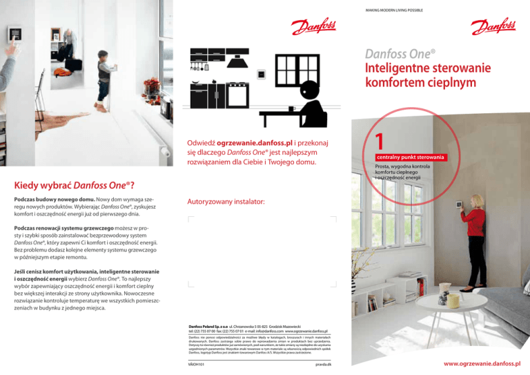 MAKING MODERN LIVING POSSIBLE Danfoss One® Inteligentne sterowanie komfortem cieplnym Odwiedź ogrzewanie.danfoss.pl i przekonaj się dlaczego Danfoss One® jest najlepszym rozwiązaniem dla Ciebie i Twojego domu. Kiedy wybrać Danfoss One®? Podczas budowy nowego domu. Nowy dom wymaga szeregu nowych produktów. Wybierając Danfoss One®, zyskujesz komfort i oszczędność energii już od pierwszego dnia. 1 centralny punkt sterowania Prosta, wygodna kontrola komfortu cieplnego i oszczędność energii Autoryzowany instalator: Podczas renowacji systemu grzewczego możesz w prosty i szybki sposób zainstalować bezprzewodowy system Danfoss One®, który zapewni Ci komfort i oszczędność energii. Bez problemu dodasz kolejne elementy systemu grzewczego w późniejszym etapie remontu. Jeśli cenisz komfort użytkowania, inteligentne sterowanie i oszczędność energii wybierz Danfoss One®. To najlepszy wybór zapewniający oszczędność energii i komfort cieplny bez większej interakcji ze strony użytkownika. Nowoczesne rozwiązanie kontroluje temperaturę we wszystkich pomieszczeniach w budynku z jednego miejsca. Danfoss Poland Sp. z o.o ul. Chrzanowska 5 05-825 Grodzisk Mazowiecki tel: (22) 755 07 00 fax: (22) 755 07 01 e-mail: [email protected] www.ogrzewanie.danfoss.pl Danfoss nie ponosi odpowiedzialności za możliwe błędy w katalogach, broszurach i innych materiałach drukowanych. Danfoss zastrzega sobie prawo do wprowadzenia zmian w produktach bez uprzedzenia. Dotyczy to również produktów już zamówionych, pod warunkiem, że takie zmiany są niezbędne do uzyskania uzgodnionych parametrów. Wszystkie znaki towarowe w tym materiale są własnością odpowiednich spółek Danfoss, logotyp Danfoss jest znakiem towarowym Danfoss A/S. Wszystkie prawa zastrzeżone. VÅIOH101 pravda.dk www.ogrzewanie.danfoss.pl Powietrzne pompy ciepła Gruntowe pompy ciepła Urządzenia elektryczne działające na zasadzie włącz/wyłącz Termostaty grzejnikowe Rekuperacja Wodne ogrzewanie podłogowe Elektryczne ogrzewanie podłogowe Elektryczne ogrzewanie grzejnikowe Innowacyjne rozwiązanie, zapewniające maksymalny komfort cieplny i oszczędność energii • Ustaw i zapomnij. Wybierz odpowiednią temperaturę dla każdego z pomieszczeń i ciesz się komfortem cieplnym, bez konieczności ciągłej zmiany ustawień. • System umożliwia automatyczne obniżenie temperatury w nocy lub w czasie, gdy przebywasz poza domem. Z każdym obniżonym stopniem zaoszczędzasz ok. 5% zużycia energii. System zapewni temperaturę komfortu na czas Twojego powrotu. • Danfoss One® współpracuje z pompami ciepła, rekuperacją, zdalnie programowalnymi termostatami grzejnikowymi oraz regulatorami wodnych i elektrycznych systemów ogrzewania podłogowego. Rozwiązanie optymalizuje zużycie energii i dostosowuje je do aktualnego zapotrzebowania. • Za pomocą systemu można programować pracę ręczną lub zgodnie z harmonogramem czasowym bezprzewodowych przekaźników, które mogą załączać dowolne urządzenie elektryczne pracujące na zasadzie załącz/wyłącz. • Kontrola temperatury we wszystkich pomieszczeniach z jednego miejsca. Jeden centralny system sterujący ogrzewaniem w Twoim domu Wyobraź sobie nowoczesny dom, z funkcją automatycznego i inteligentnego zarządzania komfortem cieplnym i zużyciem energii. Wszystko, co musisz zrobić, to ustawić żądaną temperaturę w pomieszczeniu. Możesz również zarządzać oświetleniem oraz różnego rodzaju urządzeniami elektrycznymi w swoim domu, za pomocą bezprzewodowych przekaźników. Wszystko to jest możliwe dzięki Danfoss One®. Danfoss One® oparty jest na bezprzewodowym systemie sterowania Danfoss LinkTM, który komunikuje się z innymi urządzeniami sterującymi ogrzewaniem i optymalizuje ich pracę. Danfoss One umożliwia połączenie różnych urządzeń grzewczych w jeden system dopasowany do Twoich potrzeb.