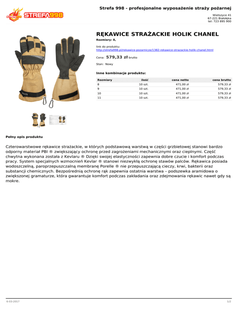 Strefa 998 - profesjonalne wyposażenie straży pożarnej Wietszyce 41 67-221 Białołęka tel: 723 895 900 RĘKAWICE STRAŻACKIE HOLIK CHANEL Rozmiary: 8, link do produktu: http://strefa998.pl/rekawice-pozarnicze/1382-rekawice-strazackie-holik-chanel.html Cena: 579,33 zł brutto Stan: Nowy Inne kombinacje produktu: Rozmiary ilość cena netto cena brutto 8 10 szt. 471,00 zł 579,33 zł 9 10 szt. 471,00 zł 579,33 zł 10 10 szt. 471,00 zł 579,33 zł 11 10 szt. 471,00 zł 579,33 zł Pełny opis produktu Czterowarstwowe rękawice strażackie, w których podstawową warstwą w części grzbietowej stanowi bardzo odporny materiał PBI ® zwiększający ochronę przed zagrożeniami mechanicznymi oraz cieplnymi. Część chwytna wykonana została z Kevlaru ® Dzięki swojej elastyczności zapewnia dobre czucie i komfort podczas pracy. System specjalnych wzmocnień Kevlar ® stanowi niezwykłą ochronę stawów palców. Rękawica posiada wodoszczelną, paroprzepuszczalną membranę Porelle ® nie przepuszczającą cieczy, krwi, bakterii oraz substancji chemicznych. Bezpośrednią ochronę rąk zapewnia ostatnia warstwa – podszewka aramidowa o zwiększonej gramaturze, która gwarantuje komfort podczas zakładania oraz zdejmowania rękawic nawet gdy są mokre. 6-03-2017 1/2 6-03-2017 2/2