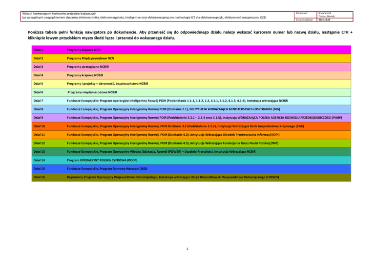 Wykaz i harmonogram konkursów projektów badawczych (ze szczególnych uwzględnieniem obszarów elektrotechnika, elektroenergetyka, inteligentne sieci elektroenergetyczne, technologie ICT dla elektroenergetyki, efektywność energetyczna, OZE) Opracował: Data aktualizacji Anna Szendi Tomasz Sikorski 2015.10.05 Poniższa tabela pełni funkcję nawigatora po dokumencie. Aby przenieść się do odpowiedniego działu należy wskazać kursorem numer lub nazwę działu, następnie CTR + kliknięcie lewym przyciskiem myszy śledzi łącze i przenosi do wskazanego działu. Dział 1 Programy krajowe NCN Dział 2 Programy Międzynarodowe NCN Dział 3 Programy strategiczne NCBiR Dział 4 Programy krajowe NCBiR Dział 5 Programy i projekty – obronność, bezpieczeństwo NCBiR Dział 6 Programy międzynarodowe NCBiR Dział 7 Fundusze Europejskie: Program operacyjny Inteligentny Rozwój POIR (Poddziałania 1.1.1, 1.1.2, 1.2, 4.1.1, 4.1.2, 4.1.3, 4.1.4), Instytucja wdrażająca NCBiR Dział 8 Fundusze Europejskie, Program Operacyjny Inteligentny Rozwój POIR (Działanie 2.1), INSTYTUCJA WDRAŻAJĄCA MINISTERSTWO GOSPODARKI (MG) Dział 9 Fundusze Europejskie, Program Operacyjny Inteligentny Rozwój POIR (Poddziałanie 2.3.1 – 2.3.4 oraz 3.1.5), Instytucja WDRAŻAJĄCA POLSKA AGENCJA ROZWOJU PRZEDSIĘBIORCZOŚCI (PARP) Dział 10 Fundusze Europejskie, Program Operacyjny Inteligentny Rozwój, POIR Działanie 3.2 (Poddziałanie 3.2.2), Instytucja Wdrażająca Bank Gospodarstwa Krajowego (BGK) Dział 11 Fundusze Europejskie, Program Operacyjny Inteligentny Rozwój, POIR (Działanie 4.2), Instytucja Wdrażająca Ośrodek Przetwarzania Informacji (OPI) Dział 12 Fundusze Europejskie, Program Operacyjny Inteligentny Rozwój, POIR (Działanie 4.3), Instytucja Wdrażająca Fundacja na Rzecz Nauki Polskiej (FNP) Dział 13 Fundusze Europejskie, Program Operacyjny Wiedza, Edukacja, Rozwój (POWER) – Uczelnie Przyszłości, Instytucja Wdrażająca NCBiR Dział 14 Program OPERACYJNY POLSKA CYFROWA (POCP) Dział 15 Fundusze Europejskie, Program Ramowy Horyzont 2020 Dział 16 Regionalny Program Operacyjny Województwa Dolnośląskiego, Instytucja wdrażająca Urząd Marszałkowski Województwa Dolnośląskiego (UMWD) 1 Wykaz i harmonogram konkursów projektów badawczych (ze szczególnych uwzględnieniem obszarów elektrotechnika, elektroenergetyka, inteligentne sieci elektroenergetyczne, technologie ICT dla elektroenergetyki, efektywność energetyczna, OZE) Opracował: Data aktualizacji Anna Szendi Tomasz Sikorski 2015.10.05 Lista aktualizacji: Aktualizacja 2015.07.30 w stosunku do wersji 2015.06.25: 1. Zmieniono koncepcję mapy projektów, zrezygnowano z uporządkowania względem instytucji wdrażających na rzeczy uporządkowania względem rodzajów projektów badawczych tzw. Działów, instytucje wdrażające podawane są w drugiej kolejności. 2. Wprowadzono powiązanie nazw działów w formie łączy do tabeli początkowej, pełniącej funkcję nawigatora po sporządzonej mapie, wykazie programów badawczych. 3. Dodano ogłoszone inicjatywy konkursowe w ramach POIRP (Program Operacyjnego Innowacyjny Rozwój) 4. Dodano ogłoszone inicjatywy konkursowe w ramach POWER (Program Operacyjny Wiedza, Edukacja, Rozwój) 5. Dodano ogłoszone inicjatywy konkursowe w ramach Horyzont 2020 Aktualizacja 2015.10.05 w stosunku do wersji 20150.07.30: 6. Dodano Dział inicjatywy konkursowej w ramach POIR (Program Operacyjnego Innowacyjny Rozwój) Działanie 4.3, MAB – Międzynarodowe Agencje Badawcze (MAB), instytucja wdrażająca Fundacja na Rzecz Nauki Polskiej (FNP) 7. Dodano informacje o Regionalny Programie Operacyjnym Województwa Dolnośląskiego (RPOWD), instytucja wdrażająca Urząd Marszałkowski Województwa Dolnośląskiego (UMWD) 2 Opracował: Wykaz i harmonogram konkursów projektów badawczych (ze szczególnych uwzględnieniem obszarów elektrotechnika, elektroenergetyka, inteligentne sieci elektroenergetyczne, technologie ICT dla elektroenergetyki, efektywność energetyczna, OZE) Data aktualizacji Anna Szendi Tomasz Sikorski 2015.10.05 Narodowe Centrum Nauki (NCN) DZIAŁ 1. PROGRAMY KRAJOWE NCN Î SYMFONIA Î ETIUDA Î FUGA Î OPUS Î PRELUDIUM Î SONATA Î SONATA BIS Î MAESTRO Î POLONEZ Î TANGO (NCBIR) Oznaczenia: Konkursy o określonym terminie naboru wniosków Konkursy planowane o nieustalonym terminie naboru wniosków Grupa programów / Nazwa programu Dział OPUS Dział 1 Programy krajowe NCN Konkurs na projekty badawcze, w tym finansowanie zakupu lub wytworzenia aparatury naukowo‐badawczej niezbędnej do realizacji tych projektów https://www.ncn.gov.pl/ogloszenia/konkursy/opus‐16‐ 03‐2015 2015 Termin naboru I II III IV V VI VII 2016 VIII IX X XI XII I II III IV V VI VII VIII IX X XI XII 16.03.2015‐ 16.06.2015 oraz 15.09.2015‐ 15.12.2015 3 Opracował: Wykaz i harmonogram konkursów projektów badawczych (ze szczególnych uwzględnieniem obszarów elektrotechnika, elektroenergetyka, inteligentne sieci elektroenergetyczne, technologie ICT dla elektroenergetyki, efektywność energetyczna, OZE) Data aktualizacji Anna Szendi Tomasz Sikorski 2015.10.05 PRELUDIUM Konkurs na projekty badawcze realizowane przez osoby rozpoczynające karierę naukową nieposiadające stopnia naukowego doktora https://www.ncn.gov.pl/ogloszenia/konkursy/preludium‐ 16‐03‐2015 SONATA Konkurs na projekty badawcze realizowane przez osoby rozpoczynające karierę naukową posiadające stopień naukowy doktora https://www.ncn.gov.pl/ogloszenia/konkursy/sonata‐16‐ 03‐2015 2015 2016 16.03.2015‐ 16.06.2015 oraz 15.09.2015‐ 15.12.2015 16.03.2015‐ 16.06.2015 oraz 15.09.2015‐ 15.12.2015 SONATA BIS Konkurs na projekty badawcze mające na celu powołanie nowego zespołu naukowego, realizowane przez osoby 15.06.2015‐ posiadające stopień naukowy lub tytuł 15.09.2015 naukowy, które uzyskały stopień naukowy doktora w okresie od 2 do 12 lat przed rokiem wystąpienia z wnioskiem https://www.ncn.gov.pl/fi