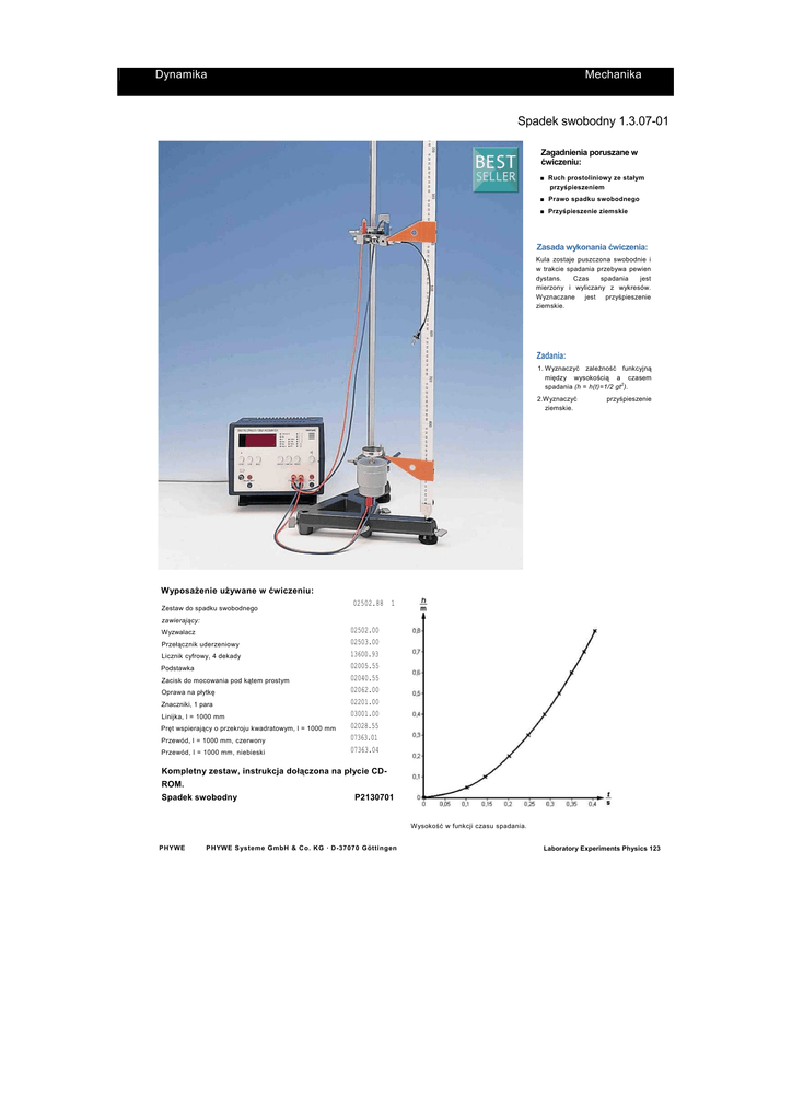 Dynamika Mechanika Spadek swobodny 1.3.07-01 Zagadnienia poruszane w ćwiczeniu: ■ Ruch prostoliniowy ze stałym przyśpieszeniem ■ Prawo spadku swobodnego ■ Przyśpieszenie ziemskie Zasada wykonania ćwiczenia: Kula zostaje puszczona swobodnie i w trakcie spadania przebywa pewien dystans. Czas spadania jest mierzony i wyliczany z wykresów. Wyznaczane jest przyśpieszenie ziemskie. Zadania: 1. Wyznaczyć zaleŜność funkcyjną między wysokością a czasem spadania (h = h(t)=1/2 gt 2 ). 2.Wyznaczyć ziemskie. przyśpieszenie WyposaŜenie uŜywane w ćwiczeniu: Zestaw do spadku swobodnego 02502.88 1 zawierający: Wyzwalacz Przełącznik uderzeniowy Licznik cyfrowy, 4 dekady Podstawka Zacisk do mocowania pod kątem prostym Oprawa na płytkę Znaczniki, 1 para Linijka, l = 1000 mm Pręt wspierający o przekroju kwadratowym, l = 1000 mm Przewód, l = 1000 mm, czerwony Przewód, l = 1000 mm, niebieski 02502.00 02503.00 13600.93 02005.55 02040.55 02062.00 02201.00 03001.00 02028.55 07363.01 07363.04 Kompletny zestaw, instrukcja dołączona na płycie CDROM. Spadek swobodny P2130701 Wysokość w funkcji czasu spadania. PHYWE PHYWE S ysteme GmbH & Co. KG · D-37070 Göttingen Laboratory Experiments Physics 123 Spadek swobodny Zagadnienia poruszane w ćwiczeniu: Ruch prostoliniwoy ze stałym przyśpieszeniem, prawo spadku swobodnego, przyśpieszenie ziemskie. Zasada wykonania ćwiczenia: Kula zostaje puszczona swobodnie i w trakcie spadania przebywa pewien dystans. Czas spadania jest mierzony i wyliczany z wykresów. Wyznaczane jest przyśpieszenie ziemskie. WyposaŜenie uŜywane w ćwiczeniu: Zestaw do spadku swobodnego zawierający: Wyzwalacz Przełącznik uderzeniowy Licznik cyfrowy, 4 dekady Podstawka Zacisk do mocowania pod kątem prostym Oprawa na płytkę Znaczniki, 1 para Linijka, l = 1000 mm Pręt wspierający o przekroju kwadratowym l = 1000 mm 02502.88 1 02502.00 02503.00 13600.93 02005.55 02040.55 02062.00 02201.00 03001.00 02028.55 1 1 1 1 2 1 1 1 1 Rys.1: Zestawienie układu do spadku swobodnego 07363.01 0 Przewód, l = 1000 mm, czerwony Przewód, l = 1000 mm, niebieski 07363.04 2 2 Zadania: 1. Wyznaczyć zaleŜność funkcyjną między wysokością a 2 czasem spadania (h = h(t)=1/2 gt ). 2. Wyznaczyć przyśpieszenie ziemskie. Zestawienie i sposób postępowania: Zestawienie układu pokazane jest na Rys.1. Kula ma niewielką rezystancję i umieszczona jest w mechanizmie wyzwalacza zamykając obwód startu. Szalę naleŜy tak ustawić przy pomocy śruby znajdującej się pod przełącznikiem unieruchamiającym, aby niewielki nacisk zamykał obwód stopu. Szala podnoszona jest ręcznie po kaŜdym pomiarze (do pozycji początkowej). W celu efektywnego wyznaczenia wysokości, z której spada kula, naleŜy wziąść po uwagę promień kuli ( wynosi on około 19mm). Wpływ oporu powietrza pomijamy. Teoria i obliczenia: JeŜeli ciało o masie m będące w spoczynku jest poddawane przyśpieszeniu w stałym polu grawitacyjnym (siła grawitacji mg) zaczyna się poruszać ruchem prostoliniowym. Ustalając układ współrzędnych w taki sposób by oś x pokrywała się z kierunkiem ruchu i rozwiązując odpowiednie równanie ruchu, otrzymujemy: Z warunków początkowych otrzymujemy h(0) = 0 współrzędna h w funkcji czasu (patrz Rys.2): (1) Wysokość jest wprost proporcjonalna do kwadratu czasu 2 spadania. ZaleŜność ta h(t ) przedstawiona jest na Rys.3. Z prostej regresji moŜemy wyliczyć przyśpieszenie ziemskie, poniewaŜ nachylenie jest równe 1/2 g zgodnie z równaniem (1). Z tego pomiaru otrzymujemy: 2 g = 9.77 m/s . (Wartość teoretyczna: 9.81 m/s2) Rys.4 przedstawia wartości przyśpieszenia ziemskiego dla kilku róŜnych pomiarów (wysokości). PHYWE series of publications • Laboratory Experiments • Physics • © PHYWE SYSTEME GMBH & Co. KG • D-37070 Göttingen 21307-01 Spadek swobodny Rys.2: Wysokość w funkcji czasu spadania Rys.4: Zmierzone wartości przyśpieszenia ziemskiego Rys.3: Wysokość w funkcji czasu spadania podniesionego do kwadratu 21307-01 PHYWE series of publications • Laboratory Experiments • Physics • © PHYWE SYSTEME GMBH & Co. KG • D-37070 Göttingen