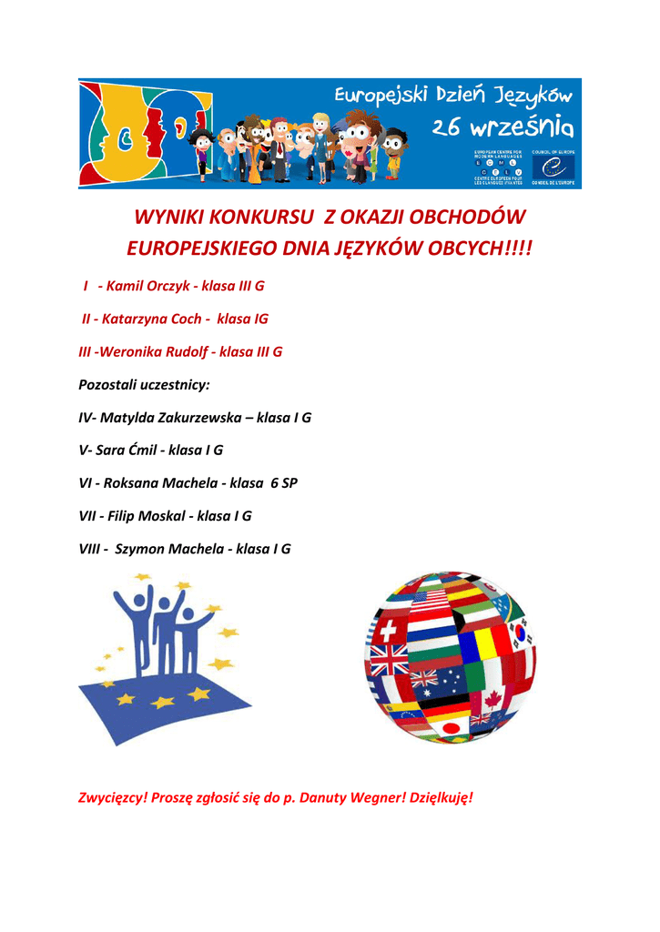WYNIKI KONKURSU Z OKAZJI OBCHODÓW EUROPEJSKIEGO DNIA JĘZYKÓW OBCYCH!!!! I - Kamil Orczyk - klasa III G II - Katarzyna Coch - klasa IG III -Weronika Rudolf - klasa III G Pozostali uczestnicy: IV- Matylda Zakurzewska – klasa I G V- Sara Ćmil - klasa I G VI - Roksana Machela - klasa 6 SP VII - Filip Moskal - klasa I G VIII - Szymon Machela - klasa I G Zwycięzcy! Proszę zgłosić się do p. Danuty Wegner! Dzięlkuję!