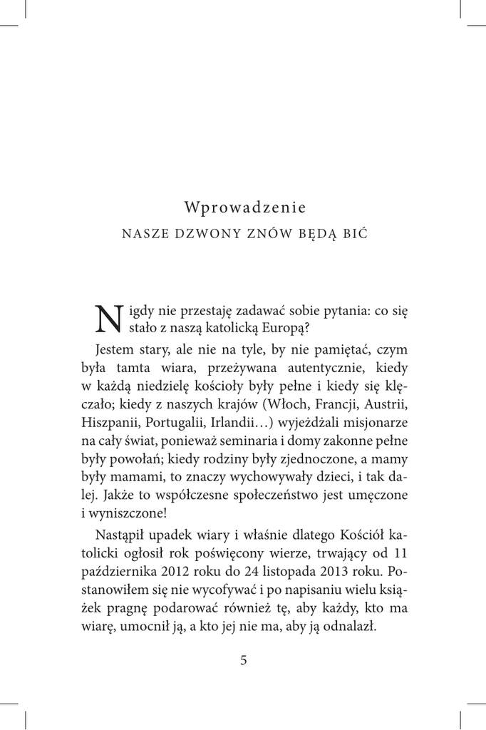 Wprow a d z e n ie NA S Z E D Z WO N Y Z N ÓW B Ę DĄ B IĆ N igdy nie przestaję zadawać sobie pytania: co się stało z naszą katolicką Europą? Jestem stary, ale nie na tyle, by nie pamiętać, czym była tamta wiara, przeżywana autentycznie, kiedy w każdą niedzielę kościoły były pełne i kiedy się klęczało; kiedy z naszych krajów (Włoch, Francji, Austrii, Hiszpanii, Portugalii, Irlandii…) wyjeżdżali misjonarze na cały świat, ponieważ seminaria i domy zakonne pełne były powołań; kiedy rodziny były zjednoczone, a mamy były mamami, to znaczy wychowywały dzieci, i tak dalej. Jakże to współczesne społeczeństwo jest umęczone i wyniszczone! Nastąpił upadek wiary i właśnie dlatego Kościół katolicki ogłosił rok poświęcony wierze, trwający od 11 października 2012 roku do 24 listopada 2013 roku. Postanowiłem się nie wycofywać i po napisaniu wielu książek pragnę podarować również tę, aby każdy, kto ma wiarę, umocnił ją, a kto jej nie ma, aby ją odnalazł. 5 Czy chcę zbyt wiele? A może po napisaniu wielu książek wyrobiłem sobie wygórowane pojęcie o sobie? Wiem, że jestem kimś małym i nieznaczącym, ale zarazem jestem pewien, że za moimi plecami stoi Matka Boża. Nie wiem, dlaczego, ale Ona w zdumiewający sposób mi pomaga i sprzyja licznym inicjatywom, które zresztą sama mi podpowiada. Przypomnę przynajmniej te najważniejsze: przygotowanie i zorganizowanie uroczystego Poświęcenia Włoch Niepokalanemu Sercu Maryi w 1959 roku, a ostatnio założenie Międzynarodowego Stowarzyszenia Egzorcystów, które nigdy wcześniej nie istniało. I właśnie dlatego przyzywam wstawiennictwa Maryi, aby nadała skuteczność tym słowom pełnym wiary i abyśmy znów mogli usłyszeć dźwięk naszych dzwonów, znak ludu zjednoczonego w wierze w Boga. Nie mogę również pominąć mojego zadania egzorcysty w świecie, który rzuca się w objęcia złego ducha. Dlatego włączam do opowiadania dwa interesujące przypadki egzorcyzmu, ubogacone uwagami przeplatanymi z ogólną treścią książki. Dziękuję przyjacielowi, dziennikarzowi Paolo Rodariemu, który raz jeszcze (po Ostatnim egzorcyście, który ukazał się w 2012 roku) podjął się trudu redagowania książki, starając się uczynić lekturę płynną również w tych najbardziej wymagających jej częściach. Niech Pan sprawi, aby ta książka przyniosła dobre owoce tym, którym nie zabraknie cierpliwości, by ją przeczytać. Gabriele Amorth 6