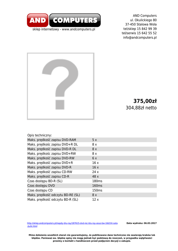 sklep internetowy - www.andcomputers.pl AND Computers ul. Okulickiego 80 37-450 Stalowa Wola tel/sklep 15 842 99 39 tel/serwis 15 642 55 52 [email protected] 375,00zł 304,88zł netto Opis techniczny: Maks. prędkość zapisu DVD-RAM Maks. prędkośc zapisu DVD+R DL Maks. prędkość zapisu DVD-R DL Maks. prędkośc zapisu DVD+RW Maks. prędkość zapisu DVD-RW Maks. prędkość zapisu DVD+R Maks. prędkość zapisu DVD-R Maks. prędkość zapisu CD-RW Maks. prędkość zapisu CD-R Czas dostępu BD-R (SL) Czas dostępu DVD Czas dostępu CD Maks. prędkość odczytu BD-RE (SL) Maks. prędkość odczytu BD-R (SL) 5x 8x 8x 8x 6x 16 x 16 x 24 x 48 x 180ms 160ms 150ms 8x 12 x http://sklep.andcomputers.pl/napdy-blu-ray/187615-dvd-rec-blu-ray-asus-bw-16d1ht-sata -bulk.html Data wydruku: 06.03.2017 Mimo dołożenia wszelkich starań nie gwarantujemy, że publikowane dane techniczne nie zawierają braków lub błędów. Ponieważ ew. błędne opisy nie mogą jednak być podstawą do roszczeń, w przypadku wątpliwości prosimy o kontakt z handlowcem przed podjęciem decyzji o zakupie. Kolor frontu Maks. prędkość zapisu BD-RE (SL) Maks. prędkość zapisu BD-R (SL) Maks. prędkość odczytu DVD Maks. prędkość odczytu CD Slim Sposób podawania nośnika Interfejs Instalacja Typ napędu optycznego Kod producenta Czarny 2x 16 x 16 x 48 x false Tacka S-ATA Wewnętrzny Nagrywarka BLU-RAY BW-16D1HT/BLK/B http://sklep.andcomputers.pl/napdy-blu-ray/187615-dvd-rec-blu-ray-asus-bw-16d1ht-sata -bulk.html Data wydruku: 06.03.2017 Mimo dołożenia wszelkich starań nie gwarantujemy, że publikowane dane techniczne nie zawierają braków lub błędów. Ponieważ ew. błędne opisy nie mogą jednak być podstawą do roszczeń, w przypadku wątpliwości prosimy o kontakt z handlowcem przed podjęciem decyzji o zakupie.