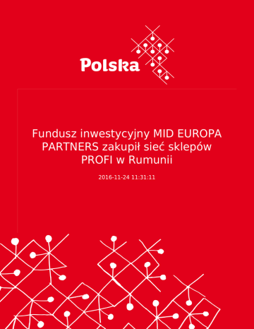 Fundusz inwestycyjny MID EUROPA PARTNERS zakupił sieć sklepów PROFI w Rumunii 2016-11-24 11:31:11 2 Fundusz inwestycyjny MID EUROPA PARTNERS zakupił sieć sklepów PROFI w Rumunii W dniu 23 listopada 2016 roku została podpisana umowa kupna – sprzedaży sieci sklepów PROFI w Rumunii pomiędzy polskim funduszem inwestycyjnym Enterprise Investors (w roli sprzedającego) i funduszem inwestycyjnym Mid Europa Partners (w roli kupującego). Wartość transakcji to 533 mln Euro. Sieć PROFI posiada na terenie Rumunii około 500 jednostek sprzedaży i ich szacowane obroty w 2016 rok wyniosą ok. 800 mln Euro, czyli wzrosną o prawie 50% w porównaniu do wartości osiągniętych w roku 2015. Sklepy sieci PROFI działają w 250 miastach Rumunii, a sieć zalicza są do najbardziej rozwiniętej sieci z punktu widzenia rozmieszczenia geograficznego. Ewolucja ilości sklepów PROFI na terenie Rumunii od 2008-2016 roku. wykres nr. 1 (w załączniku plik do pobrania) Fundusz inwestycyjny MID EUROPA PARTNERS posiada duże doświadczenie w branży retail, ponieważ od 2010 roku jest właścicielem sieci sprzedaży ŻABKA (w Polsce), którą powiększył z 2.300 sklepów działających w 2010 r. do 4.500 sklepów w 2016. Zakup sieci sklepów PROFI w Rumunii ma byś finansowana poprzez kredyt o wartości 220 mln Euro udzielony przez konsorcjum banków Citi, ING, UniCredit i Raiffeisen. Transakcja czeka na zatwierdzenie przez rumuńską Radę ds. Konkurencyjności. Jej sfinalizowanie zaplanowane jest na I kwartał 2017 roku. WPHI Bukareszt 3