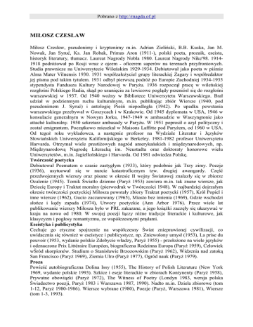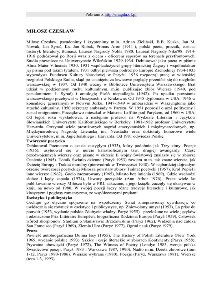 Pobrano z http://magda.of.pl MIŁOSZ CZESŁAW Miłosz Czesław, pseudonimy i kryptonimy m.in. Adrian Zieliński, B.B. Kuska, Jan M. Nowak, Jan Syruć, Ks. Jan Robak, Primas Aron (1911-), polski poeta, prozaik, eseista, historyk literatury, tłumacz. Laureat Nagrody Nobla 1980. Laureat Nagrody Nike'98. 19141918 podróŜował po Rosji wraz z ojcem - oficerem saperów na terenach przyfrontowych. Studia prawnicze na Uniwersytecie Wileńskim 1929-1934. Debiutował jako poeta w piśmie Alma Mater Vilnensis 1930. 1931 współzałoŜyciel grupy literackiej śagary i współredaktor jej pisma pod takim tytułem. 1931 odbył pierwszą podróŜ po Europie Zachodniej 1934-1935 stypendysta Funduszu Kultury Narodowej w ParyŜu. 1936 rozpoczął pracę w wileńskiej rozgłośni Polskiego Radia, skąd po usunięciu za lewicowe poglądy przeniósł się do rozgłośni warszawskiej w 1937. Od 1940 woźny w Bibliotece Uniwersytetu Warszawskiego. Brał udział w podziemnym ruchu kulturalnym, m.in. publikując zbiór Wiersze (1940, pod pseudonimem J. Syruć) i antologię Pieśń niepodległa (1942). Po upadku powstania warszawskiego przebywał w Goszycach i w Krakowie. Od 1945 dyplomata w USA, 1946 w konsulacie generalnym w Nowym Jorku, 1947-1949 w ambasadzie w Waszyngtonie jako attaché kulturalny. 1950 sekretarz ambasady w ParyŜu. W 1951 poprosił o azyl polityczny i został emigrantem. Początkowo mieszkał w Maisons Laffitte pod ParyŜem, od 1960 w USA. Od tegoŜ roku wykładowca, a następnie profesor na Wydziale Literatur i Języków Słowiańskich Uniwersytetu Kalifornijskiego w Berkeley. 1981-1982 profesor Uniwersytetu Harvarda. Otrzymał wiele prestiŜowych nagród amerykańskich i międzynarodowych, np. Międzynarodową Nagrodę Literacką im. Neustadta oraz doktoraty honorowe wielu Uniwersytetów, m.in. Jagiellońskiego i Harvarda. Od 1981 odwiedza Polskę. Twórczość poetycka Debiutował Poematem o czasie zastygłym (1933), który podobnie jak Trzy zimy. Poezje (1936), usytuował się w nurcie katastroficznym tzw. drugiej awangardy. Część przedwojennych wierszy oraz pisane w okresie II wojny Światowej znalazły się w zbiorze Ocalenie (1945). Tomik Światło dzienne (ParyŜ 1953) zawiera m.in. tak znane wiersze, jak Dziecię Europy i Traktat moralny (pierwodruk w Twórczości 1948). W najbardziej dojrzałym okresie twórczości poetyckiej Miłosza powstały zbiory Traktat poetycki (1957), Król Popiel i inne wiersze (1962), Gucio zaczarowany (1965), Miasto bez imienia (1969), Gdzie wschodzi słońce i kędy zapada (1974), Utwory poetyckie (Ann Arbor 1976). Przez wiele lat publikowanie wierszy Miłosza było w PRL zakazane, a jego ksiąŜki zaczęły się ukazywać w kraju na nowo od 1980. W swojej poezji łączy róŜne tradycje literackie i kulturowe, jak klasycyzm i pogłosy romantyzmu, ze współczesnymi prądami. Eseistyka i publicystyka Cechuje go etyczne spojrzenie na współczesny Świat znieprawionej cywilizacji, co uwidacznia się równieŜ w eseistyce i publicystyce, np. Zniewolony umysł (1953), La prise du pouvoir (1953, wydanie polskie Zdobycie władzy, ParyŜ 1955) - przełoŜone na wiele języków i odznaczone Prix Littéraire Européen, biograficzna Rodzinna Europa (ParyŜ 1959), Człowiek wŚród skorpionów. Studium o Stanisławie Brzozowskim (ParyŜ 1962), Widzenia nad zatoką San Francisco (ParyŜ 1969), Ziemia Ulro (ParyŜ 1977), Ogród nauk (ParyŜ 1979). Proza Powieść autobiograficzna Dolina Issy (1955), The History of Polish Literature (New York 1969, wydanie polskie 1993). Szkice i eseje literackie w zbiorach Kontynenty (ParyŜ 1958), Prywatne obowiązki (ParyŜ 1972), The Witness of Poetry (Londyn 1983, wersja polska Świadectwo poezji, ParyŜ 1983 i Warszawa 1987, 1990). Nadto m.in. Dzieła zbiorowe (tom 1-12, ParyŜ 1980-1986). Wiersze wybrane (1980), Poezje (ParyŜ, Warszawa 1981), Wiersze (tom 1-3, 1993). Pobrano z http://magda.of.pl Przekłady TakŜe liczne przekłady, np. Księga ŤPsalmówť (1979), utwory poetów anglosaskich oraz pisarzy polskich przełoŜone na angielski, jak Selected Poems Z. Herberta (1968, wraz z P. Scottem). Prace redakcyjne w rodzaju Mój wiek. Pamiętnik mówiony A. Wata (tom 1-2, wywiad przeprowadził C. Miłosz, Londyn 1977).
