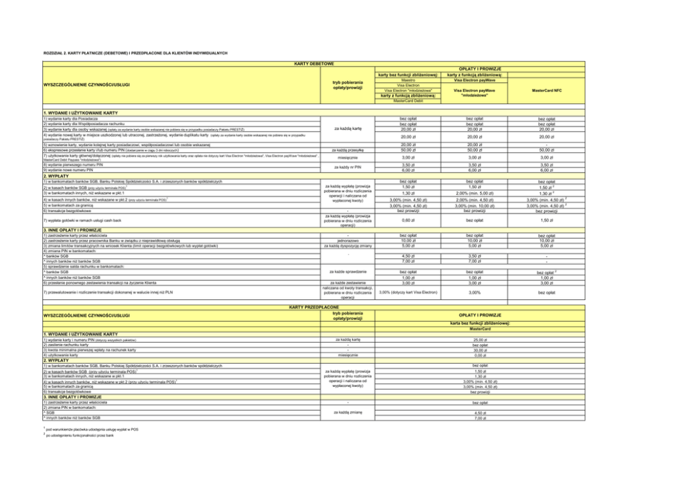 ROZDZIAŁ 2. KARTY PŁATNICZE (DEBETOWE) I PRZEDPŁACONE DLA KLIENTÓW INDYWIDUALNYCH KARTY DEBETOWE karty bez funkcji zbliżeniowej: tryb pobierania opłaty/prowizji WYSZCZEGÓLNIENIE CZYNNOŚCI/USŁUGI Maestro Visa Electron Visa Electron "młodzieżowa" OPŁATY I PROWIZJE karty z funkcją zbliżeniową: Visa Electron payWave Visa Electron payWave "młodzieżowa" MasterCard NFC bez opłat bez opłat 20,00 zł bez opłat bez opłat 20,00 zł bez opłat bez opłat 20,00 zł 20,00 zł 20,00 zł 20,00 zł za każdą przesyłkę 20,00 zł 50,00 zł 20,00 zł 50,00 zł 50,00 zł miesięcznie 3,00 zł 3,00 zł 3,00 zł za każdy nr PIN 3,50 zł 6,00 zł 3,50 zł 6,00 zł 3,50 zł 6,00 zł bez opłat 1,50 zł 1,30 zł bez opłat 1,50 zł 2,00% (min. 5,00 zł) 3,00% (min. 4,50 zł) 3,00% (min. 4,50 zł) bez prowizji 2,00% (min. 4,50 zł) 3,00% (min. 10,00 zł) bez prowizji bez opłat 2 1,50 zł 1,30 zł 2 2 3,00% (min. 4,50 zł) 3,00% (min. 4,50 zł) 2 bez prowizji 0,60 zł bez opłat 1,50 zł jednorazowo za każdą dyspozycję zmiany bez opłat 10,00 zł 5,00 zł bez opłat 10,00 zł 5,00 zł bez opłat 10,00 zł 5,00 zł ` 4,50 zł 7,00 zł 3,50 zł 7,00 zł - za każde sprawdzenie bez opłat 1,00 zł 3,00 zł bez opłat 1,00 zł 3,00 zł bez opłat 2 1,00 zł 3,00 zł 3,00% (dotyczy kart Visa Electron) 3,00% bez opłat karty z funkcją zbliżeniową: MasterCard Debit 1. WYDANIE I UŻYTKOWANIE KARTY 1) wydanie karty dla Posiadacza 2) wydanie karty dla Współposiadacza rachunku 3) wydanie karty dla osoby wskazanej (opłaty za wydanie karty osobie wskazanej nie pobiera się w przypadku posiadaczy Pakietu PRESTIŻ) za każdą kartę 4) wydanie nowej karty w miejsce uszkodzonej lub utraconej, zastrzeżonej, wydanie duplikatu karty (opłaty za wydanie karty osobie wskazanej nie pobiera się w przypadku posiadaczy Pakietu PRESTIŻ) 5) wznowienie karty, wydanie kolejnej karty posiadaczowi, współposiadaczowi lub osobie wskazanej 6) ekspresowe przesłanie karty i/lub numeru PIN (dostarczenie w ciągu 3 dni roboczych) 7) użytkowanie karty głównej/dołączonej (opłaty nie pobiera się za pierwszy rok użytkowania karty oraz opłata nie dotyczy kart Visa Electron "młodzieżowa", Visa Electron payWave "młodzieżowa" , MasterCard Debit Paypass "młodzieżowa") 8) wydanie pierwszego numeru PIN 9) wydanie nowe numeru PIN 2. WYPŁATY 1) w bankomatach banków SGB, Banku Polskiej Spółdzielczości S.A. i zrzeszonych banków spółdzielczych za każdą wypłatę (prowizja pobierana w dniu rozliczenia operacji i naliczana od wypłaconej kwoty) 2) w kasach banków SGB (przy użyciu terminala POS)1 3) w bankomatach innych, niż wskazane w pkt.1 4) w kasach innych banków, niż wskazane w pkt.2 (przy użyciu terminala POS) 5) w bankomatach za granicą 1 6) transakcje bezgotówkowe za każdą wypłatę (prowizja pobierana w dniu rozliczenia operacji) 7) wypłata gotówki w ramach usługi cash back 3. INNE OPŁATY I PROWIZJE 1) zastrzeżenie karty przez właściciela 2) zastrzeżenie karty przez pracownika Banku w związku z nieprawidłową obsługą 3) zmiana limitów transakcyjnych na wniosek Klienta (limit operacji bezgotówkowych lub wypłat gotówki) 4) zmiana PIN w bankomatach: ^ banków SGB ^ innych banków niż banków SGB 5) sprawdzenie salda rachunku w bankomatach: ^ banków SGB ^ innych banków niż banków SGB 6) przesłanie ponownego zestawienia transakcji na życzenie Klienta za każde zestawienie naliczana od kwoty transakcji, pobierana w dniu rozliczenia operacji 7) przewalutowanie i rozliczenie transakcji dokonanej w walucie innej niż PLN KARTY PRZEDPŁACONE tryb pobierania opłaty/prowizji WYSZCZEGÓLNIENIE CZYNNOŚCI/USŁUGI OPŁATY I PROWIZJE karta bez funkcji zbliżeniowej: MasterCard 1. WYDANIE I UŻYTKOWANIE KARTY za każdą kartę miesięcznie 1) wydanie karty i numeru PIN (dotyczy wszystkich pakietów) 2) zasilenie rachunku karty 3) kwota minimalna pierwszej wpłaty na rachunek karty 4) użytkowanie karty 25,00 zł bez opłat 30,00 zł 0,00 zł 2. WYPŁATY bez opłat 1) w bankomatach banków SGB, Banku Polskiej Spółdzielczości S.A. i zrzeszonych banków spółdzielczych 2) w kasach banków SGB (przy użyciu terminala POS)1 3) w bankomatach innych, niż wskazane w pkt.1 4) w kasach innych banków, niż wskazane w pkt.2 (przy użyciu terminala POS) 5) w bankomatach za granicą 6) transakcje bezgotówkowe 1 za każdą wypłatę (prowizja pobierana w dniu rozliczenia operacji i naliczana od wypłaconej kwoty) 1,50 zł 1,30 zł 3,00% (min. 4,50 zł) 3,00% (min. 4,50 zł) bez prowizji - bez opłat za każdą zmianę 4,50 zł 7,00 zł 3. INNE OPŁATY I PROWIZJE 1) zastrzeżenie karty przez właściciela 2) zmiana PIN w bankomatach: ^ SGB ^ innych banków niż banków SGB 1 pod warunkiemże placówka udostępnia usługę wypłat w POS 2 po udostępnieniu funkcjonalności przez bank