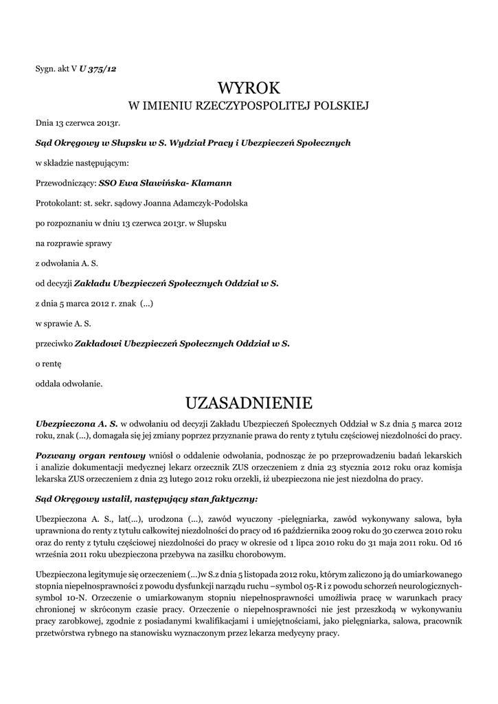 Sygn. akt V U 375/12 WYROK W IMIENIU RZECZYPOSPOLITEJ POLSKIEJ Dnia 13 czerwca 2013r. Sąd Okręgowy w Słupsku w S. Wydział Pracy i Ubezpieczeń Społecznych w składzie następującym: Przewodniczący: SSO Ewa Sławińska- Klamann Protokolant: st. sekr. sądowy Joanna Adamczyk-Podolska po rozpoznaniu w dniu 13 czerwca 2013r. w Słupsku na rozprawie sprawy z odwołania A. S. od decyzji Zakładu Ubezpieczeń Społecznych Oddział w S. z dnia 5 marca 2012 r. znak (...) w sprawie A. S. przeciwko Zakładowi Ubezpieczeń Społecznych Oddział w S. o rentę oddala odwołanie. UZASADNIENIE Ubezpieczona A. S. w odwołaniu od decyzji Zakładu Ubezpieczeń Społecznych Oddział w S.z dnia 5 marca 2012 roku, znak (...), domagała się jej zmiany poprzez przyznanie prawa do renty z tytułu częściowej niezdolności do pracy. Pozwany organ rentowy wniósł o oddalenie odwołania, podnosząc że po przeprowadzeniu badań lekarskich i analizie dokumentacji medycznej lekarz orzecznik ZUS orzeczeniem z dnia 23 stycznia 2012 roku oraz komisja lekarska ZUS orzeczeniem z dnia 23 lutego 2012 roku orzekli, iż ubezpieczona nie jest niezdolna do pracy. Sąd Okręgowy ustalił, następujący stan faktyczny: Ubezpieczona A. S., lat(...), urodzona (...), zawód wyuczony -pielęgniarka, zawód wykonywany salowa, była uprawniona do renty z tytułu całkowitej niezdolności do pracy od 16 października 2009 roku do 30 czerwca 2010 roku oraz do renty z tytułu częściowej niezdolności do pracy w okresie od 1 lipca 2010 roku do 31 maja 2011 roku. Od 16 września 2011 roku ubezpieczona przebywa na zasiłku chorobowym. Ubezpieczona legitymuje się orzeczeniem (...)w S.z dnia 5 listopada 2012 roku, którym zaliczono ją do umiarkowanego stopnia niepełnosprawności z powodu dysfunkcji narządu ruchu –symbol 05-R i z powodu schorzeń neurologicznychsymbol 10-N. Orzeczenie o umiarkowanym stopniu niepełnosprawności umożliwia pracę w warunkach pracy chronionej w skróconym czasie pracy. Orzeczenie o niepełnosprawności nie jest przeszkodą w wykonywaniu pracy zarobkowej, zgodnie z posiadanymi kwalifikacjami i umiejętnościami, jako pielęgniarka, salowa, pracownik przetwórstwa rybnego na stanowisku wyznaczonym przez lekarza medycyny pracy. W dniu 10 maja 2010 roku ubezpieczona złożyła wniosek o ustalenie prawa do renty na dalszy okres. Lekarz orzecznik ZUS orzeczeniem z dnia 23 stycznia 2012 roku rozpoznał u ubezpieczonej: zespół bólowy kręgosłupa L-S prawostronny, bez ubytków neurologicznych , bez istotnego ograniczenia sprawności ruchowej w przebiegu zmian dyskopatycznych, zaburzenia wypieracza pęcherza moczowego i orzekł, że ubezpieczona nie jest niezdolna do pracy zgodnej z posiadanymi kwalifikacjami. Ubezpieczona wniosła sprzeciw od powyższego orzeczenia do komisji lekarskiej ZUS, która po uwzględnieniu opinii lekarza konsultanta podtrzymała opinie lekarza orzecznika i orzekła, że ubezpieczona nie jest niezdolna do pracy. Zaskarżoną decyzją odmówiono ubezpieczonej prawa do renty z tytułu niezdolności do pracy. Dowód: akta rentowe: wniosek k.192, zaskarżona decyzja k.215 akta dokumentacji lekarskiej: orzeczenie lekarza orzecznika ZUS z dnia 23.01.2012r k.202, orzeczenie komisji lekarskiej ZUS z dnia 23.02.2012 roku k. 211, akta sprawy orzeczenie (...)k.45, opinia uzupełniająca biegłego neurologa k.53 Sąd ustalając, czy stan zdrowia skarżącej świadczy o tym, że jest ona niezdolna do pracy częściowo lub całkowicie z powodu naruszenia sprawności organizmu i nie rokuje zdolności do pracy po przekwalifikowaniu, dopuścił dowód z opinii biegłych sądowych o specjalnościach: neurolog, neurochirurg i urolog. Stwierdzone u ubezpieczonej schorzenia urologiczne tj. pęcherz moczowy nadaktywny nie powodują u ubezpieczonej niezdolności do pracy. Stwierdzone u ubezpieczonej schorzenia neurologiczne: przewlekły zespól bólowy kręgosłupa lędźwiowego, leczenie operacyjne przepukliny krążka międzykręgowego L4-L5,L5-S1-2009, przebyta rwa kulszowa prawostronna, resztkowe zaburzenia czucia w karesie korzeniowego unerwienia L5 po stronie prawej również pozostają bez wpływu na zdolność do pracy. Po zabiegu operacyjnym wykonanym w 2009 roku nastąpiła u ubezpieczonej remisja korzeniowych objawów bólowych. Badaniem neurologicznym nie stwierdzono podrażnienia, ani uszkodzenia układu nerwowego. Przewlekłe bóle okolicy lędźwiowej maja charakter mięśniowo-stawowy. W okresie nasilenie odczuwanych dolegliwości bólowych leczenie może być realizowane w ramach zwolnienia lekarskiego. Ubezpieczona jest zdolna do pracy jako pielęgniarka oraz jako salowa. Stwierdzone u ubezpieczonej schorzenia neurochirurgiczne tj. stan po stabilizacji międzytrzonowej i przeznasadowej L4S1 AD 2009, zespół segmentu pośredniego pod postacią dyskopatii L2L3L4 nie powodują u ubezpieczonej niezdolności do pracy od 1 czerwca 2011 roku. Badanie MRI z dnia 15 marca 2012 roku obrazowało nasilenie radiologiczne przepuklin, jednak klinicznie w odniesieniu do zdolności do pracy zarobkowej nie wpływa na opinię o zdolności do pracy zarobkowej na dzień wydania decyzji. Zmiany dyskopatyczne wymagają dalszej aktywności fizycznej, nie stanowią wskazań do leczenia operacyjnego kręgosłupa. Przepukliny dysków są na tyle powszechne, że same w sobie nie stanowią podstawy do opiniowania o niezdolności do pracy, a jedynie z objawami korzeniowymi, leczeniem operacyjnym, okresami rekonwalescencji czy powikłaniami. Dowód: opinia sądowo – lekarska z dnia 11 maja 2012 roku k. 11-11verte as, opinia sądowo – lekarska z dnia 25 lipca 2012 roku k. 6-7, opinia sądowo – lekarska z dnia 5 kwietnia 2012 roku k14-15, opinia uzupełniająca k.28, opinia uzupełniająca k.37, Sąd zważył, co następuje: Odwołanie ubezpieczonej A. S. nie zasługuje na uwzględnienie. Spór w niniejszej sprawie sprowadzał się do ustalenia czy ubezpieczona jest niezdolna do pracy częściowo lub cał