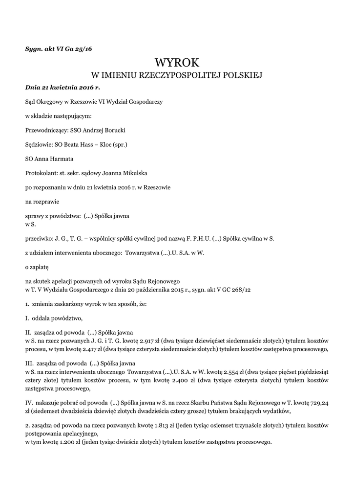 Sygn. akt VI Ga 25/16 WYROK W IMIENIU RZECZYPOSPOLITEJ POLSKIEJ Dnia 21 kwietnia 2016 r. Sąd Okręgowy w Rzeszowie VI Wydział Gospodarczy w składzie następującym: Przewodniczący: SSO Andrzej Borucki Sędziowie: SO Beata Hass – Kloc (spr.) SO Anna Harmata Protokolant: st. sekr. sądowy Joanna Mikulska po rozpoznaniu w dniu 21 kwietnia 2016 r. w Rzeszowie na rozprawie sprawy z powództwa: (...) Spółka jawna w S. przeciwko: J. G., T. G. – wspólnicy spółki cywilnej pod nazwą F. P.H.U. (...) Spółka cywilna w S. z udziałem interwenienta ubocznego: Towarzystwa (...).U. S.A. w W. o zapłatę na skutek apelacji pozwanych od wyroku Sądu Rejonowego w T. V Wydziału Gospodarczego z dnia 20 października 2015 r., sygn. akt V GC 268/12 1. zmienia zaskarżony wyrok w ten sposób, że: I. oddala powództwo, II. zasądza od powoda (...) Spółka jawna w S. na rzecz pozwanych J. G. i T. G. kwotę 2.917 zł (dwa tysiące dziewięćset siedemnaście złotych) tytułem kosztów procesu, w tym kwotę 2.417 zł (dwa tysiące czterysta siedemnaście złotych) tytułem kosztów zastępstwa procesowego, III. zasądza od powoda (...) Spółka jawna w S. na rzecz interwenienta ubocznego Towarzystwa (...).U. S.A. w W. kwotę 2.554 zł (dwa tysiące pięćset pięćdziesiąt cztery złote) tytułem kosztów procesu, w tym kwotę 2.400 zł (dwa tysiące czterysta złotych) tytułem kosztów zastępstwa procesowego, IV. nakazuje pobrać od powoda (...) Spółka jawna w S. na rzecz Skarbu Państwa Sądu Rejonowego w T. kwotę 729,24 zł (siedemset dwadzieścia dziewięć złotych dwadzieścia cztery grosze) tytułem brakujących wydatków, 2. zasądza od powoda na rzecz pozwanych kwotę 1.813 zł (jeden tysiąc osiemset trzynaście złotych) tytułem kosztów postępowania apelacyjnego, w tym kwotę 1.200 zł (jeden tysiąc dwieście złotych) tytułem kosztów zastępstwa procesowego. Sygn. akt VI Ga 25/16 UZASADNIENIE wyroku z dnia 21 kwietnia 2016 r. Powód (...)P. (...) i N. sp. j. w S. domagał się zasądzenia od pozwanego T. G. i J. G. prowadzących działalność gospodarczą pod nazwą F. P.H.U. (...) spółka cywilna w S. kwoty 12.249 zł wraz z ustawowymi odsetkami od dnia 28 czerwca 2012 r. Wniósł ponadto o zasądzenie od pozwanych solidarnie kosztów procesu według norm przepisanych. W uzasadnieniu pozwu wskazał, że w dniu 12 września 2011 r. zlecił pozwanemu wykonanie usługi polegającej na wyczyszczeniu tapicerki samochodowej – renowacji wnętrza i tapicerki samochodu osobowego marki M. stanowiącego własność powoda. Zlecona usługa została jednak wykonana przez pozwanego nienależycie, skutkiem czego siedzenia samochodu zostały całkowicie zniszczone. Powołany przez powoda rzeczoznawca stwierdził zniszczenie tapicerki wewnętrznej siedzeń tylnych i foteli przednich z zaciekami i przebarwieniami trwałymi wskazując, że przyczyną powstałych uszkodzeń był niezgodny z technologią proces prania bądź zastosowany niewłaściwy środek chemiczny. Rzeczoznawca ten ocenił, że rodzaj zniszczeń oraz ich trwały charakter kwalifikują zniszczoną tapicerkę do wymiany na wolną od wad, przy czym oszacował on koszt z tym związany na kwotę 12.000 zł. Powód wyjaśnił także, że zwrócił się do najbliższego (...) z prośbą o dokonanie wyceny kosztów związanych z likwidacją wyrządzonej przez pozwanego szkody, tj. kosztów robocizny i materiałów niezbędnych do wymiany zniszczonej tapicerki. Wycena ASO określiła te koszty na kwotę 12.249 zł. Jak podał dalej powód, strona pozwana przyznała i potwierdziła fakt zaistnienia w dniu 12 września 2011 r. uszkodzenia podczas prania tapicerki w przywołanym pojeździe, ale ostatecznie wezwana do zapłaty w dniu 21 czerwca 2012 r. nie uczyniła zadość żądaniu powoda. Na koniec powód oświadczył, że w żadnym razie nie on jest odpowiedzialny za zaistniałą szkodę, jak również nie przyczynił się do jej powstania, gdyż fotele posiadały tylko normalne zabrudzenia, wynikające ze zwykłego użytkowania samochodu, który służył powodowi jedynie do celów służbowych. Pozwani T. G. i J. G. – wspólnicy spółki cywilnej pod nazwą F. P.H.U. (...) w S. wnieśli o oddalenie powództwa w całości i zasądzenie od powoda kosztów procesu według norm przepisanych. W uzasadnieniu potwierdzili, że powód korzystał z usług ich myjni. Po wyczyszczeniu powód odebrał auto i nie zgłaszał żadnych uwag. Zarówno w chwili czyszczenia, jak i również w momencie oddawania pojazdu nie widać było żadnych widocznych oznak zniszczenia tapicerki, tapicerka była czysta. Usługa została wykonana prawidłowo z zastosowaniem odpowiednio dobranych środków czyszczących oraz technologii prania. Kiedy powód odbierał pojazd tapicerka nie była do końca wysuszona, o czym pracownik pozwanego osobiście poinformował powoda. Ten jednak rzucił teczkę na tylne siedzenie i powiedział, że dosuszy tapicerkę we własnym zakresie. Powód zapłacił za usługę, co świadczy o tym, że w chwili wydania pojazdu nie mógł mieć zastrzeżeń, co do jakości wykonanej usługi. Po około dwóch dniach od wydania pojazdu powód pojawił się z reklamacją, ale nie okazał pojazdu twierdząc, że wyjechał w trasę. Dopiero po kilku dniach przyjechał samochodem i zlecił poprawienie usługi. Po oględzinach samochodu okazało się jednak, że w niektórych miejscach powstały plamy, których usunąć nie dało się żadnym środkiem. Zdaniem pozwanego, prywatna opinia powoda załączona do pozwu jest tylko oświadczeniem osoby, która pod nią podpisała się i nie korzysta z domniemania prawdziwości. (...) S.A. w W. w dniu 15 marca 2013 r. wstąpił do procesu w charakterze interwenienta ubocznego po stronie pozwanej. Wniósł o oddalenie powództwa jako bezzasadnego i zasądzenie od powoda kosztów procesu według norm przepisanych. W uzasadnieniu wskazał, że w samochodzie powoda musiały zaistnieć zabrudzeni