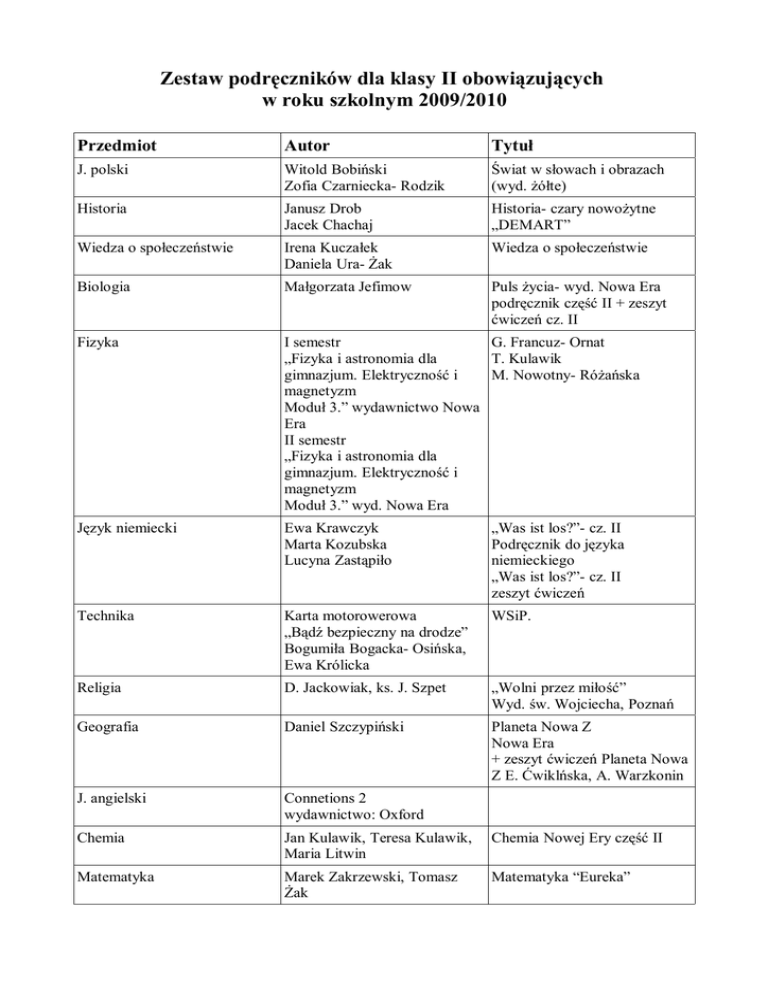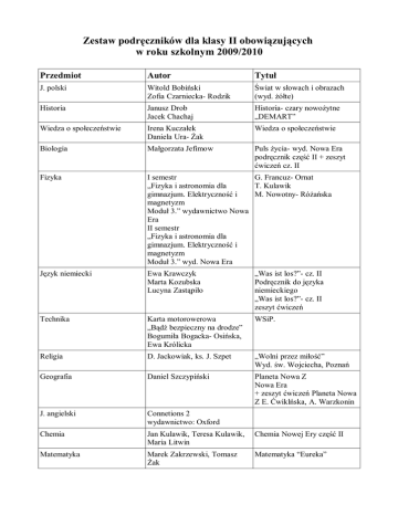 Zestaw podręczników dla klasy II obowiązujących w roku szkolnym 2009/2010 Przedmiot Autor Tytuł J. polski Witold Bobiński Zofia Czarniecka- Rodzik Świat w słowach i obrazach (wyd. żółte) Historia Janusz Drob Jacek Chachaj Historia- czary nowożytne „DEMART” Wiedza o społeczeństwie Irena Kuczałek Daniela Ura- Żak Wiedza o społeczeństwie Biologia Małgorzata Jefimow Puls życia- wyd. Nowa Era podręcznik część II + zeszyt ćwiczeń cz. II Fizyka I semestr G. Francuz- Ornat „Fizyka i astronomia dla T. Kulawik gimnazjum. Elektryczność i M. Nowotny- Różańska magnetyzm Moduł 3.” wydawnictwo Nowa Era II semestr „Fizyka i astronomia dla gimnazjum. Elektryczność i magnetyzm Moduł 3.” wyd. Nowa Era Język niemiecki Ewa Krawczyk Marta Kozubska Lucyna Zastąpiło „Was ist los?”- cz. II Podręcznik do języka niemieckiego „Was ist los?”- cz. II zeszyt ćwiczeń Technika Karta motorowerowa „Bądź bezpieczny na drodze” Bogumiła Bogacka- Osińska, Ewa Królicka WSiP. Religia D. Jackowiak, ks. J. Szpet „Wolni przez miłość” Wyd. św. Wojciecha, Poznań Geografia Daniel Szczypiński Planeta Nowa Z Nowa Era + zeszyt ćwiczeń Planeta Nowa Z E. Ćwiklńska, A. Warzkonin J. angielski Connetions 2 wydawnictwo: Oxford Chemia Jan Kulawik, Teresa Kulawik, Maria Litwin Chemia Nowej Ery część II Matematyka Marek Zakrzewski, Tomasz Żak Matematyka “Eureka”