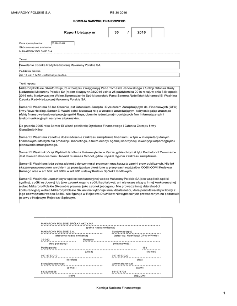 MAKARONY POLSKIE S.A. RB 30 2016 KOMISJA NADZORU FINANSOWEGO Raport bieżący nr 30 / 2016 2016-11-04 Data sporządzenia: Skróc ona nazwa emitenta MAKARONY POLSKIE S.A. Temat Powołanie członka Rady Nadzorczej Makarony Polskie SA. Podstawa prawna Art. 17 ust. 1 MAR - informac je poufne. Treść raportu: Makarony Polskie SA informuje, że w związku z rezygnacją Pana Tomasza Janowskiego z funkcji Członka Rady Nadzorczej Makarony Polskie SA (raport bieżący nr 28/2016 z dnia 25 października 2016 roku), w dniu 3 listopada 2016 roku Nadzwyczajne Walne Zgromadzenie Spółki powołało Pana Samera Abdelfatah Mohamed El Waziri na Członka Rady Nadzorczej Makarony Polskie SA. Samer El Waziri ma 56 lat. Obecnie jest Członkiem Zarządu i Dyrektorem Zarządzającym ds. Finansowych (CFO) firmy Raya Holding. Samer El Waziri pełnił kluczową rolę w zespole zarządzającym, który osiągając znaczące efekty finansowe budował pozycję spółki Raya, obecnie jednej z najmocniejszych firm informatycznych i telekomunikacyjnych na rynku afrykańskim. Do grudnia 2005 roku Samer El Waziri pełnił rolę Dyrektora Finansowego i Członka Zarządu firmy GlaxoSmithKline. Samer El Waziri ma 29-letnie doświadczenie z zakresu zarządzania finansami, w tym w interpretacji danych finansowych istotnych dla produkcji i marketingu, a także oceny i ogólnej koordynacji inwestycji korporacyjnych i planowania strategicznego. Samer El Waziri ukończył Wydział Handlu na Uniwersytecie w Kairze, gdzie otrzymał tytuł Bachelor of Commerce. Jest również absolwentem Harvard Business School, gdzie uzyskał dyplom z zakresu zarządzania. Samer El Waziri posiada pełną zdolność do czynności prawnych oraz korzysta z pełni praw publicznych. Nie był skazany prawomocnym wyrokiem za przestępstwo określone w przepisach rozdziałów XXXIII-XXXVII Kodeksu Karnego oraz w art. 587, art. 590 i w art. 591 ustawy Kodeks Spółek Handlowych. Samer El Waziri nie uczestniczy w spółce konkurencyjnej wobec Makarony Polskie SA jako wspólnik spółki cywilnej, spółki osobowej lub jako członek organu spółki kapitałowej, ani nie uczestniczy w innej konkurencyjnej wobec Makarony Polskie SA osobie prawnej jako członek jej organu. Nie prowadzi innej działalności konkurencyjnej wobec Makarony Polskie SA, ani nie wykonuje innej działalności, która pozostawałaby w kolizji z jego obowiązkami wobec Spółki. Nie figuruje w Rejestrze Dłużników Niewypłacalnych prowadzonym na podstawie ustawy o Krajowym Rejestrze Sądowym. MAKARONY POLSKIE SPÓŁKA AKCYJNA (pełna nazwa emitenta) MAKARONY POLSKIE S.A. Spożywc zy (spo) (skróc ona nazwa emitenta) 35-082 (sektor wg. klasyfikac ji GPW w W-wie) Rzeszów (kod poc ztowy) (miejscowość) Podkarpac ka 15a (ulica) 017 8753010 (numer) 017 8753020 (telefon) [email protected] (fax) www.makarony.pl (e-mail) 8133278856 (www) 691674708 (NIP) (REGON) Komisja Nadzoru Finansowego 1 MAKARONY POLSKIE S.A. RB 30 2016 PODPISY OSÓB REPREZENTUJĄCYCH SPÓŁKĘ Data Imię i Nazwisko Stanowisko/Funkc ja 2016-11-04 Beata Majewska-Karp Prokurent 2016-11-04 Piotr Wyszecki Prokurent Podpis Komisja Nadzoru Finansowego 2