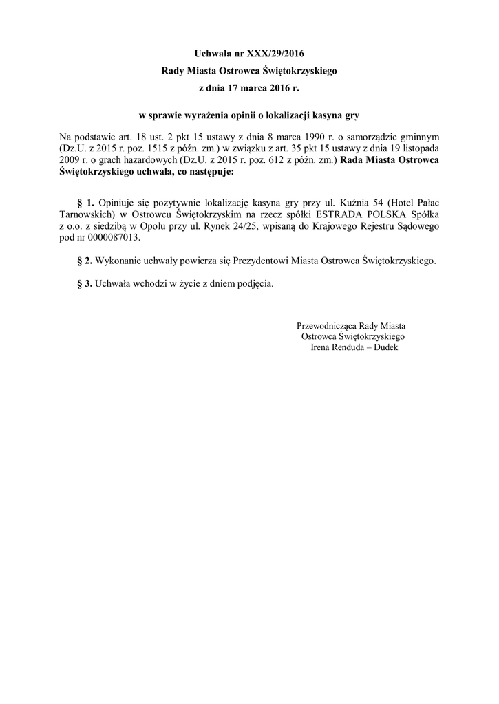 Uchwała nr XXX/29/2016 Rady Miasta Ostrowca Świętokrzyskiego z dnia 17 marca 2016 r. w sprawie wyrażenia opinii o lokalizacji kasyna gry Na podstawie art. 18 ust. 2 pkt 15 ustawy z dnia 8 marca 1990 r. o samorządzie gminnym (Dz.U. z 2015 r. poz. 1515 z późn. zm.) w związku z art. 35 pkt 15 ustawy z dnia 19 listopada 2009 r. o grach hazardowych (Dz.U. z 2015 r. poz. 612 z późn. zm.) Rada Miasta Ostrowca Świętokrzyskiego uchwala, co następuje: § 1. Opiniuje się pozytywnie lokalizację kasyna gry przy ul. Kuźnia 54 (Hotel Pałac Tarnowskich) w Ostrowcu Świętokrzyskim na rzecz spółki ESTRADA POLSKA Spółka z o.o. z siedzibą w Opolu przy ul. Rynek 24/25, wpisaną do Krajowego Rejestru Sądowego pod nr 0000087013. § 2. Wykonanie uchwały powierza się Prezydentowi Miasta Ostrowca Świętokrzyskiego. § 3. Uchwała wchodzi w życie z dniem podjęcia. Przewodnicząca Rady Miasta Ostrowca Świętokrzyskiego Irena Renduda – Dudek