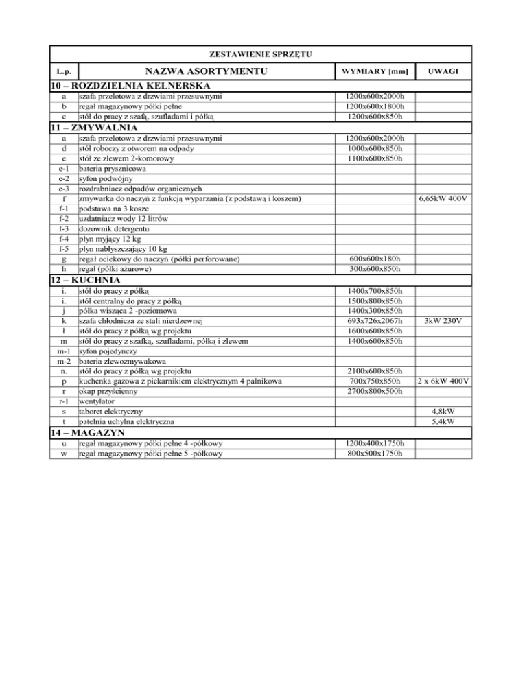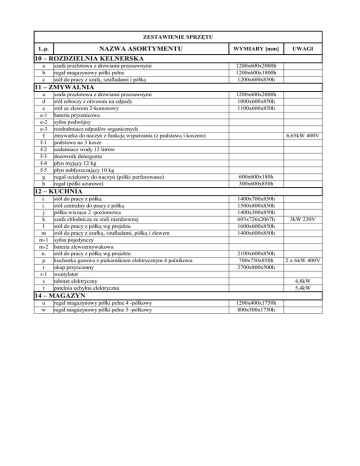 ZESTAWIENIE SPRZĘTU NAZWA ASORTYMENTU L.p. WYMIARY [mm] UWAGI 10 – ROZDZIELNIA KELNERSKA a b c szafa przelotowa z drzwiami przesuwnymi regał magazynowy półki pełne stół do pracy z szafą, szufladami i półką 1200x600x2000h 1200x600x1800h 1200x600x850h 11 – ZMYWALNIA a d e e-1 e-2 e-3 f f-1 f-2 f-3 f-4 f-5 g h szafa przelotowa z drzwiami przesuwnymi stół roboczy z otworem na odpady stół ze zlewem 2-komorowy bateria prysznicowa syfon podwójny rozdrabniacz odpadów organicznych zmywarka do naczyń z funkcją wyparzania (z podstawą i koszem) podstawa na 3 kosze uzdatniacz wody 12 litrów dozownik detergentu płyn myjący 12 kg płyn nabłyszczający 10 kg regał ociekowy do naczyń (półki perforowane) regał (półki ażurowe) 1200x600x2000h 1000x600x850h 1100x600x850h 6,65kW 400V 600x600x180h 300x600x850h 12 – KUCHNIA i. i. j k ł m m-1 m-2 n. p r r-1 s t stół do pracy z półką stół centralny do pracy z półką półka wisząca 2 -poziomowa szafa chłodnicza ze stali nierdzewnej stół do pracy z półką wg projektu stół do pracy z szafką, szufladami, półką i zlewem syfon pojedynczy bateria zlewozmywakowa stół do pracy z półką wg projektu kuchenka gazowa z piekarnikiem elektrycznym 4 palnikowa okap przyścienny wentylator taboret elektryczny patelnia uchylna elektryczna 1400x700x850h 1500x800x850h 1400x300x850h 693x726x2067h 1600x600x850h 1400x600x850h 2100x600x850h 700x750x850h 2700x800x500h regał magazynowy półki pełne 4 -półkowy regał magazynowy półki pełne 5 -półkowy 2 x 6kW 400V 4,8kW 5,4kW 14 – MAGAZYN u w 3kW 230V 1200x400x1750h 800x500x1750h