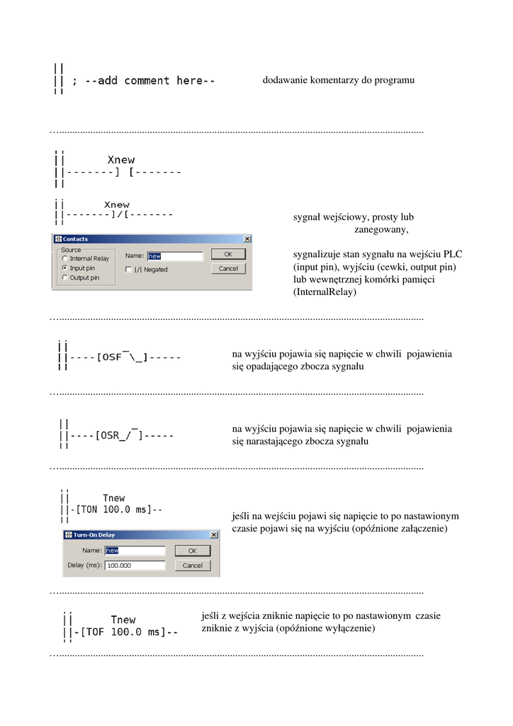 dodawanie komentarzy do programu …............................................................................................................................................. sygnał wejściowy, prosty lub zanegowany, sygnalizuje stan sygnału na wejściu PLC (input pin), wyjściu (cewki, output pin) lub wewnętrznej komórki pamięci (InternalRelay) …............................................................................................................................................. na wyjściu pojawia się napięcie w chwili pojawienia się opadającego zbocza sygnału …............................................................................................................................................. na wyjściu pojawia się napięcie w chwili pojawienia się narastającego zbocza sygnału …............................................................................................................................................. jeśli na wejściu pojawi się napięcie to po nastawionym czasie pojawi się na wyjściu (opóźnione załączenie) …............................................................................................................................................. jeśli z wejścia zniknie napięcie to po nastawionym czasie zniknie z wyjścia (opóźnione wyłączenie) …............................................................................................................................................. jeśli na wejściu przez czas nastawiony lub większy jest sygnał to przedostaje się na wyjście …............................................................................................................................................. licznik zliczający w górę, przepuszcza sygnał jeśli zliczy nastawioną liczbę impulsów licznik zliczający w dół, przepuszcza sygnał jeśli pozostanie nie mniej niż nastawiona liczba impulsów liczy do wartości nastawionej a później zeruje się i zlicza od początku …............................................................................................................................................. sygnał przechodzi jeśli zmienna równa wartości nastawionej sygnał przechodzi jeśli zmienna różna od wartości nastawionej sygnał przechodzi jeśli zmienna większa od wartości nastawionej sygnał przechodzi jeśli zmienna większa lub równa wartości nastawionej sygnał przechodzi jeśli zmienna mniejsza od wartości nastawionej sygnał przechodzi jeśli zmienna mniejsza lub równa wartości nastawionej …............................................................................................................................................. jeśli nie dociera do niego sygnał wszystkie następujące po nim szczeble drabiny są pomijane aż do kolejnej instrukcji tego typu …............................................................................................................................................. go kasuje i taki już pozostaje) sygnał wyjściowy, może być prosty lub zanegowany, może dotyczyć sygnału wyjściowego (pin on MCU) lub stanu wewnętrznej komórki pamięci (InternalRelay), może być typu set only (sygnał z wejścia może go ustawić w stan wysoki i już taki pozostanie) lub reset only (sygnał wejściowy …............................................................................................................................................. służy do resetowania liczników i czasomierzy (timerów) (oczywiście jeśli na wejściu pojawi się sygnał) …............................................................................................................................................. służy do przemieszczania danych ze źródła (src) do przeznaczenia (dest) …............................................................................................................................................. dodawanie mnożenie dzielenie deklarujemy rejestr (uporządkowany ciąg zmiennych) w tym przypadku składający się z 7 – dmiu zmiennych reg0reg6 każde narastające zbocze sygnału pojawiające się na wejściu powoduje następująca operację reg6=reg5, reg5=reg4, …. reg1 = reg0, reg0 pozostaje bez zmian …............................................................................................................................................. ciąg zmiennych, jeśli na wejściu pojawi się sygnał to zmienna dest przyjmuje wartość zmiennej o numerze index przykład: tablica to zestaw znaków”poniedzialek” jeśli index=3 i na wejściu instrukcji pojawi się sygnał to dest = n (bo „n” to trzeci znak słowa poniedziałek) …............................................................................................................................................. słuzy do aproksymowania funkcji lub krzywych łamaną np. jeśli: f(0) = 2 f(5) = 10 f(10) = 50 f(100) = 100 to znaczy , że punkty (x0, y0) = ( 0, 2) (x1, y1) = ( 5, 10) (x2, y2) = ( 10, 50) (x3, y3) = (100, 100) …............................................................................................................................................. wysyłanie ciągu znaków przez RS232 …............................................................................................................................................. odbiór znaku z portu RS232 jeśli na wejściu pojawi się sygnał to czyta z RS232 jeśli brak znaku to stan wyjścia jest zerowy, jeśli odczyta znak ASCII, to jego wartość jest przechowywana w zmiennej „var" a na wyjściu pojawia się sygnał, odbywa się to dla każdego cyklu PLC. …............................................................................................................................................. wysyłanie znaku przez port RS232 w czasie wysyłania na wyjściu pojawia się sygnał zajętości ….......................................................................