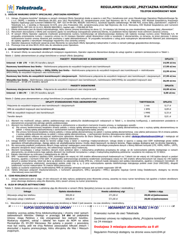 REGULAMIN USŁUGI „PRZYJAZNA KOMÓRKA' TELEFON KOMÓRKOWY NOM 1. OGÓLNE WARUNKI OFERTY SPECJALNEJ „PRZYJAZNA KOMÓRKA” 1.1. Usługa „Przyjazna komórka” dostępna w ramach niniejszej Oferty Specjalnej działa w oparciu o sieć Plus i świadczona jest przez Niezależnego Operatora Międzystrefowego Sp. z o.o. (NOM), z siedzibą w Warszawie 04-203, przy ulicy Murmańskiej 25, zarejestrowaną przez Sąd Rejonowy dla m. st. Warszawy, XIII Wydział Gospodarczy Krajowego Rejestru Sądowego pod numerem 0000037701, NIP: 522-24-99-304, REGON: 016144212, wysokość kapitału zakładowego: 90 000 PLN, zwana dalej „Operatorem”, wspólnie z Telestrada S.A., z siedzibą w Warszawie 02-670, przy ulicy Puławskiej 182, zarejestrowaną przez Sąd Rejonowy dla m.st. Warszawy, XIII Wydział Gospodarczy pod numerem 0000279791, NIP 544-10-14-413, REGON 006229011, kapitał zakł. 1.558.869,50 PLN. 1.2. Oferta skierowana jest do klienta indywidualnego, który zawrze Umowę terminową na okres 12, 24 miesięcy lub Umowę na czas nieokreślony, zwanego dalej „Abonentem”. 1.3. Warunkiem skorzystania z Oferty jest wyrażenie zgody na weryfikację wiarygodności płatniczej klienta, na podstawie której Operator może odmówić zawarcia umowy. 1.4. W ramach Oferty Operator zapewnia możliwość przeniesienia numeru komórkowego od dotychczasowego dostawcy lub nadania nowego numeru przez Telestrada S.A. W przypadku przeniesienia numeru i zawarcia umowy na 24 miesiące Operator udzieli Abonentowi zniżki w wysokości 3 abonamentów, co oznacza, że przez pierwsze 3 okresy rozliczeniowe trwania umowy Abonent jest zwolniony z opłat abonamentowych. W przypadku korzystania z usług poza wykupionym abonamentem Abonent jest zobowiązany do zapłaty zgodnie z warunkami niniejszego regulaminu oraz zawartej umowy. 1.5. Operator dopuszcza możliwość zawarcia przez Abonenta na warunkach Oferty Specjalnej maksymalnie 3 umów w ramach jednego gospodarstwa domowego. 1.6. Promocja trwa od dnia 08.01.2016 roku do odwołania przez Operatora. 2. USŁUGI DOSTĘPNE W RAMACH OFERTY SPECJALNEJ 2.1. W ramach Oferty na warunkach określonych niniejszym regulaminem, Operator zapewnia Abonentowi dostęp do usługi zgodnie z opłatami zamieszczonymi w Tabeli 1. Tabela 1: Opłaty abonamentowe za usługi komórkowe w ramach Oferty Specjalnej. PAKIETY PODSTAWOWE W ABONAMENCIE OPŁATA Internet 4 GB LTE - 4 GB LTE transferu danych 14,99 zł/mc Rozmowy komórkowe bez limitu – Nielimitowane połączenia do wszystkich krajowych sieci komórkowych 17,99 zł/mc Rozmowy komórkowe bez limitu + SMSy/MMSy bez limitu – Nielimitowane połączenia do wszystkich krajowych sieci komórkowych + nielimitowane SMSY/MMSy do wszystkich krajowych sieci komórkowych 22,99 zł/mc Rozmowy bez limitu do wszystkich komórkowych i stacjonarnych - Nielimitowane połączenia do wszystkich krajowych sieci komórkowych i stacjonarnych 27,99 zł/mc Wszystko bez limitu - Nielimitowane połączenia do wszystkich krajowych sieci komórkowych, nielimitowane SMSY/MMSy do wszystkich krajowych sieci komórkowych , 10 GB LTE transferu danych 36,99 zł/mc PAKIETY DODATKOWE OPŁATA Rozmowy stacjonarne bez limitu - Połączenia do wszystkich krajowych sieci stacjonarnych 10,00 zł/mc Internet 1 GB LTE - 1 GB LTE transferu danych 5,00 zł/mc Tabela 2: Opłaty poza abonamentem za usługi komórkowe (w przypadku braku wykupienia usługi w pakiecie). TARYFIKACJA OPŁATA Połączenia do wszystkich krajowych sieci komórkowych i stacjonarnych OPŁATY STANDARDOWE POZA ABONAMENTEM 1 min 0,17 zł SMS do wszystkich krajowych sieci komórkowych 1 SMS 0,09 zł MMS do wszystkich krajowych sieci komórkowych 1 MMS 0,33 zł Transfer danych 50 kB 0,01 zł 2.2. Abonent ma możliwość zakupu pakietu podstawowego oraz pakietu/ów dodatkowego/ych wskazanych w Tabeli 1, w dowolnej konfiguracji, z zastrzeżeniem posiadania w abonamencie przynajmniej jednego pakietu podstawowego. 2.3. Abonent ma możliwość zmiany pakietu dostępnego w abonamencie w dowolnym momencie trwania umowy, w następujący sposób: a) Dla umowy bezterminowej bezpłatna zmiana pakietu z niższą opłatą abonamentową na pakiet z wyższą opłatą abonamentową oraz z wyższą opłatą abonamentową na pakiet z niższą opłatą abonamentową z zachowaniem terminu obowiązywania takiej umowy. b) Dla umowy terminowej bezpłatna zmiana pakietu z niższą opłatą abonamentową na pakiet z wyższą opłatą abonamentową oraz płatna jednorazowo 50 zł zmiana pakietu z wyższą opłatą abonamentową na pakiet z niższą opłatą abonamentową, z zachowaniem terminu obowiązywania takiej umowy. c) zmiana pakietu odbywa się poprzez telefoniczne zgłoszenie Abonenta do Biura Obsługi Klienta lub mailowo na adres [email protected] i następuje od kolejnego okresu rozliczeniowego, w którym zgłoszenia dokonano. 2.4. Usługa telefonii komórkowej działa na terenie całego kraju a także w roamingu międzynarodowym. Usługa działa w oparciu o zasięg sieci GSM wybranego przez siebie operatora infrastrukturalnego. Zasięg zależy od ukształtowania terenu i liczby stacji bazowych na danym terenie. Mapa zasięgu dostępna jest na stronie Operatora. 2.5. Na rzeczywistą prędkość przesyłania danych mogą wpłynąć następujące uwarunkowania: technologia przesyłania danych z której Abonent korzysta (LTE, HSPA, HSPA+, UMTS, aktualne obciążenie stacji nadawczej, siła odbieranego sygnału stacji nadawczej. 2.6. Abonent korzystający z usługi transferu danych może pobierać dane z maksymalną prędkością przypisaną do usługi, aż do wykorzystania pakietu dostępnego w ramach abonamentu, po przekroczeniu tego pakietu Abonent ma możliwość korzystania z usługi z maksymalną prędkością pobierania i wysyłania nie większą niż 32 kbit/s. 2.7. Pakiety internetowe są rozliczane z dokładnością do 100 kB. 2.8. SMS - wiadomość wysyłana z telefonu GSM, zawierająca nie więcej niż 160 znaków alfanume