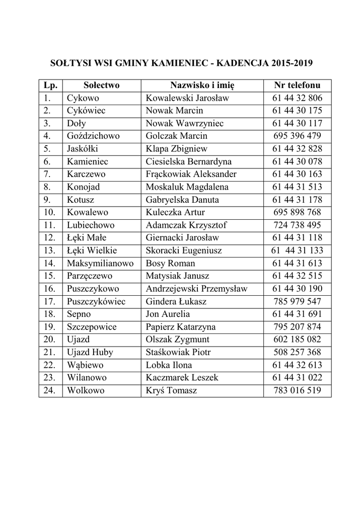 SOŁTYSI WSI GMINY KAMIENIEC - KADENCJA 2015-2019 Lp. 1. 2. 3. 4. 5. 6. 7. 8. 9. 10. 11. 12. 13. 14. 15. 16. 17. 18. 19. 20. 21. 22. 23. 24. Sołectwo Cykowo Cykówiec Doły Goździchowo Jaskółki Kamieniec Karczewo Konojad Kotusz Kowalewo Lubiechowo Łęki Małe Łęki Wielkie Maksymilianowo Parzęczewo Puszczykowo Puszczykówiec Sepno Szczepowice Ujazd Ujazd Huby Wąbiewo Wilanowo Wolkowo Nazwisko i imię Kowalewski Jarosław Nowak Marcin Nowak Wawrzyniec Golczak Marcin Klapa Zbigniew Ciesielska Bernardyna Frąckowiak Aleksander Moskaluk Magdalena Gabryelska Danuta Kuleczka Artur Adamczak Krzysztof Giernacki Jarosław Skoracki Eugeniusz Bosy Roman Matysiak Janusz Andrzejewski Przemysław Gindera Łukasz Jon Aurelia Papierz Katarzyna Olszak Zygmunt Staśkowiak Piotr Lobka Ilona Kaczmarek Leszek Kryś Tomasz Nr telefonu 61 44 32 806 61 44 30 175 61 44 30 117 695 396 479 61 44 32 828 61 44 30 078 61 44 30 163 61 44 31 513 61 44 31 178 695 898 768 724 738 495 61 44 31 118 61 44 31 133 61 44 31 613 61 44 32 515 61 44 30 190 785 979 547 61 44 31 691 795 207 874 602 185 082 508 257 368 61 44 32 613 61 44 31 022 783 016 519 Szanowni mieszkańcy Gminy Kamieniec Mija kolejny rok działalności samorządowej. Nadszedł czas podsumowań i planów na Nowy 2016 rok. Zgodnie z ubiegłoroczną zapowiedzią jesteśmy w trakcie opracowywania nowego studium uwarunkowań i kierunków zagospodarowania przestrzennego gminy. Prace te powinniśmy w przyszłym roku zakończyć. Aktualnie trwają prace dokumentacyjne dotyczące budowy dwóch inwestycji w Kamieńcu – oczyszczalni ścieków oraz nowego przedszkola. Nowa perspektywa finansowania inwestycji ze środków unijnych daje gminie duże szanse na pozyskanie środków pozabudżetowych na te przedsięwzięcia. Zadania te są dla gminy priorytetowe ze względu na zły stan techniczny istniejącej oczyszczalni oraz brak miejsc w przedszkolu, a do roku 2017 gmina musi zapewnić opiekę przedszkolną dzieciom 3,4,5 letnim. Wychodząc naprzeciw oczekiwaniom mieszkańców będziemy kontynuować budowę dróg gminnych, które mogą być nie tylko dojazdem do posesji, gruntów rolnych, ale również rekreacyjnym szlakiem spacerowym, bądź rowerowym. Od 5 lat gmina realizuje fundusz obywatelski. Zadania w ramach funduszu sołeckiego dają mieszkańcom możliwość decydowania o wydatkowaniu tych środków. W 2015 r. zrealizowano z funduszu przedsięwzięcia na łączną kwotę 285 000 zł. Proszę o aktywność i udział w zebraniach wiejskich, na których podejmowane są uchwały w sprawie funduszu sołeckiego. Wspólnie wypracowane decyzje inwestycyjne przyczyniają się do dalszego rozwoju naszej gminy i powodują coraz lepsze warunki życia naszej lokalnej społeczności. Na mój wniosek, Radni Gminy Kamieniec podjęli uchwały o nie podnoszeniu podatków na rok 2016. Z poważaniem Wójt Gminy /-/ Piotr Halasz 2 INWESTYCJE W GMINIE KAMIENIEC W 2015r. 1. Budowa budynku socjalno – technicznego z garażami i budynku odwadniania osadu na terenie oczyszczalni ścieków w Kamieńcu –II etap W ramach inwestycji wybudowano budynek socjalno – techniczny z garażami oraz budynek odwadniania osadu wraz z niezbędnym przyłączami wyposażeniem, kanalizacji sanitarnej i sieci wodociągowej na terenie oczyszczalni ścieków w Kamieńcu. W bieżącym roku wykonano II etap prac polegający na wykończeniu budynków będących w stanie surowym zamkniętym. Całkowity koszt inwestycji: 1.871.100 zł. Inwestycja została dofinansowana z Europejskiego Funduszu Rolnego Rozwoju Obszarów Wiejskich w kwocie 754.733 zł. 2. Budowa boiska ze sztucznej trawy oraz placu zabaw w miejscowości Sepno W ramach projektu wybudowano: - boisko o wymiarach 92 x 47 m (pole gry 90 x 45 m) z trawy syntetycznej o wys. 40 mm zasypanej pisakiem kwarcowym oraz granulatem gumowym EPDM wraz z podkładem elastycznym o gr. 20 mm na podbudowie tłuczniowej. Za bramkami wykonano piłkochwyty z siatki polipropylenowej na słupach stalowych ocynkowanych i powlekanych o wysokości 6 m, - plac zabaw o wymiarach 27 x 15m, wyposażony w metalowe urządzenia zabawowe, takie jak: urządzenie wspinaczkowe, huśtawka wahadłowa dwuosobowa, huśtawka wagowa, karuzela, bujak dwuosobowy i pojedynczy, ławki, kosze oraz tablicę z regulaminem. Plac ogrodzono płotem o wysokości 1,2 m. 3 Całkowity koszt inwestycji: 988.920 zł. Inwestycja została dofinansowana z Europejskiego Funduszu Rolnego Rozwoju Obszarów Wiejskich w kwocie 500.000 zł. 3. Zakup średniego samochodu pożarniczo – gaśniczego dla OSP Kamieniec Przedmiotem projektu był zakup średniego samochodu nowego ratowniczo-gaśniczego, który został przekazany do eksploatacji jednostce Ochotniczej Straży Pożarnej w Kamieńcu. Samochód posiada między innymi: stały napęd 4x4, działko wodno- pianowe z deflektorem o regulowanej wydajności, zbiornik wody o pojemności ponad 3 m3, zbiornik pianotwórczy i autopompę dwuzakresową. W skład dodatkowego wyposażenia weszły również: motopompa szlamowa, motopompa pływająca, piła łańcuchowa oraz agregat prądotwórczy. Całkowity koszt inwestycji: 769.500 zł. Inwestycja została dofinansowana z Wielkopolskiego Regionalnego Programu Operacyjnego na lata 2007-2013 w kwocie 615.600 zł. 4. Remont drogi w miejscowości Kamieniec (ul. Szkolna) W ramach inwestycji wykonano nawierzchnię bitumiczną na podbudowie tłuczniowej oraz wykonano oznakowanie pionowe. Łącznie przebudowano 950 m drogi o szerokości 5 m. Całkowity koszt inwestycji to 659.000 zł Przebudowa była współfinansowana przez Urząd Marszałkowski Województwa Wielkopolskiego, który w ramach programu przebudowy dróg do gruntów rolnych przekazał 150.000 zł. 4 5. Budowa placu zabaw w miejscowości Doły Inwestycja była współfinansowana z darowizn przekazanych przez ponad 70 darczyńców oraz Gminę Kamieniec. Łączna kwota darowizn wyniosła 16.700 zł. Całkowity koszt inwestycji to 23.329 zł. Dzięki zaangażowaniu so
