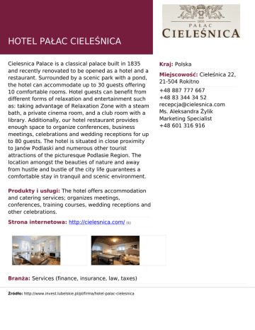 HOTEL PAŁAC CIELEŚNICA Cielesnica Palace is a classical palace built in 1835 and recently renovated to be opened as a hotel and a restaurant. Surrounded by a scenic park with a pond, the hotel can accommodate up to 30 guests offering 10 comfortable rooms. Hotel guests can benefit from different forms of relaxation and entertainment such as: taking advantage of Relaxation Zone with a steam bath, a private cinema room, and a club room with a library. Additionally, our hotel restaurant provides enough space to organize conferences, business meetings, celebrations and wedding receptions for up to 80 guests. The hotel is situated in close proximity to Janów Podlaski and numerous other tourist attractions of the picturesque Podlasie Region. The location amongst the beauties of nature and away from hustle and bustle of the city life guarantees a comfortable stay in tranquil and scenic environment. Produkty i usługi: The hotel offers accommodation and catering services; organizes meetings, conferences, training courses, wedding receptions and other celebrations. Strona internetowa: http://cielesnica.com/ [1] Branża: Services (finance, insurance, law, taxes) Źródło: http://www.invest.lubelskie.pl/pl/firma/hotel-palac-cielesnica Kraj: Polska Miejscowość: Cieleśnica 22, 21-504 Rokitno +48 887 777 667 +48 83 344 34 52 [email protected] Ms. Aleksandra Żylik Marketing Specialist +48 601 316 916