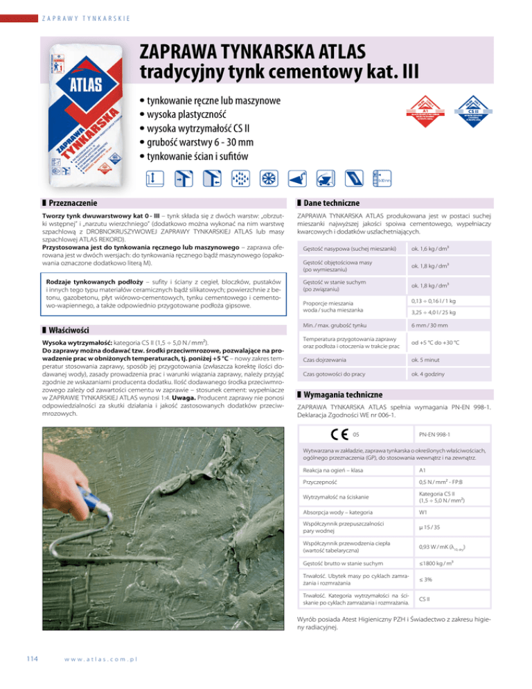 Z A P R AW Y T Y N K A R S K I E ZAPRAWA TYNKARSKA ATLAS tradycyjny tynk cementowy kat. III • tynkowanie ręczne lub maszynowe • wysoka plastyczność • wysoka wytrzymałość CS II • grubość warstwy 6 - 30 mm • tynkowanie ścian i sufitów ■ Przeznaczenie ■ Dane techniczne Tworzy tynk dwuwarstwowy kat 0 - III – tynk składa się z dwóch warstw: „obrzutki wstępnej” i „narzutu wierzchniego” (dodatkowo można wykonać na nim warstwę szpachlową z DROBNOKRUSZYWOWEJ ZAPRAWY TYNKARSKIEJ ATLAS lub masy szpachlowej ATLAS REKORD). Przystosowana jest do tynkowania ręcznego lub maszynowego – zaprawa oferowana jest w dwóch wersjach: do tynkowania ręcznego bądź maszynowego (opakowania oznaczone dodatkowo literą M). ZAPRAWA TYNKARSKA ATLAS produkowana jest w postaci suchej mieszanki najwyższej jakości spoiwa cementowego, wypełniaczy kwarcowych i dodatków uszlachetniających. Rodzaje tynkowanych podłoży – sufity i ściany z cegieł, bloczków, pustaków i innych tego typu materiałów ceramicznych bądź silikatowych; powierzchnie z betonu, gazobetonu, płyt wiórowo-cementowych, tynku cementowego i cementowo-wapiennego, a także odpowiednio przygotowane podłoża gipsowe. ■ Właściwości Wysoka wytrzymałość: kategoria CS II (1,5 ÷ 5,0 N / mm²). Do zaprawy można dodawać tzw. środki przeciwmrozowe, pozwalające na prowadzenie prac w obniżonych temperaturach, tj. poniżej +5 °C – nowy zakres temperatur stosowania zaprawy, sposób jej przygotowania (zwłaszcza korektę ilości dodawanej wody), zasady prowadzenia prac i warunki wiązania zaprawy, należy przyjąć zgodnie ze wskazaniami producenta dodatku. Ilość dodawanego środka przeciwmrozowego zależy od zawartości cementu w zaprawie – stosunek cement: wypełniacze w ZAPRAWIE TYNKARSKIEJ ATLAS wynosi 1:4. Uwaga. Producent zaprawy nie ponosi odpowiedzialności za skutki działania i jakość zastosowanych dodatków przeciwmrozowych. Gęstość nasypowa (suchej mieszanki) ok. 1,6 kg / dm³ Gęstość objętościowa masy (po wymieszaniu) ok. 1,8 kg / dm³ Gęstość w stanie suchym (po związaniu) ok. 1,8 kg / dm³ Proporcje mieszania woda / sucha mieszanka 0,13 ÷ 0,16 l / 1 kg Min. / max. grubość tynku 6 mm / 30 mm Temperatura przygotowania zaprawy oraz podłoża i otoczenia w trakcie prac od +5 °C do +30 °C Czas dojrzewania ok. 5 minut Czas gotowości do pracy ok. 4 godziny 3,25 ÷ 4,0 l / 25 kg ■ Wymagania techniczne ZAPRAWA TYNKARSKA ATLAS spełnia wymagania PN-EN 998-1. Deklaracja Zgodności WE nr 006-1. 05 PN-EN 998-1 Wytwarzana w zakładzie, zaprawa tynkarska o określonych właściwościach, ogólnego przeznaczenia (GP), do stosowania wewnątrz i na zewnątrz. Reakcja na ogień – klasa A1 Przyczepność 0,5 N / mm² - FP:B Wytrzymałość na ściskanie Kategoria CS II (1,5 ÷ 5,0 N / mm²) Absorpcja wody – kategoria W1 Współczynnik przepuszczalności pary wodnej μ 15 / 35 Współczynnik przewodzenia ciepła (wartość tabelaryczna) 0,93 W / mK (λ10, dry) Gęstość brutto w stanie suchym ≤1800 kg / m³ Trwałość. Ubytek masy po cyklach zamrażania i rozmrażania ≤ 3% Trwałość. Kategoria wytrzymałości na ściskanie po cyklach zamrażania i rozmrażania. CS II Wyrób posiada Atest Higieniczny PZH i Świadectwo z zakresu higieny radiacyjnej. 114 www.atlas.com.pl Z A P R AW Y T Y N K A R S K I E ■ Tynkowanie Przygotowanie podłoża Podłoże powinno być suche, stabilne, równe i nośne, tzn. odpowiednio mocne, oczyszczone z warstw mogących osłabić przyczepność zaprawy, zwłaszcza z kurzu, brudu, wapna, olejów, tłuszczów, wosku, resztek środków antyadhezyjnych i farb. Słabo związane fragmenty powierzchni należy odkuć, zaś elementy luźne lub osypliwe usunąć szczotką stalową. Podłoża gipsowe należy przed tynkowaniem zarysować ostrym dłutem w gęstą, skośną siatkę tak, by głębokość rys wynosiła ok. 3 mm. Krawędzie styku płyt wiórowo-cementowych przed tynkowaniem należy wzmocnić pasami z nierdzewnej siatki metalowej. Narożniki oraz krawędzie przy otworach okiennych i drzwiowych należy zabezpieczyć poprzez osadzenie ocynkowanych profili stalowych. Jeżeli istnieje potrzeba redukcji chłonności podłoża, zaleca się stosowanie emulsji ATLAS UNI-GRUNT. Przygotowanie zaprawy Materiał z worka należy wsypać do czystego naczynia z odmierzoną ilością wody (proporcje podane w Danych Technicznych) i mieszać wiertarką z mieszadłem (lub w betoniarce), aż do uzyskania jednolitej konsystencji. W przypadku tynkowania maszynowego w agregacie tynkarskim. Rozrobioną zaprawę należy odstawić na 5 minut i ponownie wymieszać. Zaprawa nadaje się do użycia zaraz po wymieszaniu i należy ją wykorzystać w ciągu ok. 4 godzin. Narzucanie tynku Tynk należy wykonywać jako dwuwarstwowy. W uzyskaniu równych powierzchni tynku pomaga zastosowanie prowadzących listew tynkarskich. Mocuje się je mechanicznie bądź poprzez zatopienie w zaprawie (listwy siatkowe). Pierwszym etapem tynkowania jest wykonanie „obrzutki wstępnej”. Po jej związaniu (ale jeszcze przed stwardnieniem) należy wykonać „narzut wierzchni”. Tynk w obydwu etapach narzuca się równomiernie kielnią (lub agregatem tynkarskim). Nadmiar zaprawy należy zbierać pacą styropianową lub drewnianą i wrzucać z powrotem do naczynia. Świeży tynk można wyrównywać długą łatą, wykorzystując listwy prowadzące. Zacieranie tynku Moment przystąpienia do zacierania należy określić doświadczalnie tak, aby nie nastąpiło zbytnie przesuszenie powierzchni tynku. Zacieranie wykonuje się z reguły po nałożeniu dodatkowej, cienkiej warstwy zaprawy, odpowiadającej grubości kruszywa. Prace wykończeniowe należy wykonywać zgodnie z technologią robót tynkarskich, stosując narzędzia odpowiednie do oczekiwanego efektu wykończenia i przeznaczenia tynku. Jeżeli tynk ma stanowić podłoże pod okładziny ceramiczne, nie należy go w ogóle zacierać l