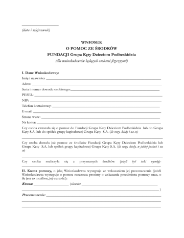_________________ (data i miejscowość) WNIOSEK O POMOC ZE ŚRODKÓW FUNDACJI Grupa Kęty Dzieciom Podbeskidzia (dla wnioskodawców będących osobami fizycznymi) I. Dane Wnioskodawcy: Imię i nazwisko: ______________________________________________________________ Adres: ______________________________________________________________________ Seria i numer dowodu osobistego:________________________________________________ PESEL: _____________________________________________________________________ NIP: _______________________________________________________________________ Telefon kontaktowy: __________________________________________________________ E-mail: _____________________________________________________________________ Strona www: ________________________________________________________________ Nr konta: ___________________________________________________________________ Czy osoba zwracała się o pomoc do Fundacji Grupa Kety Dzieciom Podbeskidzia lub do Grupa Kęty S.A. lub do spółek grupy kapitałowej Grupa Kęty S.A. (ile razy, kiedy i na co) ____________________________________________________________________________ Czy osoba dostała już pomoc ze środków Fundacji Grupa Kęty Dzieciom Podbeskidzia lub Grupa Kęty S.A. lub spółek grupy kapitałowej Grupa Kęty S.A. (ile razy, kiedy, w jakiej postaci i na co) ____________________________________________________________________________ Czy osoba rozliczyła się z przyznanych środków (jeżeli był taki wymóg)___________________________________________________________________________ II. Kwota pomocy, o jaką Wnioskodawca występuje ze wskazaniem jej przeznaczenia (jeżeli Wnioskodawca występuje o pomoc rzeczową prosimy o wskazanie przedmiotu pomocy oraz, o ile jest to możliwe, jej wartości): Kwota: ___________________ (słownie: _________________________________________ __________________________________________________________________________ ) Przeznaczenie: ______________________________________________________________ ___________________________________________________________________________ ___________________________________________________________________________ Uzasadnienie: (prosimy o uzasadnienie celu na jaki ma być przyznana pomoc) ___________________________________________________________________________ ___________________________________________________________________________ ___________________________________________________________________________ ___________________________________________________________________________ Ramowy budżet programu na który przeznaczona będzie dotacja: Koszt całkowity___________________________ PLN 100% Uzyskane darowizny/dotacje __________________PLN ___________ % Udział własny _____________________________PLN ____________ % Kwota brakująca ___________________________PLN ____________ % Referencje: (prosimy o wymienienie osób, instytucji zaangażowanych w projekt, osób lub instytucji od których osoba dostawała już wsparcie - nazwa organizacji, adres, telefon, osoba kontaktowa) _________________________________________________________________ ___________________________________________________________________________ Inne źródła finansowania: (organizacje i osoby oraz otrzymane lub obiecane kwoty) ___________________________________________________________________________ ___________________________________________________________________________ Zgodnie z ustawą z dnia 29 sierpnia 1997 roku o ochronie danych osobowych (tekst jednolity Dz. U. z 2002 roku, Nr 101, poz. 926), wyrażam zgodę na przetwarzanie moich danych osobowych zawartych w niniejszym wniosku (w tym danych wrażliwych określonych w art. 27 ust. 1 tej Ustawy). Oświadczam, że zostałam/em poinformowana/y, iż: - administratorem moich danych osobowych, przekazanych w związku ze złożonym wnioskiem będzie Fundacja „Grupa Kęty Dzieciom Podbeskidzia” z siedzibą w Bielsku-Białej (43-300), ul. Warszawska 153 i będzie przetwarzać je dla celów realizacji wniosku; - podanie moich danych osobowych jest dobrowolne; - przysługuje mi prawo dostępu do treści moich danych oraz ich poprawiania. _______________________ (data i podpis Wnioskodawcy) Niniejszy wniosek należy przesłać na adres Biura Fundacji Prosimy dołączyć informacje potwierdzające i uwiarygodniające wniosek i wnioskodawcę (np. informacje o dochodach/stanie materialnym rodziny, zaświadczenia lekarskie, itp.) Fundacja Grupa Kety Dzieciom Podbeskidzia ul Warszawska 153 , 43-300 Bielsko – Biała Tel. 0 33 8195107 , 0 33 8195108
