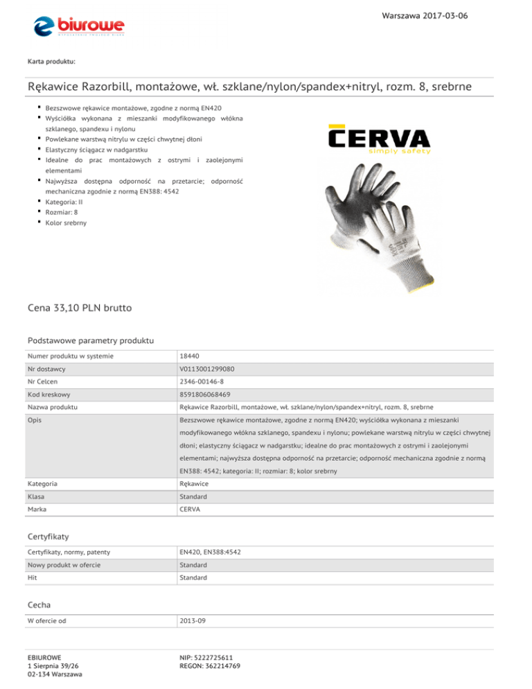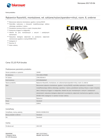 Warszawa 2017-03-06 Karta produktu: Rękawice Razorbill, montażowe, wł. szklane/nylon/spandex+nitryl, rozm. 8, srebrne Bezszwowe rękawice montażowe, zgodne z normą EN420 Wyściółka wykonana z mieszanki modyfikowanego włókna szklanego, spandexu i nylonu Powlekane warstwą nitrylu w części chwytnej dłoni Elastyczny ściągacz w nadgarstku Idealne do prac montażowych z ostrymi i zaolejonymi elementami Najwyższa dostępna odporność na przetarcie; odporność mechaniczna zgodnie z normą EN388: 4542 Kategoria: II Rozmiar: 8 Kolor srebrny Cena 33,10 PLN brutto Podstawowe parametry produktu Numer produktu w systemie 18440 Nr dostawcy V0113001299080 Nr Celcen 2346-00146-8 Kod kreskowy 8591806068469 Nazwa produktu Rękawice Razorbill, montażowe, wł. szklane/nylon/spandex+nitryl, rozm. 8, srebrne Opis Bezszwowe rękawice montażowe, zgodne z normą EN420; wyściółka wykonana z mieszanki modyfikowanego włókna szklanego, spandexu i nylonu; powlekane warstwą nitrylu w części chwytnej dłoni; elastyczny ściągacz w nadgarstku; idealne do prac montażowych z ostrymi i zaolejonymi elementami; najwyższa dostępna odporność na przetarcie; odporność mechaniczna zgodnie z normą EN388: 4542; kategoria: II; rozmiar: 8; kolor srebrny Kategoria Rękawice Klasa Standard Marka CERVA Certyfikaty Certyfikaty, normy, patenty EN420, EN388:4542 Nowy produkt w ofercie Standard Hit Standard Cecha W ofercie od 2013-09 EBIUROWE 1 Sierpnia 39/26 02-134 Warszawa NIP: 5222725611 REGON: 362214769 Warszawa 2017-03-06 Karta katalogowa produktu cd. Rękawice Razorbill, montażowe, wł. szklane/nylon/spandex+nitryl, rozm. 8, srebrne Materiał Włókno szklane/nylon Typ Montażowe Produkt Rękawice Rodzaj Standard Wspólny słownik zamówień CPV 18141000-9 Wymiary Rozmiar 8 Kolor Kolor Srebrny Serdecznie zapraszamy do współpracy EBIUROWE zespół. EBIUROWE 1 Sierpnia 39/26 02-134 Warszawa NIP: 5222725611 REGON: 362214769