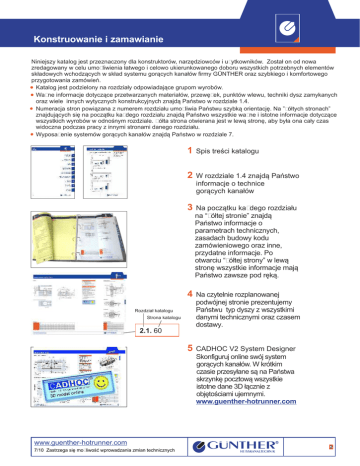 Konstruowanie i zamawianie Niniejszy katalog jest przeznaczony dla konstruktorów, narzędziowców i użytkowników. Został on od nowa zredagowany w celu umożliwienia łatwego i celowo ukierunkowanego doboru wszystkich potrzebnych elementów składowych wchodzących w skład systemu gorących kanałów firmy GÜNTHER oraz szybkiego i komfortowego przygotowania zamówień. Katalog jest podzielony na rozdziały odpowiadające grupom wyrobów. Ważne informacje dotyczące przetwarzanych materiałów, przewężek, punktów wlewu, techniki dysz zamykanych oraz wiele innych wytycznych konstrukcyjnych znajdą Państwo w rozdziale 1.4. Numeracja stron powiązana z numerem rozdziału umożliwia Państwu szybką orientację. Na ”żółtych stronach” znajdujących się na początku każdego rozdziału znajdą Państwo wszystkie ważne i istotne informacje dotyczące wszystkich wyrobów w odnośnym rozdziale. Żółta strona otwierana jest w lewą stronę, aby była ona cały czas widoczna podczas pracy z innymi stronami danego rozdziału. Wyposażenie systemów gorących kanałów znajdą Państwo w rozdziale 7. 1 Spis treści katalogu 2 W rozdziale 1.4 znajdą Państwo informacje o technice gorących kanałów 3 Na początku każdego rozdziału na “żółtej stronie” znajdą Państwo informacje o parametrach technicznych, zasadach budowy kodu zamówieniowego oraz inne, przydatne informacje. Po otwarciu “żółtej strony” w lewą stronę wszystkie informacje mają Państwo zawsze pod ręką. 4 Na czytelnie rozplanowanej podwójnej stronie prezentujemy Państwu typ dyszy z wszystkimi danymi technicznymi oraz czasem dostawy. 5 CADHOC V2 System Designer Skonfiguruj online swój system gorących kanałów. W krótkim czasie przesyłane są na Państwa skrzynkę pocztową wszystkie istotne dane 3D łącznie z objętościami ujemnymi. www.guenther-hotrunner.com Rozdział katalogu Strona katalogu 2.1. 60 www.guenther-hotrunner.com 7/10 Zastrzega się możliwość wprowadzania zmian technicznych 2