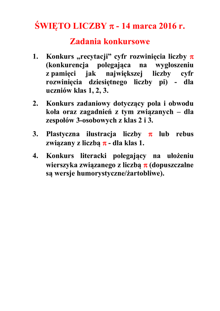 ŚWIĘTO LICZBY - 14 marca 2016 r. Zadania konkursowe 1. Konkurs „recytacji” cyfr rozwinięcia liczby (konkurencja polegająca na wygłoszeniu z pamięci jak największej liczby cyfr rozwinięcia dziesiętnego liczby pi) - dla uczniów klas 1, 2, 3. 2. Konkurs zadaniowy dotyczący pola i obwodu koła oraz zagadnień z tym związanych – dla zespołów 3-osobowych z klas 2 i 3. 3. Plastyczna ilustracja liczby lub rebus związany z liczbą - dla klas 1. 4. Konkurs literacki polegający na ułożeniu wierszyka związanego z liczbą (dopuszczalne są wersje humorystyczne/żartobliwe).