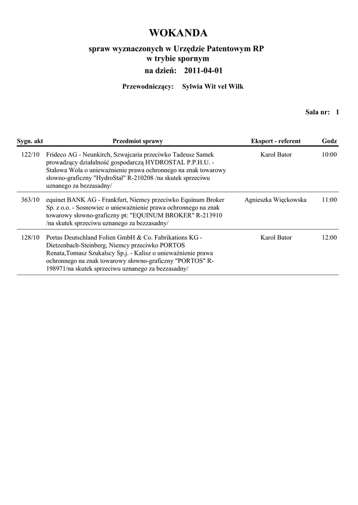 WOKANDA spraw wyznaczonych w Urzędzie Patentowym RP w trybie spornym na dzień: 2011-04-01 Przewodniczący: Sylwia Wit vel Wilk Sala nr: 1 Sygn. akt Przedmiot sprawy Ekspert - referent Godz 122/10 Frideco AG - Neunkirch, Szwajcaria przeciwko Tadeusz Samek prowadzący działalność gospodarczą HYDROSTAL P.P.H.U. Stalowa Wola o unieważnienie prawa ochronnego na znak towarowy słowno-graficzny "HydroStal" R-210208 /na skutek sprzeciwu uznanego za bezzasadny/ Karol Bator 10:00 363/10 equinet BANK AG - Frankfurt, Niemcy przeciwko Equinum Broker Sp. z o.o. - Sosnowiec o unieważnienie prawa ochronnego na znak towarowy słowno-graficzny pt: "EQUINUM BROKER" R-213910 /na skutek sprzeciwu uznanego za bezzasadny/ Agnieszka Więckowska 11:00 128/10 Portas Deutschland Folien GmbH & Co. Fabrikations KG Dietzenbach-Steinberg, Niemcy przeciwko PORTOS Renata,Tomasz Szukalscy Sp.j. - Kalisz o unieważnienie prawa ochronnego na znak towarowy słowno-graficzny "PORTOS" R198971/na skutek sprzeciwu uznanego za bezzasadny/ Karol Bator 12:00