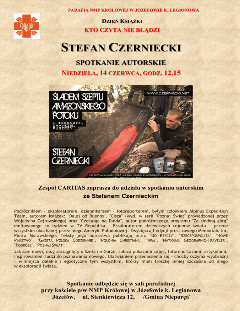 PARAFIA NMP KRÓLOWEJ W JÓZEFOWIE K. LEGIONOWA DZIEŃ KSIĄŻKI KTO CZYTA NIE BŁĄDZI STEFAN CZERNIECKI SPOTKANIE AUTORSKIE NIEDZIELA, 14 CZERWCA, GODZ. 12.15 Zespół CARITAS zaprasza do udziału w spotkaniu autorskim ze Stefanem Czernieckim Podróżnikiem - eksploratorem, dziennikarzem - fotoreporterem, byłym członkiem Alpinus Expedition Team, autorem książek: "Dalej od Buenos", "Cisza" (wyd. w serii "Poznaj Świat" prowadzonej przez Wojciecha Cejrowskiego) oraz "Czekając na Duida", autor podróżniczego programu "Za siódmą górą" emitowanego co tydzień w TV Republika. Eksploratorem dziewiczych rejonów świata - przede wszystkim ukochanej przez niego Ameryki Południowej. Zwycięzcą I edycji prestiżowego Memoriału im. Piotra Morawskiego. Teksty jego autorstwa publikują m.in: "DO RZECZY", "RZECZPOSPOLITA", "NOWE PAŃSTWO", "GAZETA POLSKA CODZIENNIE", "POLONIA CHRISTIANA", "NPM", "NATIONAL GEOGRAPHIC-TRAVELER", "PODRÓŻE", "POZNAJ ŚWIAT". Jak sam mówi, dług zaciągnięty u Szefa na Górze, spłaca pokazami zdjęć, fotoreportażami, artykułami, inspirowaniem ludzi do poznawania nowego. Ułatwianiem przeniesienia się - choćby oczyma wyobraźni – w miejsca dalekie i egzotyczne tym wszystkim, którzy mieli troszkę mniej szczęścia od niego w eksploracji świata. Spotkanie odbędzie się w sali parafialnej przy kościele p/w NMP Królowej w Józefowie k. Legionowa Józefów, ul. Sienkiewicza 12, /Gmina Nieporęt/