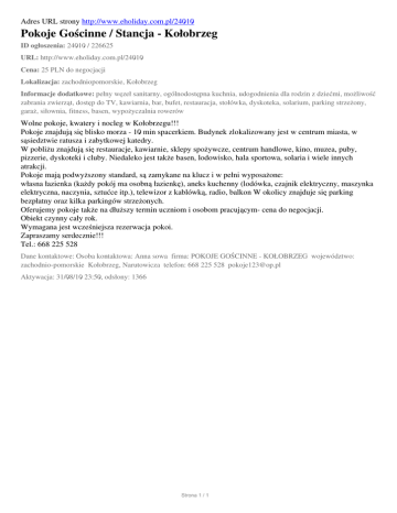 Adres URL strony http://www.eholiday.com.pl/24010 Pokoje Gościnne / Stancja - Kołobrzeg ID ogłoszenia: 24010 / 226625 URL: http://www.eholiday.com.pl/24010 Cena: 25 PLN do negocjacji Lokalizacja: zachodniopomorskie, Kołobrzeg Informacje dodatkowe: pełny węzeł sanitarny, ogólnodostępna kuchnia, udogodnienia dla rodzin z dziećmi, możliwość zabrania zwierząt, dostęp do TV, kawiarnia, bar, bufet, restauracja, stołówka, dyskoteka, solarium, parking strzeżony, garaż, siłownia, fitness, basen, wypożyczalnia rowerów Wolne pokoje, kwatery i nocleg w Kołobrzegu!!! Pokoje znajdują się blisko morza - 10 min spacerkiem. Budynek zlokalizowany jest w centrum miasta, w sąsiedztwie ratusza i zabytkowej katedry. W pobliżu znajdują się restauracje, kawiarnie, sklepy spożywcze, centrum handlowe, kino, muzea, puby, pizzerie, dyskoteki i cluby. Niedaleko jest także basen, lodowisko, hala sportowa, solaria i wiele innych atrakcji. Pokoje mają podwyższony standard, są zamykane na klucz i w pełni wyposażone: własna łazienka (każdy pokój ma osobną łazienkę), aneks kuchenny (lodówka, czajnik elektryczny, maszynka elektryczna, naczynia, sztućce itp.), telewizor z kablówką, radio, balkon W okolicy znajduje się parking bezpłatny oraz kilka parkingów strzeżonych. Oferujemy pokoje także na dłuższy termin uczniom i osobom pracującym- cena do negocjacji. Obiekt czynny cały rok. Wymagana jest wcześniejsza rezerwacja pokoi. Zapraszamy serdecznie!!! Tel.: 668 225 528 Dane kontaktowe: Osoba kontaktowa: Anna sowa firma: POKOJE GOŚCINNE - KOŁOBRZEG województwo: zachodnio-pomorskie Kołobrzeg, Narutowicza telefon: 668 225 528 [email protected] Aktywacja: 31/08/10 23:50, odsłony: 1366 Strona 1 / 1