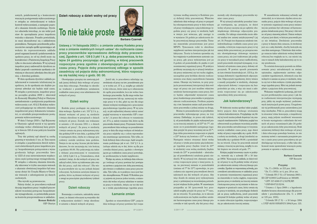 sowych, poinformował ją o konieczności wszczęcia postępowania wykroczeniowego w związku ze stwierdzonymi w trakcie kontroli wykroczeniami, a następnie poprosił o okazanie dowodu osobistego. Dyrektor odmówiła twierdząc, że nie widzi podstaw do sporządzania przez inspektora wniosku o ukaranie. Ponadto powiedziała, że musi skonsultować się z zakładowym prawnikiem. Następnie przedstawiła pełnomocnictwo zarządu spółki uprawniające adwokata do repre zen towania za kła du przed organami kontroli i poinformowała inspektora pracy, że od tej chwili może się kontaktować z Państwową Inspekcją Pracy tylko w obecności adwokata. W tej sytuacji inspektor pracy zadzwonił do dyrektora zakładu i poprosił o umówienie spotkania z obwinioną w obecności adwokata dwa dni później, o dowolnej godzinie. W dniu spotkania dyrektor zakładu poinformował w rozmowie telefonicznej inspektora, że do spotkania nie dojdzie ponieważ adwokat nie będzie miał czasu. W związku z powyższym, inspektor pracy na początku grudnia 2009 r. skierował do Komendy Miejskiej Policji w Olsztynie zawiadomienie o podejrzeniu popełnienia wykroczenia z art. 65 § 2 Kodeksu wykroczeń polegającego na odmowie okazania inspektorowi pracy dokumentu tożsamości, co utrudniło przeprowadzenie postępowania wykroczeniowego. W dniu 5 lutego 2010 r. Sąd Rejonowy w Olsztynie ogłosił wyrok w tej sprawie orzekając wobec obwinionej karę grzywny w kwocie 510 zł oraz pokrycie kosztów sądowych. Trzy dni później sąd ukarał tę osobę grzywną w wysokości 1 tys. zł. Tym razem w związku z popełnieniem dwóch wykroczeń stwierdzonych przez inspektora pracy: bezpodstawnym potrąceniem z wynagro dze nia by łe go pra cow ni ka kwo ty 1223 zł oraz nieterminowym wypłaceniem części potrąconego wynagrodzenia. W związku z odmową okazania dowodu, aby skierować w trybie zaocznym wniosek o ukaranie obwinionej inspektor był zmuszony złożyć do Urzędu Miasta w Olsztynie wniosek o udostępnienie jej danych osobowych. Oba wyroki są prawomocne. Należy dodać, że pracodawca wykonał decyzję inspektora pracy i wypłacił pracownikowi wcześniej potrącone bezpodstawnie wynagrodzenie, co potwierdziła ponowna kontrola przeprowadzona w zakładzie. Roman Rokicki OIP Olsztyn 8 Dzień roboczy a dzień wolny od pracy To nie takie proste Barbara Czarnek Ustawą z 14 listopada 2003 r. o zmianie ustawy Kodeks pracy oraz o zmianie niektórych innych ustaw1 do rozliczania czasu pracy pracowników wprowadzono definicję doby pracowniczej. Zgodnie z art. 128 § 3 pkt 1 k. p. doba pracownicza, to kolejne 24 godziny poczynając od godziny, w której pracownik rozpoczyna pracę zgodnie z obowiązującym go rozkładem czasu pracy. Pojęcie doby pracowniczej odbiega w sposób zasadniczy od pojęcia doby astronomicznej, która rozpoczyna się każdej nocy o godz. 00: 00. Obowiązujące przepisy nie zawierają jednak jasnej definicji dnia wolnego od pracy oraz dnia roboczego. Powoduje to określone trudności z prawidłowym ustalaniem rozkładów czasu pracy oraz udzielaniem dni wolnych od pracy. Dzień wolny Kodeks pracy posługuje się pojęciem dnia wolnego. Zgodnie z art. 1519 § 1 k. p., dniami wolnymi od pracy są niedziele i święta określone w przepisach o dniach wolnych od pracy. Zostały one wskazane w ustawie z 18 stycznia 1951 r. o dniach wolnych od pracy2. Za pracę w niedzielę i święto uważa się pracę wykonywaną między godziną 6.00 w tym dniu, a godziną 6.00 w następnym dniu, chyba że u danego pracodawcy została ustalona inna godzina. Święta te nie są więc liczone jak dni kalendarzowe, bo nie zaczynają się i nie kończą o godzinie 00.00. Nie pokrywają się także z dobami pracowniczymi w rozumieniu art. 128 § 3 pkt 1 k. p. Ustawodawca, obok niedziel i świąt, do dni wolnych od pracy nie zaliczył sobót, które są traktowane jako zwykłe dni pracy, czyli dni robocze3. Dla wielu pracowników nie są one jednak dniami roboczymi. Są bowiem szóstymi dniami tygodnia, które są dniami wolnymi od pracy z uwagi na przeciętnie pięciodniowy tydzień pracy. Dzień roboczy Rozumując a contrario, należałoby zatem uznać, że dniami roboczymi są wszystkie dni z wyłączeniem niedziel i świąt określone w ustawie o dniach wolnych od pracy. Jeżeli tak, to pracodawca udzielając np. zwolnienia od pracy na tzw. poszukiwanie pracy w trybie art. 37 k. p. mógłby go udzielić w dni robocze, które nimi są w odniesieniu do ogółu pracowników, lecz nie wobec konkretnego pracownika. Są dla niego wolne harmonogramowo lub np. zazwyczaj nie wykonuje pracy w te dni, gdyż są one dla niego dniami wolnymi wynikającymi z przeciętnie pięciodniowego tygodnia pracy. W tej sytuacji, za jak najbardziej słuszny należy uznać pogląd wyrażony w stanowisku GIP z marca br.4, iż przez dni robocze w rozumieniu art. 37 k. p. należy rozumieć dni, które są dla pracownika dniami pracy. Przyznanie bowiem pracownikowi dnia wolnego na poszukiwanie pracy w dniu dla niego wolnym od świadczenia pracy mijałoby się z celem wprowadzenia omawianego uprawnienia. Tyle tylko, że brak definicji dnia roboczego, bądź uregulowania podobnego jak w art. 1542 § 1 k. p. (urlopu udziela się w dni, które są dla pracownika dniami pracy, zgodnie z obowiązującym go rozkładem czasu pracy) powoduje, że problematyka ta budzi wątpliwości. Wydaje się zatem, że definicja dnia roboczego i wolnego od pracy powinna być powiązana zarówno z pojęciem tzw. doby pracowniczej, jak również z rozkładem czasu pracy pracownika. Tyle tylko, że w praktyce rzecz jest bardzo skomplikowana. W dziale VI Kodeksu pracy pojawia się jeszcze jeden termin, a mianowicie dni wolne od pracy udzielane w zamian za pracę w niedziele, święta czy też dni wolne z tytułu pięciodniowego tygodnia pracy. Łamanie zmian Zgodnie ze stanowiskiem GIP5, pojęcie dnia wolnego od pracy powinno być rozpaI P 3/2011 trywane według zawar