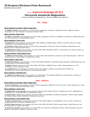 38 Krajowa Wystawa Psów Rasowych KALISZ 8 czerwca 2014 Andreas Rudolph (D-SV) Owczarek niemiecki długowłosy Sędzia: Deutscher Schäferhund Langstockhaar / German Shepherd Dog Long-haired Psy – Dogs Klasa młodszych szczeniąt / Minor Puppy Class 42 .RAMBO Trebortim, czarne podpalane, 14-12-2013, PKR w przygotowaniu, 7010/XXX/13, (NICO Mario Grande - HANZA aus Famke's Zauberwald), hod. Robert Filipowiak, wł. Agnieszka Smolińska, Polska Klasa szczeniąt / Puppy Class 43. ARES Luc Oschi Mon, czarne podpalane, 18-10-2013, PKR w przygotowaniu, 4167/XL/13, (GORDON vom Esweiler Tal - MONA Wierny Druh), hod. Konrad Roszczak, wł. Konrad Roszczak, Polska Klasa młodzieży / Junior Class 44. DIEGO Remo, czarne podpalane, 07-02-2013, PKR.I-72206, 3950/XL/13, (XAMBO Kalupus - RONJA von der Piste Trophe), hod. Sylwia Pogorzelska, wł. Julita Wolniewicz-Przybysz, Polska 45. FALCOR vom Haus Tchorz, wilczaste, 30-07-2013, PKR w przygotowaniu, 15013/XV/13, (FIGO vom Nordteich - SABA Sukcesor), hod. Mirosław Tchorz, wł. Bogusław Jagieła, Polska 46. GORAN Asarko Lordana, czarne podpalane, 30-12-2012, PKR.I-73097, 6815/XXX/12, (ROYAL Asarko Lordana - Zilli Asarko Lordana), hod. Grzegosz Okrasa, wł. Agnieszka Zaremba, Polska Klasa pośrednia / Intermediate Class 47. NAPPO vom Fichtenschlag, czarne podpalane, 11-11-2012, PKR.I-72305, 6732/XXX/12, (CHACCO von der Freiheit Westerholt - TZARA vom Fichtenschlag), hod. Marco Ossman, wł. Dominik Herka, Polska Klasa otwarta / Open Class 48. AFRO Kleine Werder, czarne podpalane, 31-12-2011, PKR.I-69842, 46923/VIII/11, (CASTOR z Peletonu Skorpiona - DARZA Marino Haus), hod. Jarosław Grenda, wł. Emilia Siwińska, Polska 49. BASCO z Piorenu, wilczaste, 02-12-2012, PKR.I-72259, 35161/XXII/12, (UMBERTO Tensor - CODI z Hetmańskiej Sfory), hod. Piotr Niedzielski, wł. Anna Lewandowska, Polska 50. LUCYFER Tensor, czarne podpalane, 27-08-2012, PKR.I-71305, 3853/XL/12, (BARU di Croce Santo Spirito - EFENDI vom Frankengold), hod. Joanna, Adam Domańscy, wł. Konrad Roszczak, Polska Klasa użytkowa / Working Class 51. YANNICK vom Butjenter Land, czarne podpalane, 05-12-2008, PKR.I-71775, 88252/I/08, (BRUNO von Vierhundert Hertz - GALINA vom Butjenter Land), hod. Uwe Wienbarg, wł. Magdalena Trojanowska, Polska Suki – Bitches Klasa młodszych szczeniąt / Minor Puppy Class 52. XULA ze Słomkowa, czarne podpalane, 28-12-2013, PKR w przygotowaniu, 28025/VII/13, (POLO van Contra - ZINA ze Słomkowa), hod. Maria Galus, wł. Arkadiusz Strefański, Edyta Praduń, Polska Klasa młodzieży / Junior Class 53. BARCELONA von Skorpionenblut, czarne podpalane, 03-06-2013, PKR.I-73568, 21551/XII/13, (OSKAR Wolf Jar (FCI) - ZERAPHINA vom Zellwaldrand), hod. Hanna Gajtkowska, wł. Tadeusz Nowak, Polska 54. NUCCA Asarko Lordana, czarne podpalane, 03-04-2013, PKR.I-74170, 6923/XXX/13, (LUGER vom Aspenhaus - TRINITY Asarko Lordana), hod. Grzegorz Okrasa, Ireneusz Paradziński, wł. Radosław Szmaj, Polska Klasa pośrednia / Intermediate Class 55. AIKA vom Hubichenstein, czarne podpalane, 02-03-2013, PKR.I-73825, 4098/XL/13, (SCHUMANN von Tronje - SYLVIE von Arlett), hod. Wolfgang Winkelmann, wł. Grzegorz Sobierajski, Polska 56. BLUE z Mylnej Gromady, czarne podpalane, 08-12-2012, PKR.I-72597, 6747/XXX/12, (ROYAL Asarko Lordana - QUANTA Wolf Jar), hod. Antoni Wawrzyniak, wł. Łukasz Jamry, Polska 57. ELITA vom Trojangold, czarne podpalane, 31-12-2012, PKR.I-72174, 88479/I/12, (ORION Mavic Poland - YACKI vom Butjenter Land), hod. Magdalena Trojanowska, wł. Magdalena Trojanowska, Polska Klasa otwarta / Open Class 58. DAKOTA Witaro (FCI), czarne podpalane, 25-10-2012, PKR.I-73307, 6824/XXX/12, (GIO vom Mühlenteich - WILMA z Ostrowskiej Sfory), hod. Dawid Skrzypek, wł. Dorota Balcerak, Polska 59. WIKI z Krainy Tura, czarne podpalane, 25-08-2012, PKR.I-71224, 6599/XXX/12, (WICK Linabero - ZAJA Asarko Lordana), hod. Tomasz Borowski, wł. Jan Szmaja, Polska Klasa użytkowa / Working Class 60. NIKITA Equus, czarne podpalane, 26-10-2009, PKR.I-66853, 26463/VII/09, (TABOO vom Nordteich - MICKI vom Almhof), hod. Aneta Bilińska, wł. Dorota Pikulska, Polska Andreas Rudolph (D-SV) Owczarek niemiecki krótkowłosy Sędzia: Deutscher Schäferhund Stockhaar / German Shepherd Dog Short-haired Psy – Dogs Klasa młodszych szczeniąt / Minor Puppy Class 61. SCHCO Trebortim, czarne podpalane, 10-01-2014, PKR w przygotowaniu, 7008/XXX/14, (VABO vom Osterberger-Land - JUKA Trebortim), hod. Robert Filipowiak, wł. Agnieszka Smolińska, Polska Klasa szczeniąt / Puppy Class 62. BAX Pablo Max, czarne podpalane, 01-11-2013, PKR w przygotowaniu, 6949/XXX/13, (LEX Marko Carras - JESSICA Marko Carras), hod. Przemysław Jędrysiak, wł. Przemysław Jędrysiak, Polska 63. JASKO vom Haus Tchorz, czarne podpalane, 11-11-2013, PKR w przygotowaniu, 15033/XV/13, (FIGO vom Nordteich - LUANA vom Zellwaldrand), hod. Mirosław Tchorz, wł. Bogusław Jagieła, Polska Klasa młodzieży / Junior Class 64. CRIS z Mylnej Gromady, czarne podpalane, 02-01-2013, PKR.I-74171, 6920/XXX/13, (LEX Marko Carras - HANKE Wolf Jar), hod. Antoni Wawrzyniak, wł. Antoni Wawrzyniak, Polska 65. DANTE von Gran Peregrino (FCI), wilczaste, 01-01-2013, PKR w przygotowaniu, 6719/XXX/13, (MENTOS v.Osterberger Land - MILLA v.Fichtenschlag Zwinger), hod. Alexander Moscona Zeledon, wł. Przemysław Walczykiewicz, Polska 66. GONZO z Parku Przyjażni, czarne podpalane, 24-03-2013, PKR w przygotowaniu, 7033/XXX/13, (LEX Marko Carras - DIANA z Parku Przyjażni), hod. Grzegorz Kaczmarek, wł. Grzegorz Kaczmarek, Polska 67. ISKO vom Haus Tchorz, czarne podpalane, 02-09-2013, PKR w przygotowaniu, 28063/VII/13, (NINO vom Tronje - ESPERNANCA vom Nordteich), hod. Mirosław Tchorz, wł. Franciszek Czerwonka, Polska 68. NIXON Asarko Lordana, czarne podpalane, 03-04-2013, PKR.I-73914, 6875/XXX/13, (LUGER vom Aspenhaus - TRINITY Asarko Lordana), hod. G. Okrasa & I. Paradziński, wł. Magdalena Murawska, Polska 69. ZYGA Wan-Hen, czarne podpalane, 31-12-2012