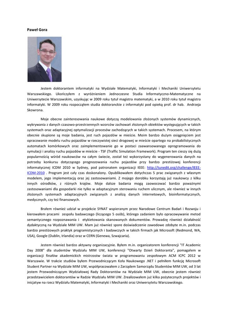 Paweł Gora Jestem doktorantem informatyki na Wydziale Matematyki, Informatyki i Mechaniki Uniwersytetu Warszawskiego. Ukończyłem z wyróżnieniem Jednoczesne Studia Informatyczno-Matematyczne na Uniwersytecie Warszawskim, uzyskując w 2009 roku tytuł magistra matematyki, a w 2010 roku tytuł magistra informatyki. W 2009 roku rozpocząłem studia doktoranckie z informatyki pod opieką prof. dr hab. Andrzeja Skowrona. Moje obecne zainteresowania naukowe dotyczą modelowania złożonych systemów dynamicznych, wykrywania z danych czasowo-przestrzennych wzorców zachowań złożonych obiektów występujących w takich systemach oraz adaptacyjnej optymalizacji procesów zachodzących w takich systemach. Procesem, na którym obecnie skupione są moje badania, jest ruch pojazdów w mieście. Moim bardzo dużym osiągnięciem jest opracowanie modelu ruchu pojazdów w rzeczywistej sieci drogowej w mieście opartego na probabilistycznych automatach komórkowych oraz zaimplementowanie go w postaci zaawansowanego oprogramowania do symulacji i analizy ruchu pojazdów w mieście - TSF (Traffic Simulation Framework). Program ten cieszy się dużą popularnością wśród naukowców na całym świecie, został też wykorzystany do wygenerowania danych na potrzeby konkursu dotyczącego prognozowania ruchu pojazdów przy bardzo prestiżowej konferencji informatycznej ICDM 2010 w Sydney, pod patronatem organizacji IEEE: http://tunedit.org/challenge/IEEEICDM-2010 . Program jest cały czas doskonalony. Opublikowałem dotychczas 5 prac związanych z własnym modelem, jego implementacją oraz jej zastosowaniami. Z mojego dorobku korzystają już naukowcy z kilku innych ośrodków, z różnych krajów. Moje dalsze badania mogą zaowocować bardzo poważnymi zastosowaniami dla gospodarki nie tylko w adaptacyjnym sterowaniu ruchem ulicznym, ale również w innych złożonych systemach adaptacyjnych związanych z analizą danych internetowych, bioinformatycznych, medycznych, czy też finansowych. Brałem również udział w projekcie SYNAT wspieranym przez Narodowe Centrum Badań i Rozwoju i kierowałem pracami zespołu badawczego (liczącego 5 osób), którego zadaniem było opracowywanie metod semantycznego rozpoznawania i etykietowania skanowanych dokumentów. Prowadzę również działalność dydaktyczną na Wydziale MIM UW. Mam już również spore doświadczenie zawodowe zdobyte m.in. podczas bardzo prestiżowych praktyk programistycznych i badawczych w takich firmach jak Microsoft (Redmond, WA, USA), Google (Dublin, Irlandia) oraz w CERN (Genewa, Szwajcaria). Jestem również bardzo aktywny organizacyjnie. Byłem m.in. organizatorem konferencji "IT Academic Day 2008" dla studentów Wydziału MIM UW, konferencji "Otwarty Dzień Doktoranta", pomagałem w organizacji finałów akademickich mistrzostw świata w programowaniu zespołowym ACM ICPC 2012 w Warszawie. W trakcie studiów byłem Przewodniczącym Koła Naukowego .NET i pełniłem funkcję Microsoft Student Partner na Wydziale MIM UW, współpracowałem z Zarządem Samorządu Studentów MIM UW, od 3 lat jestem Przewodniczącym Wydziałowej Rady Doktorantów na Wydziale MIM UW, obecnie jestem również przedstawicielem doktorantów w Radzie Wydziału MIM UW. Zrealizowałem już kilka pożytecznych projektów i inicjatyw na rzecz Wydziału Matematyki, Informatyki i Mechaniki oraz Uniwersytetu Warszawskiego.
