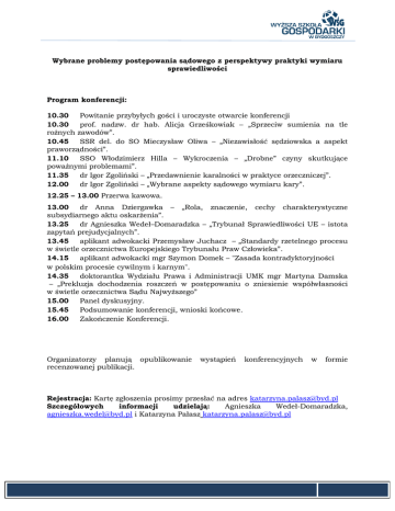 Wybrane problemy postępowania sądowego z perspektywy praktyki wymiaru sprawiedliwości Program konferencji: 10.30 Powitanie przybyłych gości i uroczyste otwarcie konferencji 10.30 prof. nadzw. dr hab. Alicja Grześkowiak – „Sprzeciw sumienia na tle rożnych zawodów”. 10.45 SSR del. do SO Mieczysław Oliwa – „Niezawisłość sędziowska a aspekt praworządności”. 11.10 SSO Włodzimierz Hilla – Wykroczenia – „Drobne” czyny skutkujące poważnymi problemami”. 11.35 dr Igor Zgoliński – „Przedawnienie karalności w praktyce orzeczniczej”. 12.00 dr Igor Zgoliński – „Wybrane aspekty sądowego wymiaru kary”. 12.25 – 13.00 Przerwa kawowa. 13.00 dr Anna Dziergawka – „Rola, znaczenie, cechy charakterystyczne subsydiarnego aktu oskarżenia”. 13.25 dr Agnieszka Wedeł–Domaradzka – „Trybunał Sprawiedliwości UE – istota zapytań prejudycjalnych”. 13.45 aplikant adwokacki Przemysław Juchacz – „Standardy rzetelnego procesu w świetle orzecznictwa Europejskiego Trybunału Praw Człowieka”. 14.15 aplikant adwokacki mgr Szymon Domek – "Zasada kontradyktoryjności w polskim procesie cywilnym i karnym". 14.35 doktorantka Wydziału Prawa i Administracji UMK mgr Martyna Damska – „Prekluzja dochodzenia roszczeń w postępowaniu o zniesienie współwłasności w świetle orzecznictwa Sądu Najwyższego” 15.00 Panel dyskusyjny. 15.45 Podsumowanie konferencji, wnioski końcowe. 16.00 Zakończenie Konferencji. Organizatorzy planują opublikowanie recenzowanej publikacji. wystąpień konferencyjnych w formie Rejestracja: Kartę zgłoszenia prosimy przesłać na adres [email protected] Szczegółowych informacji udzielają: Agnieszka Wedeł-Domaradzka, [email protected] i Katarzyna Pałasz [email protected] KARTA ZGŁOSZENIA UDZIAŁU W KONFERENCJI NAUKOWEJ „WYBRANE PROBLEMY POSTĘPOWANIA SĄDOWEGO Z PERSPEKTYWY PRAKTYKI WYMIARU SPRAWIEDLIWOŚCI” INOWROCŁAW, 25 LISTOPADA 2011 R. Imię i nazwisko: ________________________________________________________________ Tytuł/stopień naukowy: ________________________________________________________ Miejsce zatrudnienia : __________________________________________________________ Adres do korespondencji: _______________________________________________________ __________________________________________________________________________________ Numer telefonu kontaktowego:__________________________________________________ Adres e–mail: ____________________________________________________________________ Udział w Konferencji z referatem: tak Tytuł referatu: __________________________________________________________________ __________________________________________________________________________________ ______________________________________ podpis Prosimy o przestanie formularza faksem na numer: 52 56700 90 Lub e–mailem: [email protected] z dopiskiem: Konferencja prawnicza.