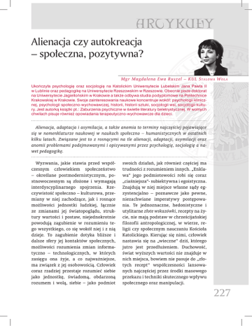 ARTYKUŁY Alienacja czy autokreacja – społeczna, pozytywna? Mg r Magdalena Ewa Ruszel – K UL S t a l o wa W o l a Ukończyła psychologię oraz socjologię na Katolickim Uniwersytecie Lubelskim Jana Pawła II w Lublinie oraz pedagogikę na Uniwersytecie Rzeszowskim w Rzeszowie. Obecnie pisze doktorat na Uniwersytecie Jagiellońskim w Krakowie a także odbywa studia podyplomowe na Politechnice Krakowskiej w Krakowie. Swoje zainteresowania naukowe koncentruje wokół: psychologii klinicznej, psychologii społeczno-wychowawczej, historii, historii sztuki, socjologii wsi, socjologii kultury. Jest autorką książki pt.: Zaburzenia psychiczne w świetle literatury beletrystycznej. W wolnych chwilach pisuje również opowiadania terapeutyczno-wychowawcze dla dzieci. Alienacja, adaptacja i asymilacja, a także anomia to terminy najczęściej pojawiające się w nomenklaturze naukowej w naukach społeczno – humanistycznych w ostatnich kilku latach. Związane jest to z rosnącymi na tle alienacji, adaptacji, asymilacji oraz anomii problemami podejmowanymi i opisywanymi przez psychologię, socjologię a nawet pedagogikę. Wyzwania, jakie stawia przed współczesnym człowiekiem społeczeństwo – określane postmodernistycznym, postnowoczesnym są złożone i wymagają interdyscyplinarnego spojrzenia. Rzeczywistość społeczno – kulturowa, przemiany w niej zachodzące, jak i rosnące możliwości jednostki ludzkiej, łącznie ze zmianami jej światopoglądu, struktury wartości i postaw, niejednokrotnie powodują zagubienie w rozumieniu tego wszystkiego, co się wokół niej i z nią dzieje. To zagubienie dotyka bliższe i dalsze sfery jej kontaktów społecznych, możliwości rozumienia zmian informatyczno – technologicznych, w których zasięgu ona żyje, a co najważniejsze, ma związek z jej osobowością. Człowiek coraz rzadziej przestaje rozumieć siebie jako jednostkę, świadomą, obdarzoną rozumem i wolą, siebie – jako podmiot swoich działań, jak również częściej ma trudności z rozumieniem innych. „Enklawa” jego podmiotowości robi się coraz „ciaśniejsza”- subiektywna i egoistyczna. Znajdują w niej miejsce własne sądy egzystencjalno – poznawcze jako pewne, niezachwiane imperatywy postępowania. Te jednoznaczne, hedonistyczne i utylitarne złote wskazówki, recepty na życie, nie mają podstaw w chrześcijańskiej filozofii antropologicznej, w wierze, religii czy społecznym nauczaniu Kościoła Katolickiego. Kierując się nimi, człowiek nastawia się na „wieczne” dziś, którego jutro jest przedłużeniem. Duchowość, świat wyższych wartości nie znajduje w nich miejsca, bowiem nie pasuje do „złotych recept” współczesności lansowanych najczęściej przez środki masowego przekazu i techniki skutecznego wpływu społecznego oraz manipulacji. 227 ARTICLES Alienacja oznacza „poczucie wyobcowania lub oddzielenia od innych”1. Według psychologów egzystencjalnych zaś, jest to „oddzielenie jednostki od własnego „ja”, uznawanego za „prawdziwe” czy „głębsze” i jest konsekwencją uwikłania się w konformizm, zajmowania się potrzebami, pragnieniami innych czy też konsekwencją nacisków ze strony instytucji społecznych”2. Człowiek może się wyalienować, gdy zatraci swą prawdziwą podmiotowość, przestanie być „sobą dla siebie”, gdy założy „maskę”, jakiej się od niego spodziewa. Także wtedy, gdy zbytnio ulegając naciskom zewnętrznym zmuszony będzie przyjąć rozwiązania konformistyczne, których podświadomie nie akceptuje, nie zgadza się z nimi. Inny rodzaj alienacji, nazwijmy ją alienacją społeczną ma miejsce, gdy jednostka żyjąc i działając w grupach społecznych bardziej lub mniej sformalizowanych, czuje się w nich obco, nieswojo, nienaturalnie, nie może poczuć się w pełni sobą, jest wewnętrznie „zablokowana”, a dodatkowe wymagania ze strony sformalizowanych struktur w których ona tkwi, nasilają to odczucie. Łacińskie słowo alienatio ma po pierwsze znaczenie prawne – znaczy nabycie lub sprzedaż dobra czy praw, po drugie znaczenie psychologiczne na określenie demencji, po trzecie – socjologiczne jako rozkład więzi pomiędzy jednostką a innymi, po czwarte – religijne jako zanik więzów pomiędzy człowiekiem a wymiarem duchowym. Współczesna historia tego słowa rozpoczyna się wraz z Rousseau z jego wskazaniami dotyczącymi umowy 1 228 społecznej. Porzucenie przez człowieka stanu wolności naturalnej jest aktem alienacji, co prawda dobrowolnie przyjętym, bo z zamiarem, że i inni również podzielą i odwzajemnią ten stan, a to zagwarantuje jednostce korzyści płynące z wolności cywilnej. Jednakże Rousseau ma co do tego wątpliwości. Wola powszechna, dobro ogółu może zostać porzucone na rzecz partykularnych interesów3. Marks jednoznacznie określa alienację jako dehumanizację wynikającą z rozwoju kapitalizmu. W pismach z lat 1843 -1844 pisze, iż społeczeństwo kapitalistyczne alienuje robotnika od produktu jego pracy; jest on wyalienowany z sensu, celu swojej pracy, podział pracy wyzbywa go z jego człowieczeństwa, ze społecznej natury, z życia mentalnego i podmiotowego. Autonomia i alienacja kapitalistycznego charakteru procesu produkcji wypływa z warunków i produktu pracy prowadząc do daleko zaognionych antagonizmów pomiędzy właścicielami środków produkcji a proletariuszami.4 Zatem, człowiek współczesny w ujęciu Marksa jest zreifikowany – pozbawiony przymiotów człowieczeństwa; wolności wyboru i samostanowienia o warunkach swojej egzystencji. To praca i kapitał zastępują mu autonomię myślenia i działania, człowiek działa jak jeden z trybików w maszynie, jaką jest gospodarka, liczy się wiec jego wydajność i maksymalna eksploatacja. Jeśli się ten trybik „zepsuje”, to można go zastąpić innym, bez wpływu na funkcjonowanie całości. Dla Fromma społeczeństwo kapitalistyczne wyalienowywuje 