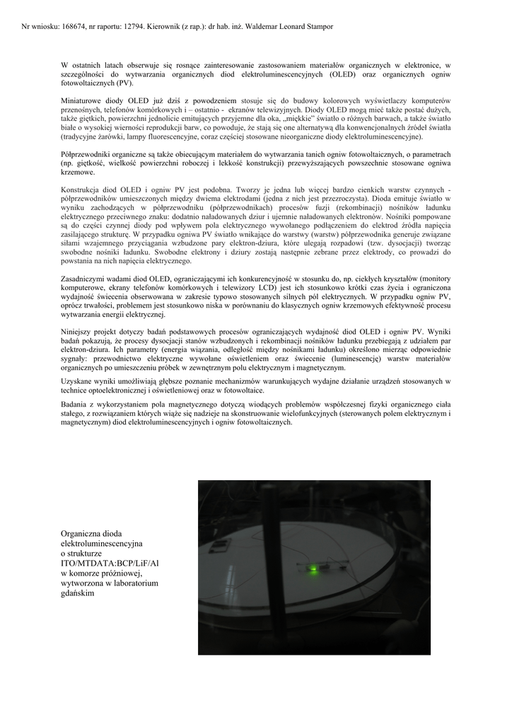 Nr wniosku: 168674, nr raportu: 12794. Kierownik (z rap.): dr hab. inż. Waldemar Leonard Stampor W ostatnich latach obserwuje się rosnące zainteresowanie zastosowaniem materiałów organicznych w elektronice, w szczególności do wytwarzania organicznych diod elektroluminescencyjnych (OLED) oraz organicznych ogniw fotowoltaicznych (PV). Miniaturowe diody OLED już dziś z powodzeniem stosuje się do budowy kolorowych wyświetlaczy komputerów przenośnych, telefonów komórkowych i – ostatnio - ekranów telewizyjnych. Diody OLED mogą mieć także postać dużych, także giętkich, powierzchni jednolicie emitujących przyjemne dla oka, „miękkie” światło o różnych barwach, a także światło białe o wysokiej wierności reprodukcji barw, co powoduje, że stają się one alternatywą dla konwencjonalnych źródeł światła (tradycyjne żarówki, lampy fluorescencyjne, coraz częściej stosowane nieorganiczne diody elektroluminescencyjne). Półprzewodniki organiczne są także obiecującym materiałem do wytwarzania tanich ogniw fotowoltaicznych, o parametrach (np. giętkość, wielkość powierzchni roboczej i lekkość konstrukcji) przewyższających powszechnie stosowane ogniwa krzemowe. Konstrukcja diod OLED i ogniw PV jest podobna. Tworzy je jedna lub więcej bardzo cienkich warstw czynnych półprzewodników umieszczonych między dwiema elektrodami (jedna z nich jest przezroczysta). Dioda emituje światło w wyniku zachodzących w półprzewodniku (półprzewodnikach) procesów fuzji (rekombinacji) nośników ładunku elektrycznego przeciwnego znaku: dodatnio naładowanych dziur i ujemnie naładowanych elektronów. Nośniki pompowane są do części czynnej diody pod wpływem pola elektrycznego wywołanego podłączeniem do elektrod źródła napięcia zasilającego strukturę. W przypadku ogniwa PV światło wnikające do warstwy (warstw) półprzewodnika generuje związane siłami wzajemnego przyciągania wzbudzone pary elektron-dziura, które ulegają rozpadowi (tzw. dysocjacji) tworząc swobodne nośniki ładunku. Swobodne elektrony i dziury zostają następnie zebrane przez elektrody, co prowadzi do powstania na nich napięcia elektrycznego. Zasadniczymi wadami diod OLED, ograniczającymi ich konkurencyjność w stosunku do, np. ciekłych kryształów (monitory komputerowe, ekrany telefonów komórkowych i telewizory LCD) jest ich stosunkowo krótki czas życia i ograniczona wydajność świecenia obserwowana w zakresie typowo stosowanych silnych pól elektrycznych. W przypadku ogniw PV, oprócz trwałości, problemem jest stosunkowo niska w porównaniu do klasycznych ogniw krzemowych efektywność procesu wytwarzania energii elektrycznej. Niniejszy projekt dotyczy badań podstawowych procesów ograniczających wydajność diod OLED i ogniw PV. Wyniki badań pokazują, że procesy dysocjacji stanów wzbudzonych i rekombinacji nośników ładunku przebiegają z udziałem par elektron-dziura. Ich parametry (energia wiązania, odległość między nośnikami ładunku) określono mierząc odpowiednie sygnały: przewodnictwo elektryczne wywołane oświetleniem oraz świecenie (luminescencję) warstw materiałów organicznych po umieszczeniu próbek w zewnętrznym polu elektrycznym i magnetycznym. Uzyskane wyniki umożliwiają głębsze poznanie mechanizmów warunkujących wydajne działanie urządzeń stosowanych w technice optoelektronicznej i oświetleniowej oraz w fotowoltaice. Badania z wykorzystaniem pola magnetycznego dotyczą wiodących problemów współczesnej fizyki organicznego ciała stałego, z rozwiązaniem których wiąże się nadzieje na skonstruowanie wielofunkcyjnych (sterowanych polem elektrycznym i magnetycznym) diod elektroluminescencyjnych i ogniw fotowoltaicznych. Organiczna dioda elektroluminescencyjna o strukturze ITO/MTDATA:BCP/LiF/Al w komorze próżniowej, wytworzona w laboratorium gdańskim