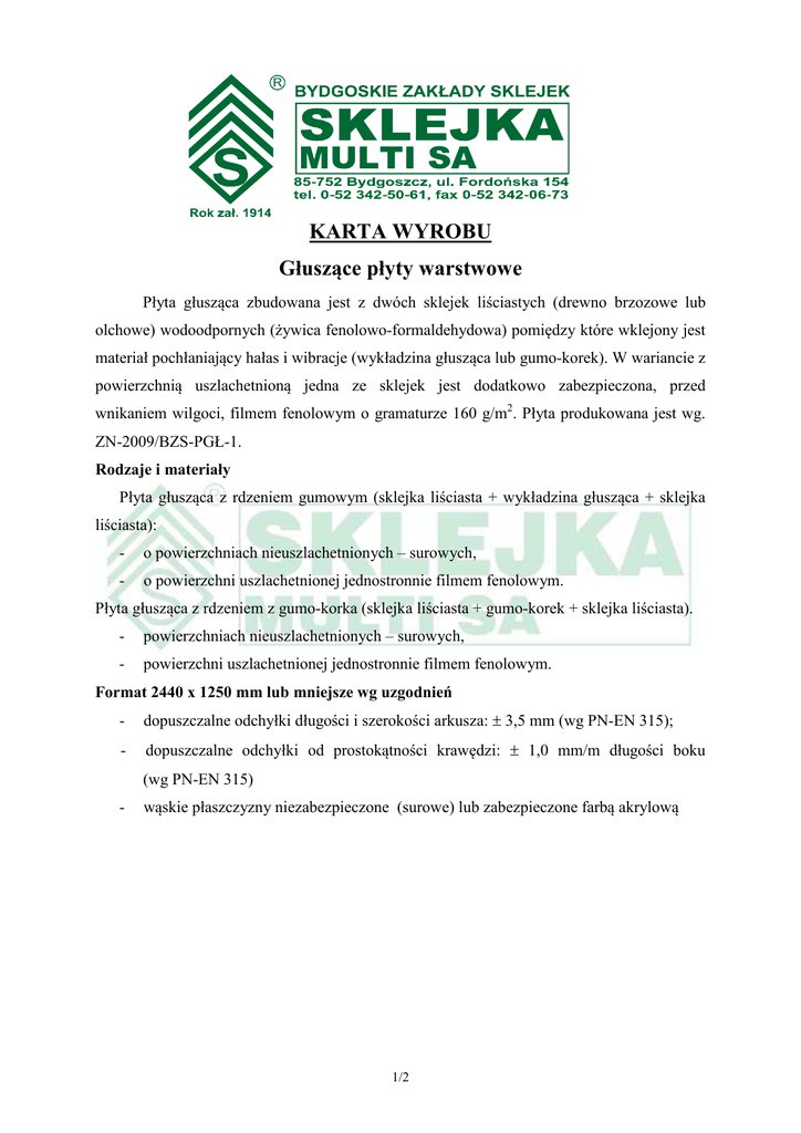 KARTA WYROBU Głuszące płyty warstwowe Płyta głusząca zbudowana jest z dwóch sklejek liściastych (drewno brzozowe lub olchowe) wodoodpornych (żywica fenolowo-formaldehydowa) pomiędzy które wklejony jest materiał pochłaniający hałas i wibracje (wykładzina głusząca lub gumo-korek). W wariancie z powierzchnią uszlachetnioną jedna ze sklejek jest dodatkowo zabezpieczona, przed wnikaniem wilgoci, filmem fenolowym o gramaturze 160 g/m2. Płyta produkowana jest wg. ZN-2009/BZS-PGŁ-1. Rodzaje i materiały Płyta głusząca z rdzeniem gumowym (sklejka liściasta + wykładzina głusząca + sklejka liściasta): - o powierzchniach nieuszlachetnionych – surowych, - o powierzchni uszlachetnionej jednostronnie filmem fenolowym. Płyta głusząca z rdzeniem z gumo-korka (sklejka liściasta + gumo-korek + sklejka liściasta). - powierzchniach nieuszlachetnionych – surowych, - powierzchni uszlachetnionej jednostronnie filmem fenolowym. Format 2440 x 1250 mm lub mniejsze wg uzgodnień - dopuszczalne odchyłki długości i szerokości arkusza: ± 3,5 mm (wg PN-EN 315); - dopuszczalne odchyłki od prostokątności krawędzi: ± 1,0 mm/m długości boku (wg PN-EN 315) - wąskie płaszczyzny niezabezpieczone (surowe) lub zabezpieczone farbą akrylową 1/2 Przykładowe dane techniczne: Wyszczególnienie Tolerancja grubości [mm] (wg PN-EN 315) Grubość [mm] Płyta głusząca z rdzeniem gumowym Płyta głusząca z rdzeniem z gumo-korka Gęstość [kg/m3] (wg PN-EN 323) min. max. 12 11,2 12,6 1030± 30 15 14,2 15,6 970 ± 30 16 15,1 16,7 900 ± 30 18 17,1 18,7 870 ± 30 20 20,8 19,0 830 ± 30 12 11,2 12,6 880 ± 30 15 14,2 15,6 780 ± 30 18 17,1 18,7 750 ± 30 Wilgotność 10 ± 5% (wg PN-EN 322) Zdolność izolowania dźwięków [dB]: Częstotliwość [Hz] Grubość Wyszczególnienie Płyta głusząca z rdzeniem gumowym Płyta głusząca mm 100 200 300 400 500 1000 2000 3000 4000 5000 12 33,0 26,9 25,3 32,3 34,6 40,6 43,6 47,2 47,9 47,8 51,6 15 34,5 27,8 27,5 34,5 36,8 43,5 44,6 48,6 50,0 50,8 52,5 12 34,0 27,0 24,1 30,6 32,9 39,4 42,1 46,1 45,7 45,2 48,7 15 35,0 28,1 25,7 32,4 34,6 41,5 43,2 47,1 47,1 47,1 49,9 10000 z rdzeniem z gumo-korka 2/2 Przykładowa, średnia wytrzymałość na zginanie statyczne oraz moduł sprężystości przy zginaniu statycznym (wg PN-EN 310): Grubość Wytrzymałość na zginanie Moduł sprężystości przy Wyszczególnienie [mm] statyczne [MPa] zginaniu statycznym [MPa] Wyszczególnienie Grubość II ⊥ II ⊥ 12 50 40 5000 4500 15 50 40 5000 4500 16 50 45 5500 5000 18 50 45 5500 5000 20 50 45 5500 5000 12 45 40 4000 3000 15 45 40 4000 3500 18 45 40 4000 3500 [mm] Płyta głusząca z rdzeniem gumowym Płyta głusząca z rdzeniem z gumo-korka Możliwości obróbki Cięcie na mniejsze formaty; prosta obróbka krawędzi, wiercenie otworów, obróbka na centrach obróbczych CNC. Zastosowanie Płyta o dużej zdolności pochłaniania hałasu i wibracji, przeznaczona specjalnie na podłogi autobusów i wagonów. Data aktualizacji 20.10.2014. 3/2