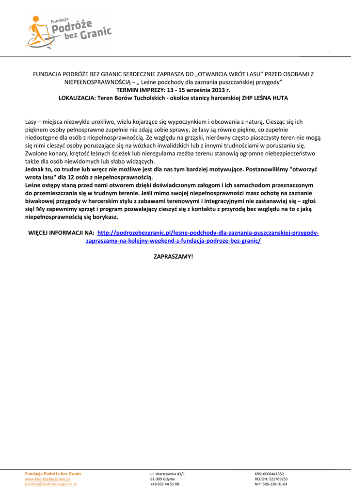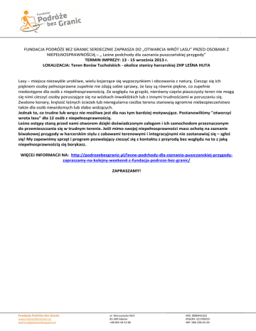 : FUNDACJA PODRÓŻE BEZ GRANIC SERDECZNIE ZAPRASZA DO „OTWARCIA WRÓT LASU” PRZED OSOBAMI Z NIEPEŁNOSPRAWNOŚCIĄ – „ Leśne podchody dla zaznania puszczańskiej przygody” TERMIN IMPREZY: 13 - 15 września 2013 r. LOKALIZACJA: Teren Borów Tucholskich - okolice stanicy harcerskiej ZHP LEŚNA HUTA Lasy – miejsca niezwykle urokliwe, wielu kojarzące się wypoczynkiem i obcowania z naturą. Ciesząc się ich pięknem osoby pełnosprawne zupełnie nie zdają sobie sprawy, że lasy są równie piękne, co zupełnie niedostępne dla osób z niepełnosprawnością. Ze względu na grząski, nierówny często piaszczysty teren nie mogą się nimi cieszyć osoby poruszające się na wózkach inwalidzkich lub z innymi trudnościami w poruszaniu się. Zwalone konary, krętość leśnych ścieżek lub nieregularna rzeźba terenu stanowią ogromne niebezpieczeństwo także dla osób niewidomych lub słabo widzących. Jednak to, co trudne lub wręcz nie możliwe jest dla nas tym bardziej motywujące. Postanowiliśmy "otworzyć wrota lasu" dla 12 osób z niepełnosprawnością. Leśne ostępy staną przed nami otworem dzięki doświadczonym załogom i ich samochodom przeznaczonym do przemieszczania się w trudnym terenie. Jeśli mimo swojej niepełnosprawności masz ochotę na zaznanie biwakowej przygody w harcerskim stylu z zabawami terenowymi i integracyjnymi nie zastanawiaj się – zgłoś się! My zapewnimy sprzęt i program pozwalający cieszyć się z kontaktu z przyrodą bez względu na to z jaką niepełnosprawnością się borykasz. WIĘCEJ INFORMACJI NA: http://podrozebezgranic.pl/lesne-podchody-dla-zaznania-puszczanskiej-przygodyzapraszamy-na-kolejny-weekend-z-fundacja-podroze-bez-granic/ ZAPRASZAMY! Fundacja Podróże bez Granic www.PodróżeBezGranic.pl [email protected] ul. Warszawska 43/1 81-309 Gdynia +48 692 44 51 88 KRS: 0000441552 REGON: 221789255 NIP: 586-228-01-64