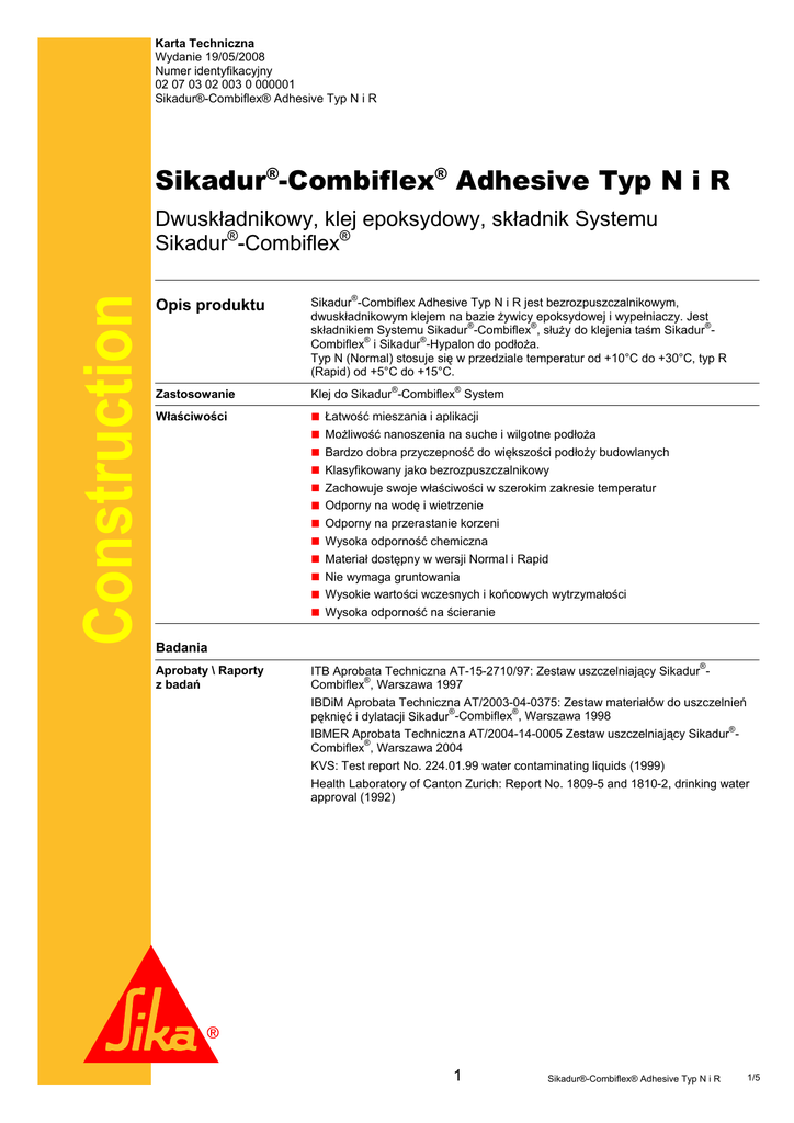 Karta Techniczna Wydanie 19/05/2008 Numer identyfikacyjny 02 07 03 02 003 0 000001 Sikadur®-Combiflex® Adhesive Typ N i R Sikadur®-Combiflex® Adhesive Typ N i R Construction Dwuskładnikowy, klej epoksydowy, składnik Systemu Sikadur®-Combiflex® Opis produktu Sikadur®-Combiflex Adhesive Typ N i R jest bezrozpuszczalnikowym, dwuskładnikowym klejem na bazie żywicy epoksydowej i wypełniaczy. Jest ® ® ® składnikiem Systemu Sikadur -Combiflex , służy do klejenia taśm Sikadur ® ® Combiflex i Sikadur -Hypalon do podłoża. Typ N (Normal) stosuje się w przedziale temperatur od +10°C do +30°C, typ R (Rapid) od +5°C do +15°C. Zastosowanie ® ® Klej do Sikadur -Combiflex System Właściwości Łatwość mieszania i aplikacji Możliwość nanoszenia na suche i wilgotne podłoża Bardzo dobra przyczepność do większości podłoży budowlanych Klasyfikowany jako bezrozpuszczalnikowy Zachowuje swoje właściwości w szerokim zakresie temperatur Odporny na wodę i wietrzenie Odporny na przerastanie korzeni Wysoka odporność chemiczna Materiał dostępny w wersji Normal i Rapid Nie wymaga gruntowania Wysokie wartości wczesnych i końcowych wytrzymałości Wysoka odporność na ścieranie Badania Aprobaty \ Raporty z badań ® ITB Aprobata Techniczna AT-15-2710/97: Zestaw uszczelniający Sikadur ® Combiflex , Warszawa 1997 IBDiM Aprobata Techniczna AT/2003-04-0375: Zestaw materiałów do uszczelnień ® ® pęknięć i dylatacji Sikadur -Combiflex , Warszawa 1998 ® IBMER Aprobata Techniczna AT/2004-14-0005 Zestaw uszczelniający Sikadur ® Combiflex , Warszawa 2004 KVS: Test report No. 224.01.99 water contaminating liquids (1999) Health Laboratory of Canton Zurich: Report No. 1809-5 and 1810-2, drinking water approval (1992) 1 Sikadur®-Combiflex® Adhesive Typ N i R 1/5 Dane produktu Postać Barwa Składnik A Składnik B Mieszanina składników A+B Opakowanie 6 kg (A+B) 30 kg składnik A 10 kg składnik B Biała Czarna Jasno szara Składowanie Warunki składowania / Czas przydatności do użycia Materiał składowany w oryginalnych, nieuszkodzonych opakowaniach w temperaturze od +5°C do +30°C, najlepiej zużyć w przeciągu 24 miesięcy od daty produkcji. Dane techniczne Baza chemiczna Modyfikowana, bezrozpuszczalnikowa, dwuskładnikowa żywica epoksydowa z wypełniaczem. Gęstość 1,75 kg/l 1,55 kg/l 1,65 kg/l ~ 1,60 kg/l Współczynnik rozszerzalności termicznej Rozszerzalność liniowa na 1°C 5 x 10-5 na 1ºC ± 10% od -20°C do +20°C -5 10 x 10 na 1ºC ± 10% od +20°C do +60°C Temperatura użytkowania -30°C ÷ + 60°C składnik A składnik B Typ N składnik B Typ R mieszanina A+B (w +20°C) (w +20°C) (w +20°C) (w +20°C) Właściwości mechaniczne Przyczepność do podłoża Podłoże Przyczepność Suchy beton >2 N/mm² (zniszczenie betonu) Beton matowo – wilgotny >2 N/mm² (zniszczenie betonu) Wypiaskowana stal > 10 N/mm² Moduł sprężystości E Moduł E statyczny Temperatura Typ Normal Typ Rapid -20°C 6 100 N/mm² 5 900 N/mm² +23°C 3 500 N/mm² 2 300 N/mm² Przyrost wytrzymałości Czas utwardzania Wytrzymałość na ściskanie Typ Normal Typ Rapid +10°C +30°C +5°C +15°C 3 dni 47 N/mm² 73 N/mm² 41 N/mm² 48 N/mm² 7 dni 50 N/mm² 76 N/mm² 47 N/mm² 58 N/mm² 14 dni 63 N/mm² 79 N/mm² 49 N/mm² 59 N/mm² 2 Sikadur®-Combiflex® Adhesive Typ N i R 2/5 Odporność na zarysowanie Temperatura Typ Normal Typ Rapid +5°C - 15 godz. +15°C 8 godz. 5 godz. +30°C 3 godz. - Odporność Odporność chemiczna ® ® Patrz Karta Techniczna „Sikadur -Combiflex System” Informacje o systemie Struktura systemu ® ® Patrz Karta Techniczna „Sikadur -Combiflex System” Szczegóły aplikacji Zużycie ® ® Patrz Karta Techniczna „Sikadur -Combiflex System” Jakość podłoża Beton, kamień, zaprawy cementowe Powierzchnia musi być czysta, odtłuszczona, bez mleczka cementowego i luźnych cząstek. Minimalny wiek betonu, w zależności od warunków dojrzewania od 3 do 6 tygodni. Stal konstrukcyjna V2A (1.4301) i 37 Powierzchnia wolna od zatłuszczeń, rdzy i zendry. Poliester, epoksydy, ceramika, szkło Powierzchnia czysta i odtłuszczona. Przygotowanie podłoża Beton, kamień, zaprawy cementowe Przygotowanie powierzchni: piaskowanie, lanca wodna, groszkowanie, skuwanie, szlifowanie. Bezpośrednio przed aplikacją odkurzenie powierzchni. Stal konstrukcyjna 37 Powierzchnia oczyszczona metodą strumieniowo ścierną. Bezpośrednio przed aplikacją odkurzona. Stal konstrukcyjna V2A (1.4301) Powierzchnia przeszlifowana. Bezpośrednio przed aplikacją odkurzona. Poliester, epoksydy, ceramika, szkło Powierzchnie należy oczyścić, odtłuścić, uszorstnić. Bezpośrednio przed aplikacją odkurzyć. Nie stosować na podłożu silikonowym. Warunki aplikacji Temperatura podłoża Typ Rapid Typ Normal +5°C ÷ +15°C +10°C ÷ +30°C Temperatura otoczenia Typ Rapid Typ Normal +5°C ÷ +15°C +10°C ÷ +30°C Wilgotność podłoża Podłoża cementowe powinny być suche, co najwyżej matowo-wilgotne. Należy wtedy klej dokładnie wetrzeć w podłoże najlepiej twardym pędzlem lub szczotką. Wilgotność względna powietrza Maksimum 85% (w +25°C) Temperatura punktu rosy Temperatura otoczenia musi być, o co najmniej 3 stopnie wyższa od temperatury punktu rosy. Instrukcja aplikacji Proporcja mieszania Składniki A : B = 3 : 1 (wagowo) 3 Sikadur®-Combiflex® Adhesive Typ N i R 3/5 Przygotowanie kleju Pojemniki z dozowaną ilością materiałów (zestawy 6 kg): Składniki A i B dokładnie wymieszać wstępnie w pojemnikach. Następnie całą ilość składnika B dodać do składnika A i mieszać wolnoobrotowym mieszadłem mechanicznym, przez co najmniej 2 minuty tak, aby uzyskać jednorodną mieszankę bez przebarwień. Po uzyskaniu jednorodnej barwy wymieszane składniki A i B, należy przełożyć do czystego naczynia i raz jeszcze wymieszać przez około 1 minutę. Do mieszania używać mechaniczne mieszadło wolnoobrotowe (do 500 obrotów/min.), wyposażon