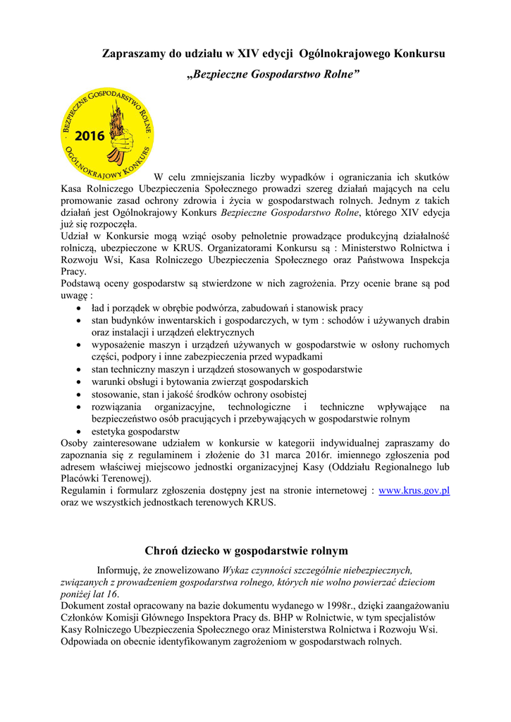 Zapraszamy do udziału w XIV edycji Ogólnokrajowego Konkursu „Bezpieczne Gospodarstwo Rolne” W celu zmniejszania liczby wypadków i ograniczania ich skutków Kasa Rolniczego Ubezpieczenia Społecznego prowadzi szereg działań mających na celu promowanie zasad ochrony zdrowia i życia w gospodarstwach rolnych. Jednym z takich działań jest Ogólnokrajowy Konkurs Bezpieczne Gospodarstwo Rolne, którego XIV edycja już się rozpoczęła. Udział w Konkursie mogą wziąć osoby pełnoletnie prowadzące produkcyjną działalność rolniczą, ubezpieczone w KRUS. Organizatorami Konkursu są : Ministerstwo Rolnictwa i Rozwoju Wsi, Kasa Rolniczego Ubezpieczenia Społecznego oraz Państwowa Inspekcja Pracy. Podstawą oceny gospodarstw są stwierdzone w nich zagrożenia. Przy ocenie brane są pod uwagę : ład i porządek w obrębie podwórza, zabudowań i stanowisk pracy stan budynków inwentarskich i gospodarczych, w tym : schodów i używanych drabin oraz instalacji i urządzeń elektrycznych wyposażenie maszyn i urządzeń używanych w gospodarstwie w osłony ruchomych części, podpory i inne zabezpieczenia przed wypadkami stan techniczny maszyn i urządzeń stosowanych w gospodarstwie warunki obsługi i bytowania zwierząt gospodarskich stosowanie, stan i jakość środków ochrony osobistej rozwiązania organizacyjne, technologiczne i techniczne wpływające na bezpieczeństwo osób pracujących i przebywających w gospodarstwie rolnym estetyka gospodarstw Osoby zainteresowane udziałem w konkursie w kategorii indywidualnej zapraszamy do zapoznania się z regulaminem i złożenie do 31 marca 2016r. imiennego zgłoszenia pod adresem właściwej miejscowo jednostki organizacyjnej Kasy (Oddziału Regionalnego lub Placówki Terenowej). Regulamin i formularz zgłoszenia dostępny jest na stronie internetowej : www.krus.gov.pl oraz we wszystkich jednostkach terenowych KRUS. Chroń dziecko w gospodarstwie rolnym Informuję, że znowelizowano Wykaz czynności szczególnie niebezpiecznych, związanych z prowadzeniem gospodarstwa rolnego, których nie wolno powierzać dzieciom poniżej lat 16. Dokument został opracowany na bazie dokumentu wydanego w 1998r., dzięki zaangażowaniu Członków Komisji Głównego Inspektora Pracy ds. BHP w Rolnictwie, w tym specjalistów Kasy Rolniczego Ubezpieczenia Społecznego oraz Ministerstwa Rolnictwa i Rozwoju Wsi. Odpowiada on obecnie identyfikowanym zagrożeniom w gospodarstwach rolnych. Poniżej przedstawiam Wykaz czynności szczególnie niebezpiecznych, związanych z prowadzeniem gospodarstwa rolnego, których nie wolno powierzać dzieciom poniżej lat 16: I. OBSŁUGA CIĄGNIKÓW ORAZ MASZYN ROLNICZYCH, W TYM SPRZĘGANIE ORAZ AGREGOWANIE. 1. Zabronione jest powierzanie dzieciom kierowania ciągnikami rolniczymi. Czynność ta wymaga wiedzy i doświadczenia, dlatego jest przeznaczona wyłącznie dla osób dorosłych, posiadających wymagane uprawnienia. Brak dostatecznych umiejętności przy obsłudze ciągnika i ograniczone możliwości psychofizyczne dzieci mogą doprowadzić do wypadku. Ofiarą zdarzenia może być nie tylko kierowca, ale również osoba znajdująca się w pobliżu pojazdu. 2. Dzieciom nie wolno powierzać obsługiwania maszyn rolniczych - szczególnie kombajnów, kosiarek rolniczych, pras do słomy i siana oraz kopaczek do roślin okopowych. Podczas ich bezpośredniej obsługi występuje ryzyko pochwycenia przez elementy ruchome, skaleczenia, a nawet amputacji kończyn. 3. Niedozwolone jest przebywanie dzieci w strefie pracy maszyn i pojazdów rolniczych. Najmłodsi nie zawsze zdają sobie sprawę z zagrożeń, dlatego dorośli powinni rozmawiać z nimi o niebezpieczeństwach związanych na przykład z zabawą w pobliżu pola, na którym pracują maszyny. Ryzyko przygniecenia, potrącenia lub przejechania przez maszynę rolniczą dotyczy szczególnie małych dzieci, które mogą być niezauważone przez operatora. Dzieci nie powinny przebywać w pobliżu maszyn również z uwagi na szkodliwy hałas i zapylenie towarzyszące ich pracy. 4. Nie wolno angażować dzieci do pomocy przy sprzęganiu oraz dopuszczać do ich przebywania pomiędzy ciągnikiem a sprzęganą maszyną. Nikt, oprócz operatora nie może uczestniczyć w wykonywaniu prac związanych ze sprzęganiem i rozprzęganiem maszyn, narzędzi rolniczych oraz przyczep z ciągnikami. Pomoc innej osoby, zwłaszcza dziecka, jest zabroniona z uwagi na duże ryzyko przygniecenia do maszyny lub przyczepy, a w konsekwencji - wystąpienia obrażeń tułowia, kończyn i głowy. Powszechne są także upadki zaczepu na stopę lub zmiażdżenia dłoni u osób pomagających przy sprzęganiu. Prace te nie są przeznaczone dla dzieci również dlatego, że wiążą się z dużym wysiłkiem fizycznym, mogącym prowadzić do urazów kręgosłupa. 5. Niebezpieczne dla dzieci są prace związane z obsługą maszyn stacjonarnych znajdujących się w gospodarstwie, zwłaszcza takich jak: sieczkarnie, śrutowniki, gniotowniki, mieszalniki, rozdrabniacze, dmuchawy, przenośniki ślimakowe i taśmowe. Maszyny te wyposażone są w ostre, ruchome elementy – noże, topory, walce i bębny, które mogą spowodować poważne urazy dłoni. Istnieje również ryzyko pochwycenia przez nieosłonięte wały napędowe i pasy transmisyjne. 6. Niedopuszczalne jest przebywanie osób na pomostach załadunkowych siewników i sadzarek do ziemniaków w trakcie pracy tych maszyn. Zakaz ten dotyczy szczególnie dzieci. Pomosty służą do napełniania zbiorników sadzarek oraz skrzyni nasiennej w siewnikach w trakcie postoju maszyn (odłączonych od WOM) i wyłącznie w tym celu powinny być wykorzystywane. Ręczne rozgarnianie nasion lub ziarna w skrzyni siewnika, a także strącanie nadmiaru sadzeniaków w trakcie pracy maszyn stwarza ryzyko poważnych urazów, w tym amputacji palców lub całych dłoni. Dzieci nigdy nie powinny uczestniczyć w czynnościach obsługowych siewników i sadzarek. 7. Dzieci nie powinn