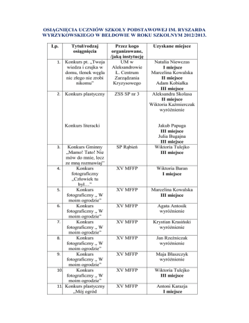 OSIĄGNIĘCIA UCZNIÓW SZKOŁY PODSTAWOWEJ IM. RYSZARDA WYRZYKOWSKIEGO W BEŁDOWIE W ROKU SZKOLNYM 2012/2013. Lp. Tytuł/rodzaj osiągnięcia 1. Konkurs pt. „Twoja wiedza i czujka w domu, tlenek węgla nic złego nie zrobi nikomu” 2. Konkurs plastyczny Przez kogo organizowane, /jaką instytucję UM w Aleksandrowie Ł. Centrum Zarządzania Kryzysowego ZSS SP nr 3 Konkurs literacki 3. 4. 5. 6. 7. 8. 9. 10. 11. Konkurs Gminny „Mamo! Tato! Nie mów do mnie, lecz ze mną rozmawiaj” Konkurs fotograficzny „Człowiek tu był…” Konkurs fotograficzny „ W moim ogrodzie” Konkurs fotograficzny „ W moim ogrodzie” Konkurs fotograficzny „ W moim ogrodzie” Konkurs fotograficzny „ W moim ogrodzie” Konkurs fotograficzny „ W moim ogrodzie” Konkurs fotograficzny „ W moim ogrodzie” Konkurs plastyczny „Mój ogród SP Rąbień Uzyskane miejsce Natalia Niewczas I miejsce Marcelina Kowalska II miejsce Adam Kobiałka III miejsce Aleksandra Skolasa II miejsce Wiktoria Kaźmierczak wyróżnienie Jakub Papuga III miejsce Julia Bugajna III miejsce Wiktoria Tulejko III miejsce XV MFFP Wiktoria Baran I miejsce XV MFFP Marcelina Kowalska III miejsce XV MFFP Agata Antosik wyróżnienie XV MFFP Krystian Krasiński wyróżnienie XV MFFP Jan Rzeźniczak wyróżnienie XV MFFP Maja Błaszczyk wyróżnienie XV MFFP Wiktoria Tulejko III miejsce XV MFFP Antoni Karazja I miejsce 12. 13. 14. 15. 16. 17. 18. 19. 20. 21. 22. rzeczywisty – mój ogród wymarzony” Konkurs plastyczny „Mój ogród rzeczywisty – mój ogród wymarzony” Konkurs plastyczny „Mój ogród rzeczywisty – mój ogród wymarzony” Konkurs plastyczny „Mój ogród rzeczywisty – mój ogród wymarzony” Konkurs plastyczny „Mój ogród rzeczywisty – mój ogród wymarzony” Konkurs plastyczny „Mój ogród rzeczywisty – mój ogród wymarzony” Konkurs literackoplastyczny „ Potrawy z mojego ogrodu” Konkurs literackoplastyczny „ Potrawy z mojego ogrodu” Konkurs literackoplastyczny „ Potrawy z mojego ogrodu” Konkurs literackoplastyczny „ Potrawy z mojego ogrodu” Konkurs literackoplastyczny „ Potrawy z mojego ogrodu” Konkurs Filmu Przyrodniczego XV MFFP Anna Michaś II miejsce XV MFFP Krystian Kupiec III miejsce XV MFFP Maja Panek wyróżnienie XV MFFP Mateusz Kupiec wyróżnienie XV MFFP Gabriela Michalak wyróżnienie XV MFFP Agata Antosik Grand Prix XV MFFP Maria Orłowska III miejsce XV MFFP Aleksandra Skolasa Wiktoria Sikorska I miejsce XV MFFP Anna Antczak II miejsce XV MFFP Aleksandra Łepska II miejsce XV MFFP II nagroda dla grupy uczniów z kl. II i III realizującej zajęcia przyrodniczo-filmowe w ramach projektu Projekt „Przez doskonalenie i rozwijanie – do sukcesu.” 23. 24. 25. 26. 27. Potyczki drugoklasistów III Ogólnopolski konkurs plastyczny pt. ”Bezpiecznie na wsi – powiedz STOP upadkom!” Etap regionalny III Ogólnopolski konkurs plastyczny pt. ”Bezpiecznie na wsi – powiedz STOP upadkom!” Etap regionalny III Ogólnopolski konkurs plastyczny pt. ”Bezpiecznie na wsi – powiedz STOP upadkom!” Etap wojewódzki „Świerszczykowe Wierszyki” 28. XVI Turniej Wiedzy o Mieście i Gminie Aleksandrów Łódzki 29. Gminny Konkurs „Matematyka dla Smyka” 30. Gminny konkurs matematyczny dla klas VI – „Matematyczne zabawy” 31. Gminny konkurs ekologiczno przyrodniczy SP 4 Odział KRUS w Łodzi Klasa II III miejsce Marcelina Kowalska II miejsce Odział KRUS w Łodzi Aleksandra Skolasa wyróżnienie Odział KRUS w Łodzi Aleksandra Skolasa wyróżnienie MDK Aleksandrów Łódzki SP 4 Rafał Balcerek I miejsce MZS SP nr 1 Klasa II I miejsce MZS SP nr 1 III miejsce SP Ruda Bugaj II miejsce II miejsce Osiągnięcia sportowe 1. Gminne Zawody Koszykówki Dziewcząt SP SP Rąbień III miejsce 2. Gminne Zawody Koszykówki Chłopców SP SP Rąbień II miejsce 3. 4. 5. Igrzyska Młodzieży Szkolnej unihokej chłopców Igrzyska Młodzieży Szkolnej unihokej dziewcząt Gminne Turniej Piłki Nożnej ZSS SP nr3 II miejsce ZSS SP nr3 II miejsce SP Ruda Bugaj IV miejsce