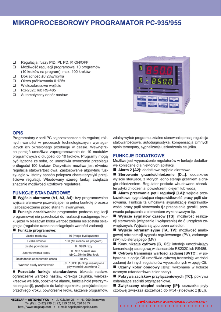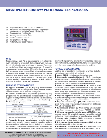 MIKROPROCESOROWY PROGRAMATOR PC-935/955 Regulacja: fuzzy PID, PI, PD, P, ON/OFF Możliwość regulacji programowej 10 programów (10 kroków na program), max. 100 kroków Dokładność ±0.2%±1cyfra Okres próbkowania 0.125s Wielozakresowe wejście RS-232C lub RS-485 Automatyczny dobór nastaw OPIS Programatory z serii PC są przeznaczone do regulacji różnych wartości w procesach technologicznych wymagających ich określonego przebiegu w czasie. Wewnętrzna pamięć umożliwia zaprogramowanie do 10 modułów programowych o długości do 10 kroków. Programy mogą być łączone ze sobą, co umożliwia stworzenie przebiegu o długości 100 kroków. Oczywiście możliwa jest również regulacja stałowartościowa. Zastosowanie algorytmu fuzzy-logic w istotny sposób polepsza charakterystyki przejściowe regulacji. Wbudowany szereg funkcji zwiększa znacznie możliwości użytkowe regulatora. FUNKCJE STANDARDOWE Wyjścia alarmowe (A1, A3, A4): trzy programowalne wyjścia alarmowe pozwalające na pełną kontrolę procesu i zabezpieczenie przed stanami awaryjnymi. Funkcja oczekiwania: programator podczas regulacji programowej nie przechodzi do realizacji następnego kroku jeżeli w bieżącym kroku wartość zadana nie została osiągnięta (regulator czeka na osiągnięcie wartości zadanej) Funkcje programowe: Liczba modułów 10 (mogą być łączone) Liczba kroków 100 (10 kroków na program) Liczba powtórzeń 0...9999 razy Zakres trwania kroku Dokładność odmierzania czasu Wartość strefy oczekiwania 0...99h 59min/ krok lub 0...99min 59s/ krok ±0,1% ±0...100°C (funkcja nieaktywna gdy wartość ustawiona 0) Pozostałe funkcje standardowe: blokada nastaw, ograniczenie wartości nastaw, korekcja czujnika, wielozakresowe wejście, opóźnienie alarmu, funkcja hold (wstrzymnie regulacji), przejście do kolejnego kroku, przejście do poprzedniego kroku, powtórzenie kroku, łączenie programów, #$$%& ' % ( ! ( & ' ! %) ' "" % ( zdalny wybór programu, zdalne sterowanie pracą, regulacja stałowartościowa, autodiagnostyka, kompensacja zimnych spoin termopary, sygnalizacja uszkodzenia czujnika. FUNKCJE DODATKOWE Możliwe jest wyposażenie regulatorów w funkcje dodatkowe konieczne dla niektórych aplikacji. Alarm 2 [A2]: dodatkowe wyjście alarmowe. Sterowanie grzanie/chłodzenie [D...]: dodatkowe wyjście sterujące, z których jedno steruje grzaniem a drugie chłodzeniem. Regulator posiada wbudowane charakterystyki chłodzenia: powietrzem, olejem lub wodą. Alarm przerwania pętli regulacji [LA]: wyjście przekaźnikowe sygnalizujące nieprawidłowość pracy pętli sterowania. Funkcja ta umożliwia sygnalizację nieprawidłowości pracy pętli sterowania tj.: przepalenie grzałki, przerwanie połączenia z elementem wykonawczym itp. Wyjście sygnałów czasów [TS]: możliwość realizacji sterowania (włączanie i wyłączanie) do 8 urządzeń zewnętrznych. Wyjścia są typu open collector. Wyjście retransmisyjne [TA, TV]: możliwość analogowej retransmisji sygnału regulowanego (PV), zadanego (SV) lub sterującego (MV) Komunikacja cyfrowa [C, C5]: interfejs umożliwiający komunikację szeregową w standardzie RS232C lub RS485. Cyfrowa transmisja wartości zadanej [SVTC]: w połączeniu z opcją C5 umożliwia cyfrową transmisję wartości zadanej do innych regulatorów wyposażonych w opcję C5. Czarny kolor obudowy [BK]: wykonanie w kolorze czarnym (standardowo kolor szary). Pokrywa zacisków przyłączeniowych [TC]: pokrywa osłaniająca zaciski przyłączeniowe. Zwiększony stopień ochrony [IP]: uszczelka płyty czołowej zwiększa szczelność do IP54 (stosować z [BL]). ZAKRES POMIAROWY Typ czujnika lub sygnału wejściowego Zakres pomiarowy [°C] Rozdzielczość [°C] -200...850 1 Pt100 -199,9...850,0 0,1 JPt100 -199,9...500,0 K -200...1370 J -200...1000 R 0...1760 B 0...1820 N 0...1300 PL-II 0...1390 S 0...1760 E 0...1000 T -199,9...400,0 0,1 C 0...2315 1 -1999...9999* 1/0,1/0,01/0,001 1 4...20mA 0...20mA 0...1V Zasilanie Do wyboru przy zamawianiu: 100...240VAC 50/60Hz (zakres zmian 85...264VAC) lub 24VAC/DC (zakres zmian 20...28VAC/DC) Pobór mocy Ok. 15VA Parametry środowiska Temperatura otoczenia: 0...50°C Wilgotność: 35...85% bez kondensacji Izolacja, wytrzymałość elektryczna Rezystancja izolacji: min 10MΩ przy 500VDC, (oprócz zacisków nieizolowanych) Wytrzymałość elektryczna: 1,5kV przez 1 min. pomiędzy parami zacisków: wejście - uziemienie, wejście - zasilanie, wyjście - uziemienie, wyjście - zasilanie i zasilanie - uziemienie Stopień ochrony IP50 Masa Ok. 500g Materiał obudowy Poliwęglan Opcje Alarm [A2] j.w. Wyjście retransmisyjne [TA, TV] Rozdzielczość: 1:10000 Dokładność: ±0,3% zakresu Rodzaj: 4...20mA [TA] lub 0...1V [TV] Wyjście sterujące grzanie/chłodzenie [D...] Do wyboru przy zamawianiu: Przekaźnikowe: 3A, 250VAC obc. rezyst. lub 1A, 250VAC obc. induk. Logiczne SSR :12VDC, max. 40mA Analogowe prądowe: 4...20mA, max. obc. 550Ω Interfejs komunikacyjny [C] i [C5] EIA RS485 lub RS232 Prędkość transmisji: 2400, 4800, 9600, 19200 Metoda komunikacji: pół-duplex, synchronizacja start-stop Format danych: 1 bit startu, 7 bitów danych, 1 bit parzystości, 1 lub 2 bity stopu Zadawanie cyfrowe [SVTC] Cyfrowa transmisja wartości zadanej do innych regulatorów wyposażonych w opcję [C5] Wyjście sygnałów czasu [TS] Wyjście typu open collector 24VDC max. 50mA, możliwość sterowania do 8 urządzeń (włączanie/wyłączanie) Alarm przerwania pętli regulacji [LA] Wyjście przekaźnikowe: 3A, 250VAC; obc. rezyst., czas zadziałania 0...200min, poziom zadziałania RTD:0,0...150,0°C, prądowe i napięciowe 0...1500 *) dowolnie skalowany w podanym przedziale DANE TECHNICZNE Funkcje standardowe Wyświetlanie Wartość mierzona (PV): 4 czerwone cyfry 14,3mm Wartość nastawy (SV)/ sygnału wyj. (MV)/czasu (TIME): 4 zielone cyfry 10mm Pamięć (MEMO): 1 żółta cyfra 8mm Wejścia Termopary: max. rezyst. wew. 100Ω RTD: lin