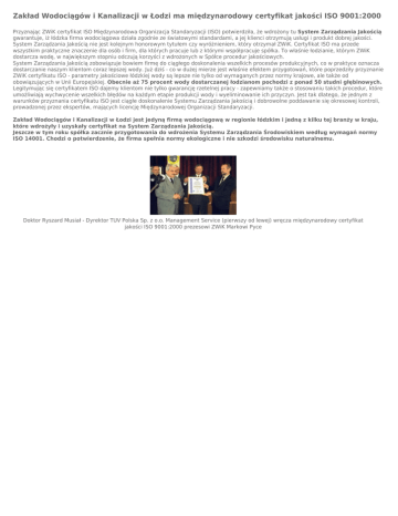 Zakład Wodociągów i Kanalizacji w Łodzi ma międzynarodowy certyfikat jakości ISO 9001:2000 Przyznając ZWiK certyfikat ISO Międzynarodowa Organizacja Standaryzacji (ISO) potwierdziła, że wdrożony tu System Zarządzania Jakością gwarantuje, iż łódzka firma wodociągowa działa zgodnie ze światowymi standardami, a jej klienci otrzymują usługi i produkt dobrej jakości. System Zarządzania Jakością nie jest kolejnym honorowym tytułem czy wyróżnieniem, który otrzymał ZWiK. Certyfikat ISO ma przede wszystkim praktyczne znaczenie dla osób i firm, dla których pracuje lub z którymi współpracuje spółka. To właśnie łodzianie, którym ZWiK dostarcza wodę, w największym stopniu odczują korzyści z wdrożonych w Spółce procedur jakościowych. System Zarządzania Jakością zobowiązuje bowiem firmę do ciągłego doskonalenia wszelkich procesów produkcyjnych, co w praktyce oznacza dostarczanie naszym klientom coraz lepszej wody. Już dziś - co w dużej mierze jest właśnie efektem przygotowań, które poprzedziły przyznanie ZWiK certyfikatu ISO - parametry jakościowe łódzkiej wody są lepsze nie tylko od wymaganych przez normy krajowe, ale także od obowiązujących w Unii Europejskiej. Obecnie aż 75 procent wody dostarczanej łodzianom pochodzi z ponad 50 studni głębinowych. Legitymując się certyfikatem ISO dajemy klientom nie tylko gwarancję rzetelnej pracy - zapewniamy także o stosowaniu takich procedur, które umożliwiają wychwycenie wszelkich błędów na każdym etapie produkcji wody i wyeliminowanie ich przyczyn. Jest tak dlatego, że jednym z warunków przyznania certyfikatu ISO jest ciągłe doskonalenie Systemu Zarządzania Jakością i dobrowolne poddawanie się okresowej kontroli, prowadzonej przez ekspertów, mających licencję Międzynarodowej Organizacji Standaryzacji. Zakład Wodociągów i Kanalizacji w Łodzi jest jedyną firmą wodociągową w regionie łódzkim i jedną z kilku tej branży w kraju, które wdrożyły i uzyskały certyfikat na System Zarządzania Jakością. Jeszcze w tym roku spółka zacznie przygotowania do wdrożenia Systemu Zarządzania Środowiskiem według wymagań normy ISO 14001. Chodzi o potwierdzenie, że firma spełnia normy ekologiczne i nie szkodzi środowisku naturalnemu. Doktor Ryszard Musiał - Dyrektor TUV Polska Sp. z o.o. Management Service (pierwszy od lewej) wręcza międzynarodowy certyfikat jakości ISO 9001:2000 prezesowi ZWiK Markowi Pyce