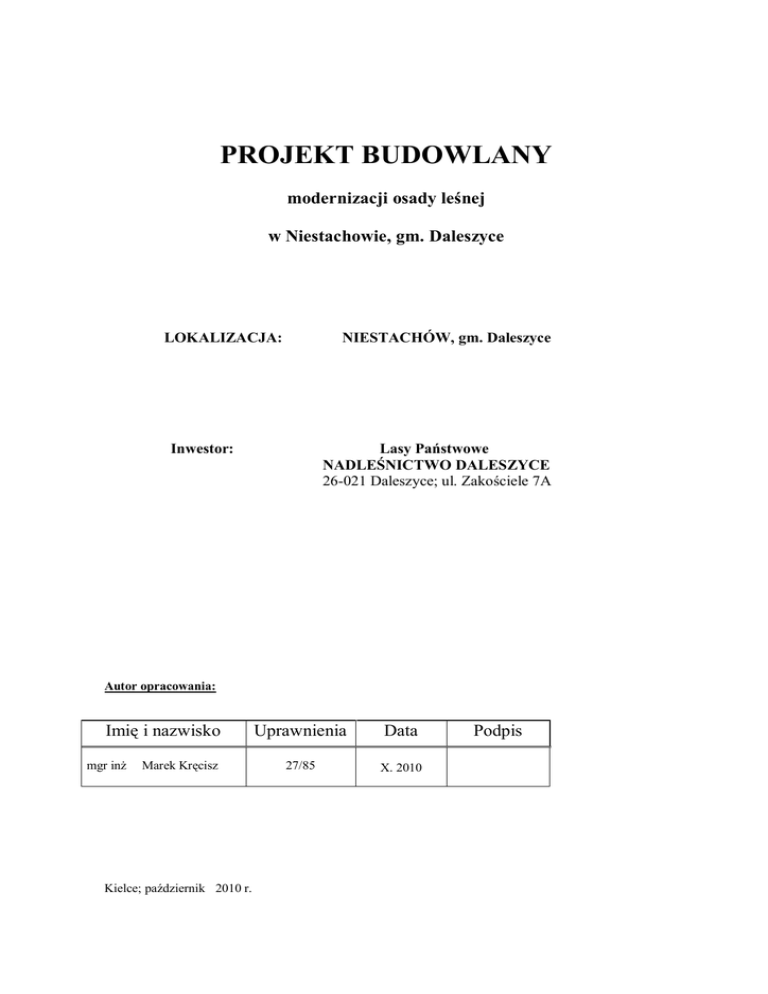 PROJEKT BUDOWLANY modernizacji osady leśnej w Niestachowie, gm. Daleszyce LOKALIZACJA: NIESTACHÓW, gm. Daleszyce Inwestor: Lasy Państwowe NADLEŚNICTWO DALESZYCE 26-021 Daleszyce; ul. Zakościele 7A Autor opracowania: Imię i nazwisko mgr inż Marek Kręcisz Kielce; październik 2010 r. Uprawnienia Data 27/85 X. 2010 Podpis ZAWARTOŚĆ PROJEKTU: 1. Opis techniczny 2. Część rysunkowa: a) rzut parteru - inwentaryzacja b) rzut parteru - projekt c) schemat stolarki drzwiowej - rys.1. - rys.2. - rys.3. 3. Projekt instalacji c.o. 4. Informacja BiOZ. 5. Specyfikacja techniczna wykonania i odbioru robót. 6. Przedmiar robót. OPIS TECHNICZNY do projektu modernizacji osady leśnej w Niestachowie, gm. Daleszyce 1. INWESTOR I UŻYTKOWNIK. Lasy Państwowe NADLEŚNICTWO DALESZYCE 26-021 Daleszyce; ul. Zakościele 7A 2. ADRES INWESTYCJI Niestachów, gm. Daleszyce 3. PODSTAWA OPRACOWANIA Podstawę opracowania stanowią : 4. - zlecenie inwestora, - obowiązujące przepisy i normy. - wizja lokalna na terenie oraz oględziny budynku wraz z inwentaryzacją oraz dokonaniem niezbędnych pomiarów. PRZEDMIOT OPRACOWANIA. Przedmiotem opracowania jest projekt budowlany „Modernizacji pomieszczeń parteru oraz wymiana instalacji c.o. w budynku mieszkalnym z częścią kancelaryjną osady leśnej w miejscowości Niestachów, gm. Daleszyce" Zakres remontu obejmuje następujące prace: - demontaż obicia ścian z boazerii, demontaż istniejących drzwi wewnętrznych i zewnętrznych parteru, wymiana stolarki drzwiowej zewnętrznej, demontaż istniejących posadzek z desek wraz z legarami i ociepleniem, skucie posadzek z terakoty i glazury na ścianach w kuchni i w łazience wymiana stolarki drzwiowej wewnętrznej, wykonanie wylewek pod posadzki z zaprawy samopoziomującej z ułożeniem izolacji termicznej ze styropianu gr. 7 cm, wymiana wanny, umywalki i muszli klozetowej, wykonanie posadzek z paneli podłogowych, wykonanie posadzki z płytek gresowych szkliwionych w kuchni, łazience i korytarzu, ułożenie glazury na ścianach w kuchni do wys. 1,60 m i w łazience na całą wysokość, wykonanie gładzi gipsowych na ścianach i sufitach, wyczyszczenie i pomalowanie parapetów wewnętrznych, - malowanie ścian i sufitów farbami lateksowymi, - wymiana całej instalacji c.o. - sprawdzenie i ewentualne udrożnienie przewodów wentylacyjnych i spalinowego 5. ISTNIEJĄCY STAN POMIESZCZEŃ PARTERU. Posadzki: - deski na legarach: kuchnia, pokoje, kancelaria, korytarz (1.7) - terakota: łazienka, przedsionek (1.8) Sufity: - boazeria: pokoje, kancelaria, korytarze. - malowanie emulsyjne: kuchnia, łazienka. Ściany: - boazeria: korytarz (1.7), częściowo korytarz (1.8), kancelaria - glazura: kuchnia - na ścianie przeciwległej do drzwi 0,75m wysokości, łazienka – cała do wysokości 1,60 m. - malowanie emulsyjne – pozostałe ściany. Stolarka drzwiowa – drzwi płytowe, ościeżnice stalowe. Wyżej wymienione elementy wykazują znaczny stopień zużycia, rzedmiotowa działka położona jest w miejscowości Niestachów gmina Daleszyce i zabudowana jest budynkiem leśniczówki (mieszkalnym) oraz budynkiem gospodarczym. Dojazd i dojścia do budynków nieutwardzone. Teren ogrodzony ogrodzeniem drewnianym na słupkach stalowych i cokole betonowym grubości 20 cm. 6. UZBROJENIE BUDYNKU. Budynek wyposażony jest w następujące instalacje: elektryczną, wodociągową, kanalizacyjną, centralnego ogrzewania z kotłownią w piwnicy. Odprowadzenie ścieków do szczelnego zbiornika ścieków. 7. DANE INFORMACYJNE O DZIAŁCE. Administratorem działki oraz budynku jest Nadleśnictwo Daleszyce . Rozpatrywany obiekt nie jest objęty wpisem do rejestru zabytków. 8. OPIS BUDYNKU. Budynek leśniczówki: budynek jednokondygnacyjny z poddaszem użytkowym i podpiwniczeniem. Budynek o konstrukcji tradycyjnej murowanej, ze ścianami zewnętrznymi murowanymi z pustaków ceramicznych, przykryty dachem dwuspadowym o konstrukcji drewnianej i pokryty blachą dachówkopodobną. 9. WARUNKI LOKALIZACYJNE. Budynek zlokalizowano na działce z zapewnionym dojazdem i przyłączem Elektroenergetycznym oraz przyłączem wodociągowym ze studni. Budynek wyposażony jest w następujące instalacje: - wodno-kanalizacyjną - centralnego ogrzewani - elektryczną światła i siły, - odgromową,. 10. OPIS ROBÓT PODSTAWOWYCH. W budynku przewiduje się remont pomieszczeń parteru oraz wymianę instalacji c.o. W ramach remontu należy zdemontować wszystkie boazerie, posadzki z desek wraz z legarami i ociepleniem, skuć glazurę i posadzki z terakoty. Na płycie stropowej należy ułożyć izolację z folii oraz styropianu grubości 7 cm i wykonać wylewkę grubości 5 cm. Na ścianach i sufitach należy wykonać gładź gipsową. W kuchni i łazience należy ułożyć glazurę zgodnie z opisem na rys. nr 2. Pozostałe ściany oraz sufity pomalować farbami lateksowymi w kolorach uzgodnionych z Inwestorem. Posadzki zgodnie z rysunkiem nr 2. Panele podłogowe klasy AC4. Wzór paneli, glazury i płytek gresowych należy uzgodnić z Inwestorem. Przewiduje się wymianę wszystkich drzwi wewnętrznych w poziomie parteru na drzwi płytowe z ościeżnicami drewnopodobnymi np. „PORTA” oraz drzwi zewnętrznych zgodnie z zestawieniem stolarki. Projektuje się również wymianę całej instalacji centralnego ogrzewania zgodnie z projektem instalacyjnym Opracował: