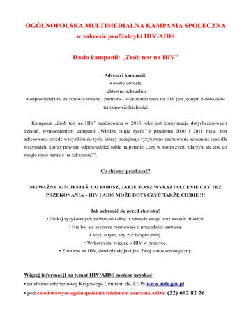 OGÓLNOPOLSKA MULTIMEDIALNA KAMPANIA SPOŁECZNA w zakresie profilaktyki HIV/AIDS Hasło kampanii: „Zrób test na HIV” Adresaci kampanii: • osoby dorosłe • aktywne seksualnie • odpowiedzialne za zdrowie własne i partnera – wykonanie testu na HIV jest jednym z dowodów tej odpowiedzialności Kampania „Zrób test na HIV” realizowana w 2013 roku jest kontynuacją dotychczasowych działań, wzmocnieniem kampanii „Wiedza ratuje życie” z przełomu 2010 i 2011 roku. Jest adresowana przede wszystkim do tych, którzy podejmują ryzykowne zachowania seksualne oraz dla wszystkich, którzy powinni odpowiedzieć sobie na pytanie: „czy w moim życiu zdarzyło się coś, co mogło mnie narazić na zakażenie?”. Co chcemy przekazać? NIEWAŻNE KIM JESTEŚ, CO ROBISZ, JAKIE MASZ WYKSZTAŁCENIE CZY TEŻ PRZEKONANIA – HIV I AIDS MOŻE DOTYCZYĆ TAKŻE CIEBIE !!! Jak uchronić się przed chorobą? • Unikaj ryzykownych zachowań i dbaj o zdrowie swoje oraz swoich bliskich. • Nie bój się szczerze rozmawiać o przeszłości partnera. • Myśl o tym, aby żyć bezpieczniej. • Wykorzystaj wiedzę o HIV w praktyce. • Zrób test na HIV, dowiedz się jaki jest Twój status serologiczny. Więcej informacji na temat HIV/AIDS możesz uzyskać: • na stronie internetowej Krajowego Centrum ds. AIDS www.aids.gov.pl • pod całodobowym ogólnopolskim telefonem zaufania AIDS: (22) 692 82 26