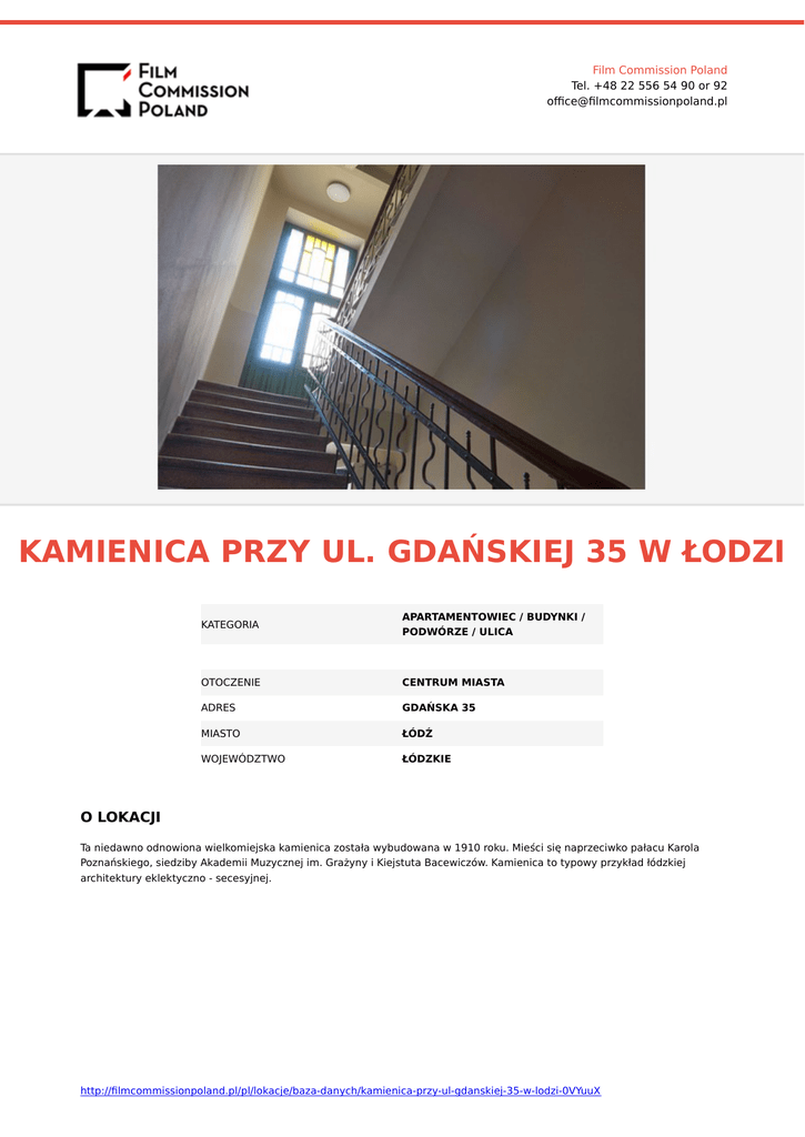 Film Commission Poland Tel. +48 22 556 54 90 or 92 office@filmcommissionpoland.pl KAMIENICA PRZY UL. GDAŃSKIEJ 35 W ŁODZI KATEGORIA APARTAMENTOWIEC / BUDYNKI / PODWÓRZE / ULICA OTOCZENIE CENTRUM MIASTA ADRES GDAŃSKA 35 MIASTO ŁÓDŹ WOJEWÓDZTWO ŁÓDZKIE O LOKACJI Ta niedawno odnowiona wielkomiejska kamienica została wybudowana w 1910 roku. Mieści się naprzeciwko pałacu Karola Poznańskiego, siedziby Akademii Muzycznej im. Grażyny i Kiejstuta Bacewiczów. Kamienica to typowy przykład łódzkiej architektury eklektyczno - secesyjnej. http://filmcommissionpoland.pl/pl/lokacje/baza-danych/kamienica-przy-ul-gdanskiej-35-w-lodzi-0VYuuX