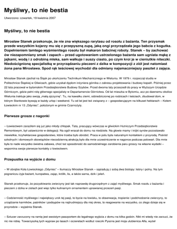 Myśliwy, to nie bestia Utworzono: czwartek, 19 kwietnia 2007 Myśliwy, to nie bestia Mirosław Stanek przekonuje, że nie zna większego rarytasu od rosołu z bażanta. Ten przysmak przede wszystkim kojarzy mu się z przepyszną zupą, jaką ongi przyrządzała jego babcia z kogutka. Dopełnieniem tamtego wyśmienitego rosołu był makaron babcinej roboty. Stanek – by zachować ów niezapomniany smak i zapach – przed ugotowaniem ustrzelonego bażanta sam ugniata mąkę z jajkami, wodą i z odrobiną mleka, sam wałkuje i suszy ciasto, po czym kroi je w cieniutkie niteczki. Niedoścignioną specjalistką w przyrządzaniu pieczeni z dzika w kompozycji z ziół jest natomiast żona pana Mirosława. Spod rąk teściowej wychodzi dla odmiany najsmaczniejszy pasztet z zająca. Mirosław Stanek zjechał na Śląsk po ukończeniu Technikum Mechanicznego w Wieluniu. W 1979 r. rozpoczął studia w Politechnice Śląskiej w Gliwicach, gdzie uzyskał dyplom inżyniera górnika z zakresu projektowania i budowy kopalń. Później przez 22 lata pracował w bytomskim Przedsiębiorstwie Budowy Szybów. Przed dwoma laty przeszedł do pracy w Wyższym Urzędzie Górniczym, gdzie pełni rolę głównego specjalisty w Departamencie Górnictwa. Od lat mieszka w Bytomiu, acz po dawnemu okolice Wielunia traktuje jako swoją „małą ojczyznę”. Tu, na kawałku ziemi, odziedziczonej po rodzicach i teściach, zbudował dom, w którym Stankowie bywają w każdy urlop i weekend. Tu od lat jest też związany z – gospodarującym na kilkuset hektarach – Kołem Łowieckim nr 13 „Odyniec”, położonym w gminie Czarnożyły. Pierwsze grosze z nagonki – Łowiectwem zaraziłem się już jako młody chłopak. Tata, pracujący wówczas w gliwickim Hutniczym Przedsiębiorstwie Remontowym, był ustawicznie w delegacji. Na ogół wracał do domu na niedziele. Na głowie mamy i trójki synów pozostawało niewielkie, trzyhektarowe gospodarstwo, które trzeba było obrobić. Praca w polu była naturalnym kontaktem z przyrodą. Pośród szkolnych i domowych obowiązków niecodzienną atrakcją było dla mnie uczestniczenie w nagonce podczas polowań. Dla mnie była to nade wszystko świetna zabawa, choć też sposobność do samodzielnego zarobienia paru groszy na własne wydatki – wspomina swoje pierwsze kontakty z łowiectwem. Przepustka na wyjście z domu – W obrębie Koła Łowieckiego „Odyniec” – tłumaczy Mirosław Stanek – sąsiadują z sobą dwa biotopy: leśny i polny. Na tym pograniczu żyje bażant, kuropatwa, zając, królik, lis, a także sarna, dzik i jeleń. Stanek przekonuje, że pozyskiwanie zwierzyny jest tak naprawdę drugorzędnym z zajęć myśliwego. Smak rosołu z bażanta i pieczeni z dzika w ziołach jest więc tylko kulinarnym ornamentem uprawianej przezeń pasji. – Codzienność myśliwego i największy urok tej pasji, to bycie na łowisku, to obserwacja, tropienie i podchodzenie zwierzyny, to urządzanie karmików, paśników i podsypów na najtrudniejszy dla niej okres, to reagowanie na wszystko, co złego dzieje się w przyrodzie – wyjaśnia Stanek. – Sztucer zarzucony na ramię jest swoistym paszportem do legalnego wyjścia z domu na kilka godzin. Nikt mi wtedy nie zarzuci, że nic nie robię. Towarzyszką tych wypraw po lasach i oczeretach wzdłuż rzeczki Pyszna jest moja ulubienica Alfa, wyżeł szorstkowłosy. Stanowimy harmonijny duet. Ja wracam fizycznie zmęczony, ale psychicznie wypoczęty, zaś Alfa – wybiegana – dodaje myśliwy. Odwieczny porządek W przyrodzie – jak wynika z tych obserwacji – panuje zdumiewający porządek rzeczy. – Z zegarkiem w ręku, niemal co do minuty, można określić, kiedy o świcie zaczynają się budzić konkretne gatunki ptaków. W porannym koncercie świergolenia, śpiewania, gwizdania i pohukiwania raptem – niczym uciąć – cichną jedne głosy, a po nich pobrzmiewają „melodie” kolejnych gatunków ptaków. Podobnie ze zwierzyną. Wiadomo, że z rana pierwszy wyjdzie zając, po nim sarna, a po niej lis... Taki sam porządek widać o zmierzchu: ostatnie wyjdą na żer dziki i jelenie – opowiada Mirosław Stanek. Oczywiście, nieodłącznym elementem myślistwa jest samo polowanie. – Uwielbiam to na drobną zwierzynę, zwłaszcza na bażanty – wyznaje Mirosław Stanek. Ale nie mniej ważnym od przyniesionego do domu bażanta jest także koloryt polowań, tradycje i osobliwości łowieckiego światka. Stanek sypie wieloma opowieściami o takich niecodziennych przygodach. – Koniec polowania. Z przyjaciółmi siedzimy przy ognisku, nad którym jest zawieszony kociołek. W środku pyrka pieczonka, kusząc wonią prawie gotowego już posiłku. Raptem Alfa robi stójkę, sygnalizując, że opodal jest bażant. Klepnąłem się w kolano – to taki nasz szyfr porozumiewania się z psem – i uprzedzam kolegę, że tuż-tuż jest bażant. Był. Siedział 3 metry od ogniska i nie miał odwagi się zerwać. Kolega przyszykował broń, ale – choć kogut wyfrunął – nie strzelił. „Wiesz, był taki fajny, że mi go było szkoda” – odpowiedział na moje pytanie, dlaczego nie pociągnął za spust. Stanek wspomina też spotkanie z jeleniem: – Zmierzch. Stoję na ambonie na skraju lasu. Kompletna cisza. Wokół rozpościera się welon mgły. Raptem wiatr przegonił tuman i oto naprzeciw mnie, w odległości mniej więcej 8-10 metrów, stoi piękny jeleń. Nie potrafię wyjaśnić, skąd się wziął. Ot, zajrzeliśmy sobie w oczy, po czym każdy poszedł w swoją stronę – wraca do jeszcze jednego z niezwykłych zdarzeń na łowisku. Mirosław Stanek odżegnuje się przy tym od spojrzenia na myślistwo jako na „krwiożerczą”, snobistyczną fanaberię. – Wśród moich kolegów w łowiectwie są ludzie rozmaitych profesji: leśnicy, zawodowi kierowcy, biznesmeni, lekarze, aktorzy... Zapewniam, że większość z nich obcowanie z przyrodą przedkłada nad strzelanie do zwierzyny – argumentuje.