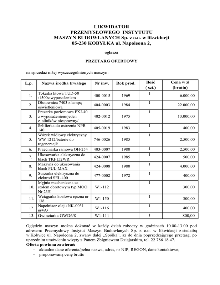 LIKWIDATOR PRZEMYSŁOWEGO INSTYTUTU MASZYN BUDOWLANYCH Sp. z o.o. w likwidacji 05-230 KOBYŁKA ul. Napoleona 2, ogłasza PRZETARG OFERTOWY na sprzedaż niżej wyszczególnionych maszyn: L.p. 1. 2. 3. 4. 5. 6. 7. 8. 9. 10. 11. 12. 13. Nazwa środka trwałego Tokarka kłowa TUD-50 /1500z wyposażeniem Dłutownica 7403 z lampą oświetleniową Frezarka poziomowa FXJ-40 z wyposażeniem/jeden z silników niesprawny/ Szlifierka do ostrzenia NPB 140 Wózek widłowy elektryczny WW 1212/baterie do regeneracji/ Przecinarka ramowa OH-254 Ukosowarka elektryczna do blach TKF152WR Maszyna do ukosowania blach PUL-MAX Suszarka elektryczna do elektrod SEL 400 Myjnia mechaniczna ze stołem obrotowym typ MOO Nr 2351 Wciągarka kozłowa ręczna nr 138 Napełniacz oleju NK-0031 nr493 Gwinciarka GWD6/8 Nr inw. Rok prod. 400-0015 1969 404-0003 1984 402-0012 1975 405-0019 1983 746-0026 1985 403-0007 1980 424-0007 1985 424-0008 1980 477-0002 1972 Ilość ( szt.) 1 1 Cena w zł (brutto) 6.000,00 22.000,00 1 13.000,00 1 400,00 1 2.500,00 1 1 1 1 2.500,00 500,00 4.000,00 400,00 1 W1-112 W1-150 W1-116 W1-111 300,00 1 1 1 300,00 400,00 800,00 Oględzin maszyn można dokonać w każdy dzień roboczy w godzinach 10.00-13.00 pod adresem: Przemysłowy Instytut Maszyn Budowlanych Sp. z o.o. w likwidacji z siedzibą w Kobyłce ul. Napoleona 2, zwany dalej „Spółką”, aż do dnia poprzedzającego przetarg, po uprzednim umówieniu wizyty z Panem Zbigniewem Dziejarskim, tel. 22 786 18 47. Oferta powinna zawierać: aktualne dane oferenta/pełna nazwa, adres, nr NIP, REGON, dane kontaktowe; proponowaną cenę brutto oświadczenie oferenta o zapoznaniu się z przedmiotem przetargu, potwierdzenie wpłaty wadium. Oferty należy składać w siedzibie Spółki, Sekretariat Likwidatora do dnia 28.07.2016 r. do godz. 10.00 z dopiskiem „Zakup maszyn” Otwarcie ofert nastąpi w dniu 28.07.2016 r. o godz. 11.00 w siedzibie Spółki w Kobyłce przy ul. Napoleona 2, sala konferencyjna I piętro. Warunkiem uczestnictwa w przetargu jest wpłacenie wadium w wysokości 10% ceny wywoławczej na konto Nr 38 1240 6074 1111 0000 4999 2487 BANK PEKAO S.A. O/WOŁOMIN w terminie do dnia 27.07.2016 r. Jako termin wpłaty przyjmuje się datę wpływu gotówki na konto Spółki. Wadium przepada na rzecz Spółki, jeżeli żaden z uczestników przetargu nie zaoferuje ceny wywoławczej lub w przypadku, jeżeli Nabywca, który wygrał przetarg, uchyli się od uregulowania należności i odbioru przedmiotu przetargu. Wadium wpłacone przez Oferentów, których oferty nie zostały przyjęte, zostanie zwrócone niezwłocznie po dokonaniu wyboru oferty. Wadium wpłacone przez Nabywcę zostanie zarachowane na poczet ceny nabycia. Wygrywa oferent, który zaoferuje najwyższą cenę, nie niższą od ceny wywoławczej. W przypadku, gdy kilku oferentów zaoferuje tę samą cenę, Przewodniczący Komisji bezpośrednio po otwarciu ofert kontynuuje przetarg w formie licytacji ustnej. Postąpienie wynosi 100 zł. Wygrywa oferent, który wylicytuje najwyższą cenę. Demontażu i odbioru przedmiotu przetargu Nabywca dokona we własnym zakresie i na własny koszt w terminie do 7 roboczych dni od dnia rozstrzygnięcia przetargu. Likwidator Spółki zastrzega sobie prawo odwołania lub unieważnienia przetargu bez podania przyczyny.